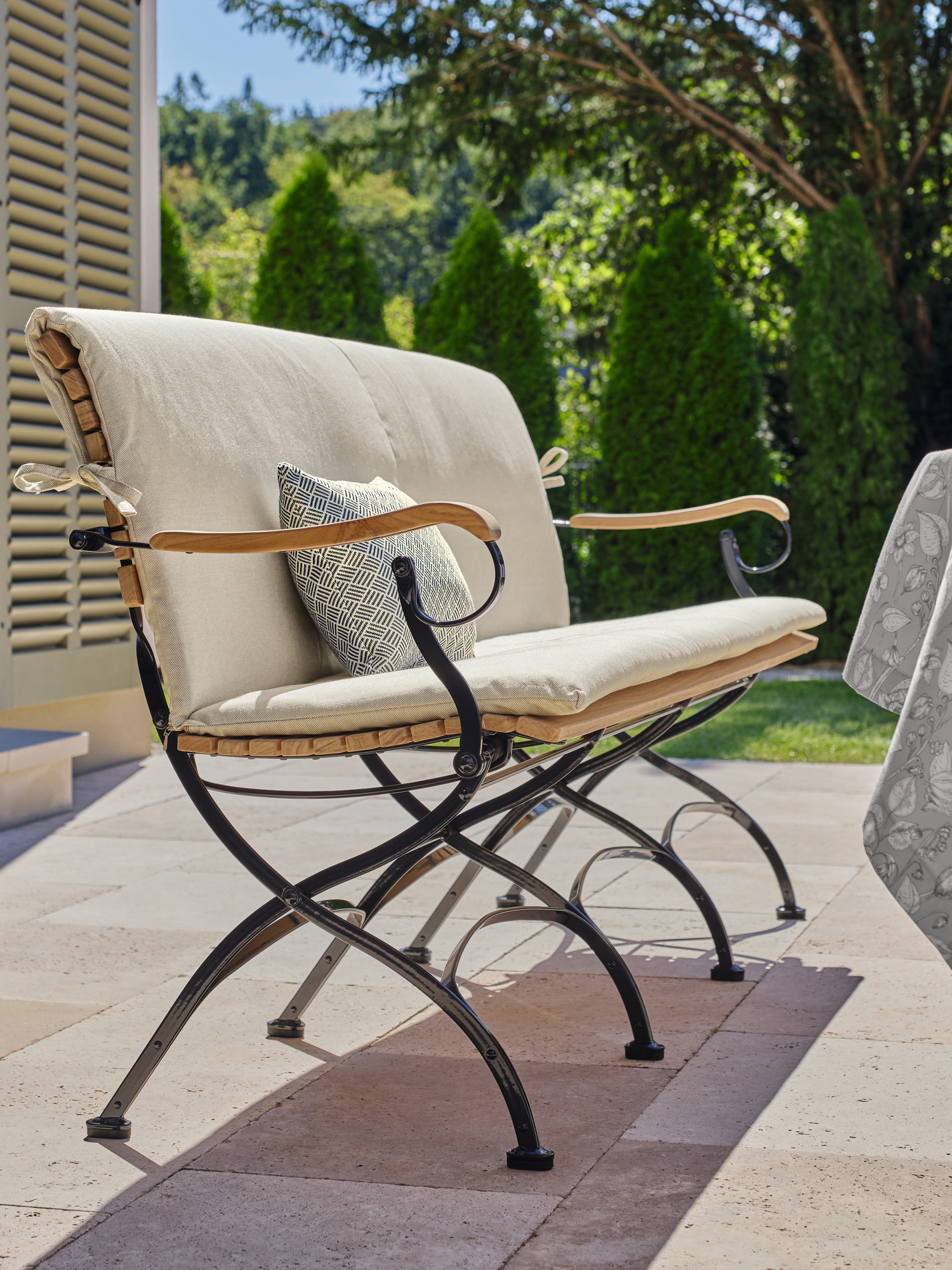 Die Rückenlehne der Bank besteht aus massiven Teakleisten, die in engem Abstand aufeinander folgen. Ihre Form ist nach einem der ungewöhnlichsten Kurvenverläufe modelliert: dem des menschlichen Rückens. Die geschwungenen Armlehnen aus Plantagenteak schmeicheln der Hand und entlasten den Körper. Die große Sitzfläche aus Teak ist dreidimensional geformt, so dass sie sich dem Körper anschmiegt. Vorn ist sie zur besseren Schenkelauflage abgerundet. Auflagen in verschiedenen Farbtönen erhöhen noch die Bequemlichkeit der Möbel und setzen feine Akzente.