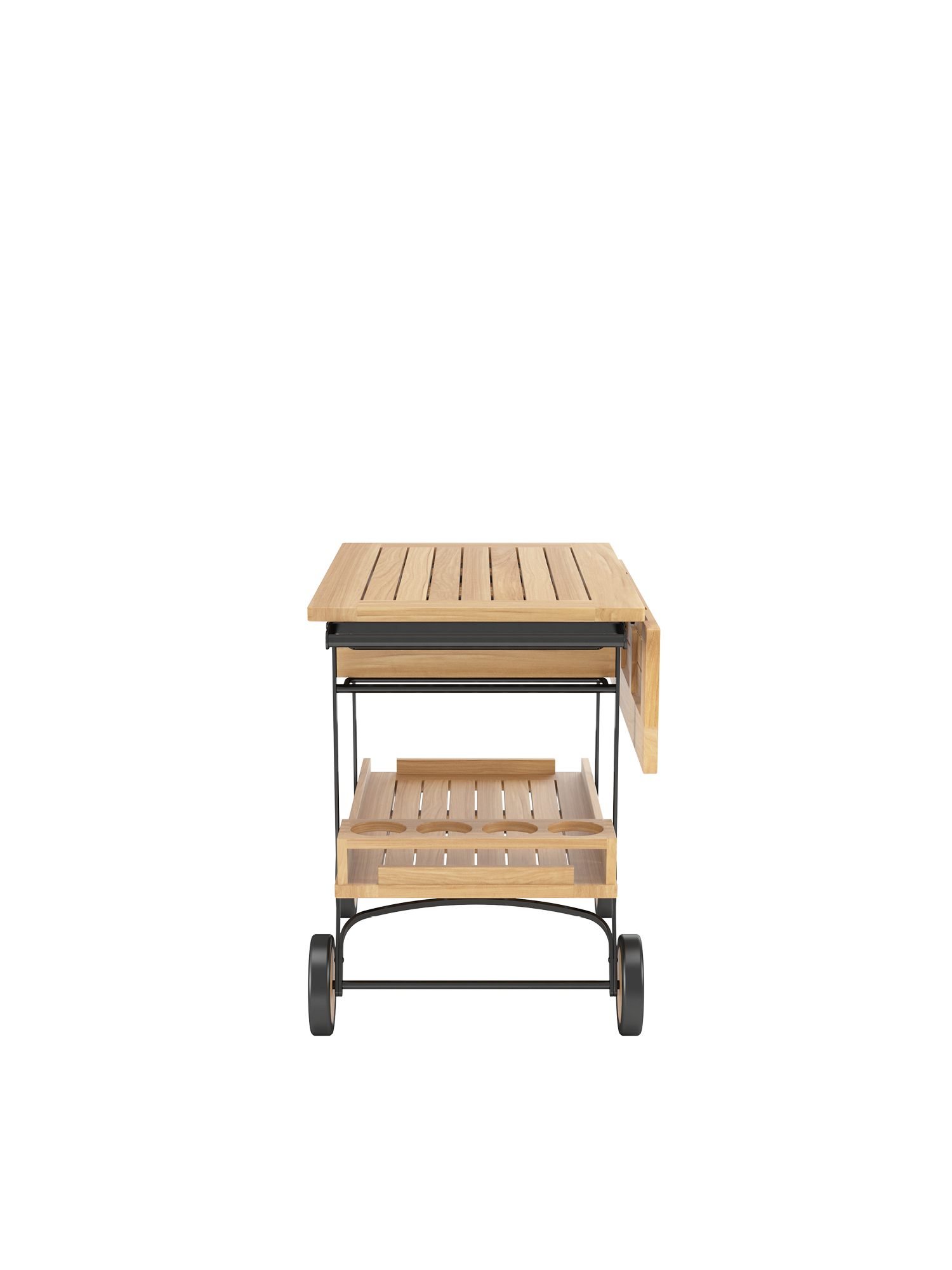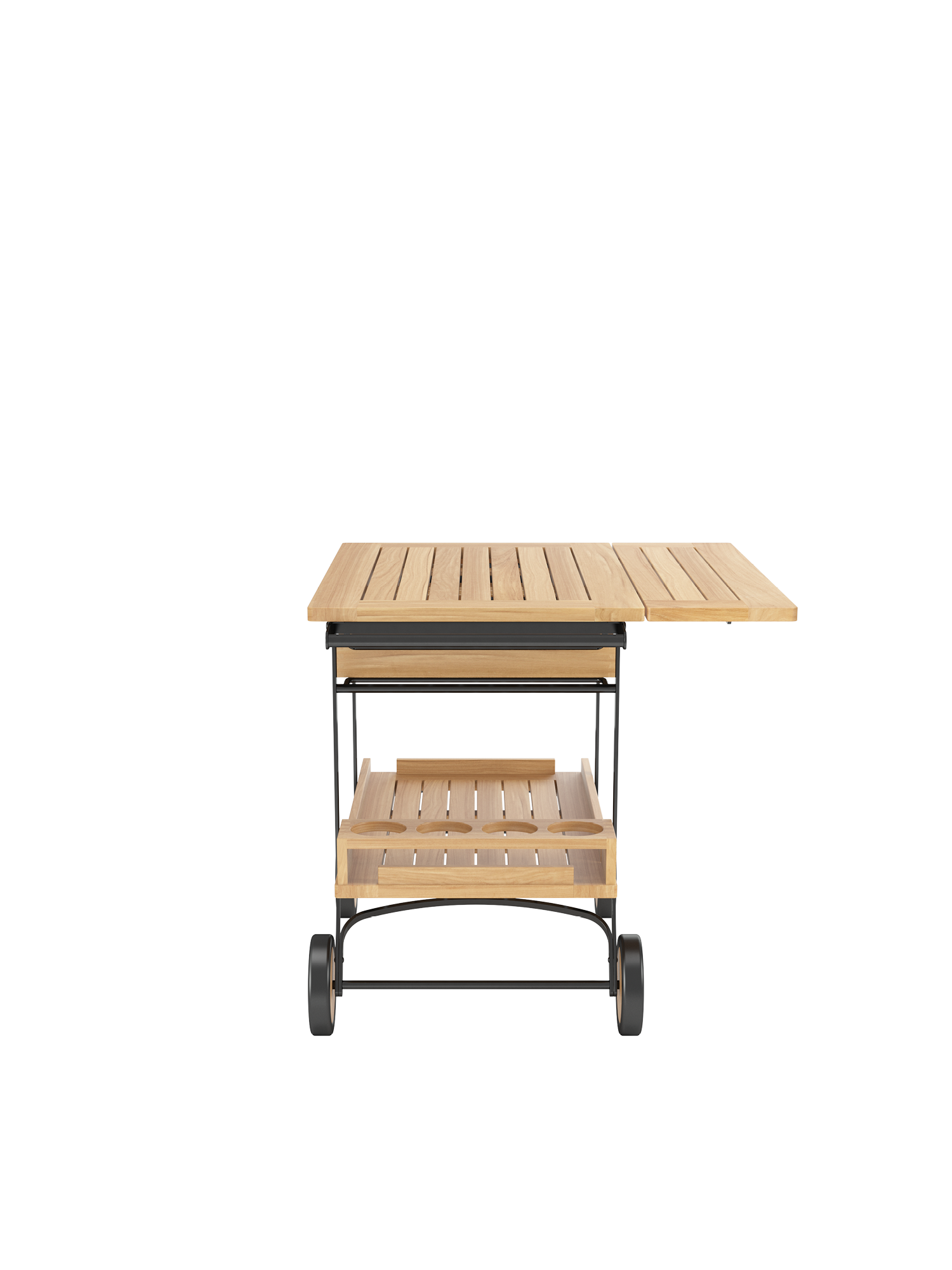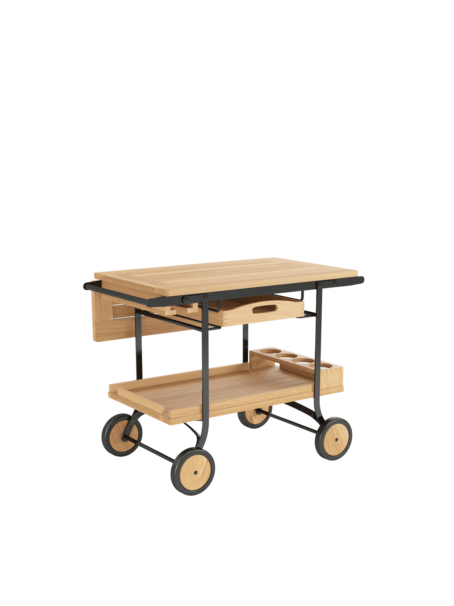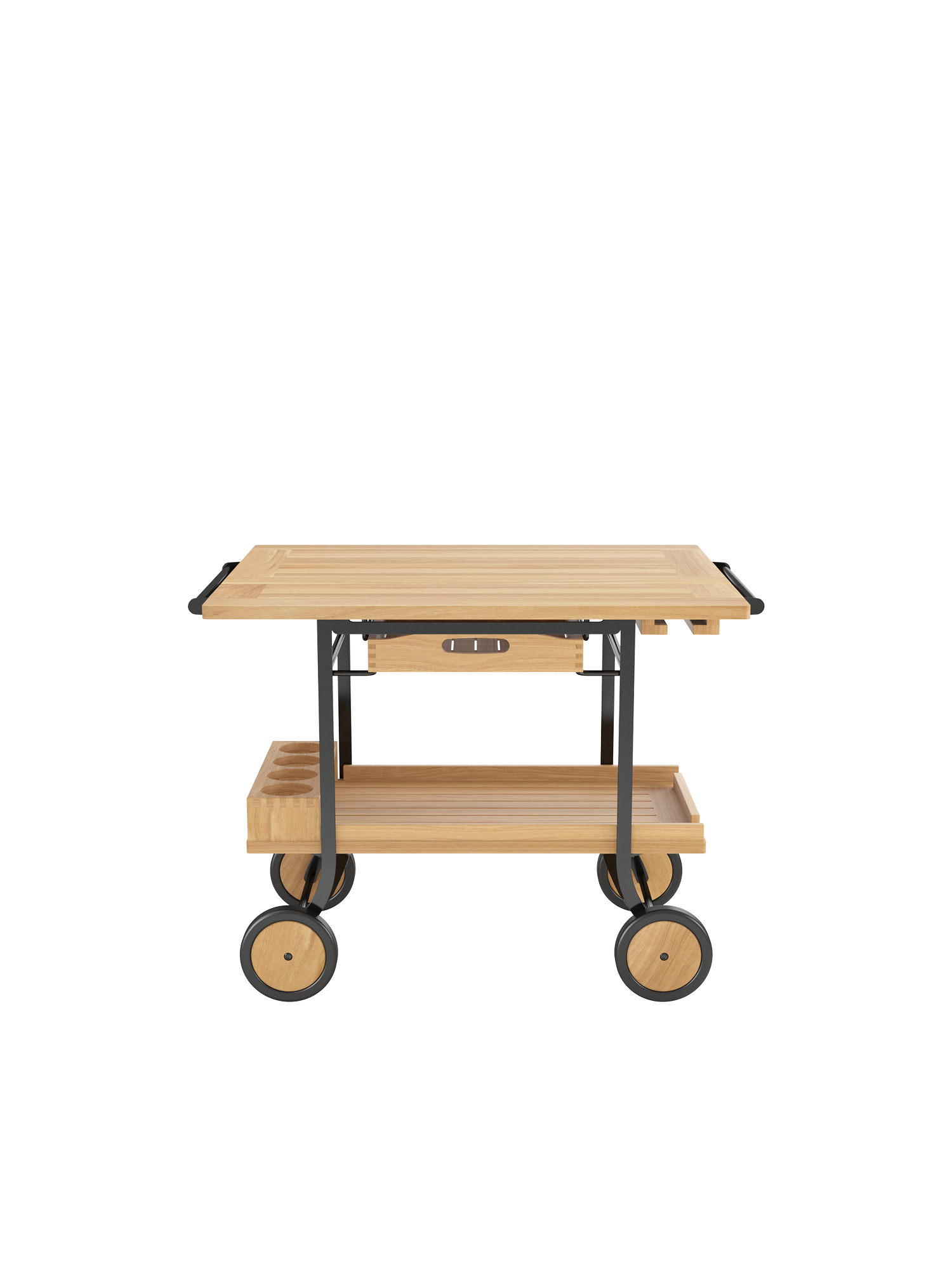 Flexibel bewirtet er große Gesellschaften und kleine Tafelrunden und sorgt angemessen für Nachschub: Der elegante Barwagen aus wetterfesten Materialien hält Getränke, Gläser und Geschirr stets griffbereit. Seine große Arbeitsfläche lässt sich mit einem abklappbaren Element noch erweitern. Eine Schublade für Servietten, Besteck und flache Utensilien lässt sich vollständig herausziehen und fungiert gleichzeitig als Tablett, das auch einzeln erhältlich ist. Flaschenhalterung, untere Ablagefläche und eine Leiste für den sicheren Transport von Gläsern bestehen ebenfalls aus Teak. Mit stabilen Griffen und vier Teakrädern mit Gummibereifung lässt sich der Barwagen sicher bewegen.