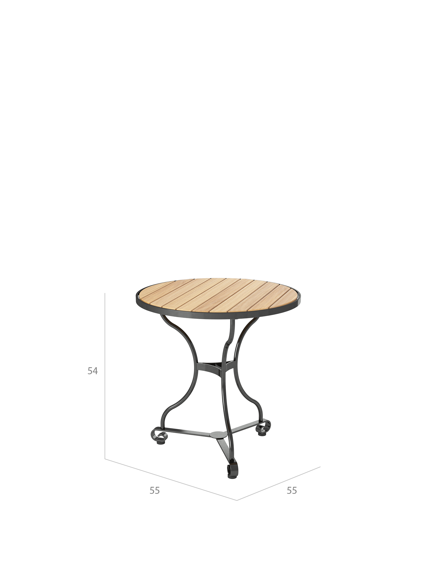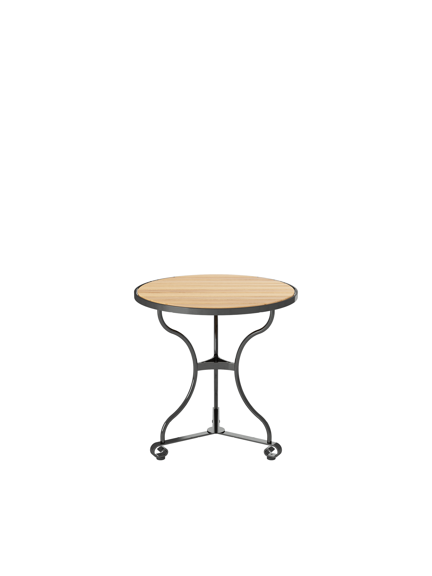 Seine Tischplatte aus Teakleisten wird von einem Stahlreif eingefasst. Das Gestell das variablen Beistelltisches besteht aus verzinktem, pulverbeschichtetem Stahl. Fußgleiter aus abriebfestem Kunststoff schützen wertvolle Böden.