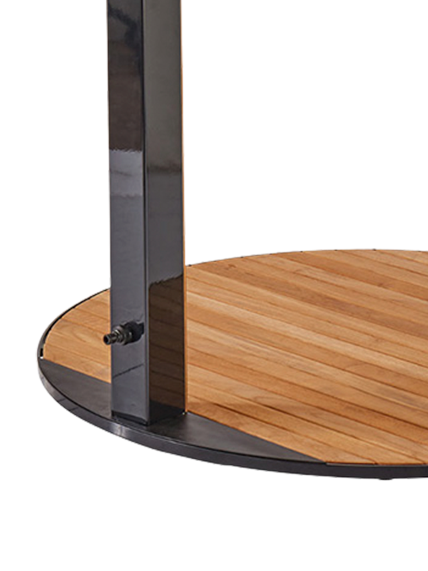 Die elegante Dusche im Stil der Fontenay Serie kombiniert klassisches Design mit neuester Technik. Ihre runde Bodenplatte aus Teak, gefasst von einem Stahlreif, sorgt für sicheren Stand. Die Duschsäule besteht aus galvanisch verzinktem, pulverbeschichtetem Stahl, der bewegliche Duschkopf mit Regenbrause ist besonders pflegeleicht.