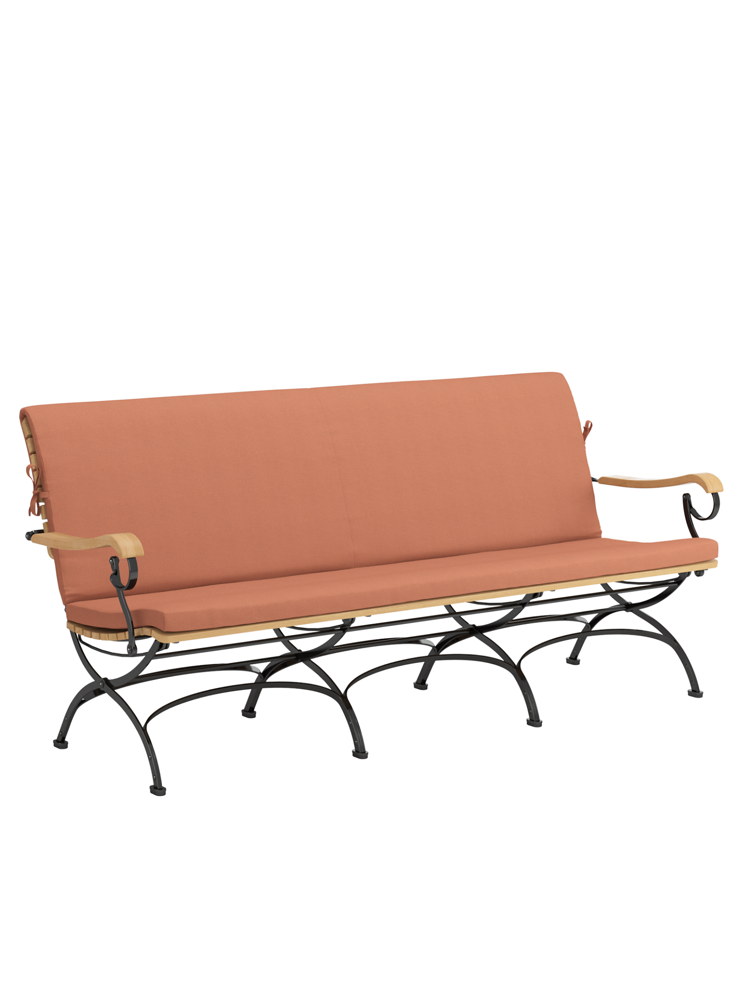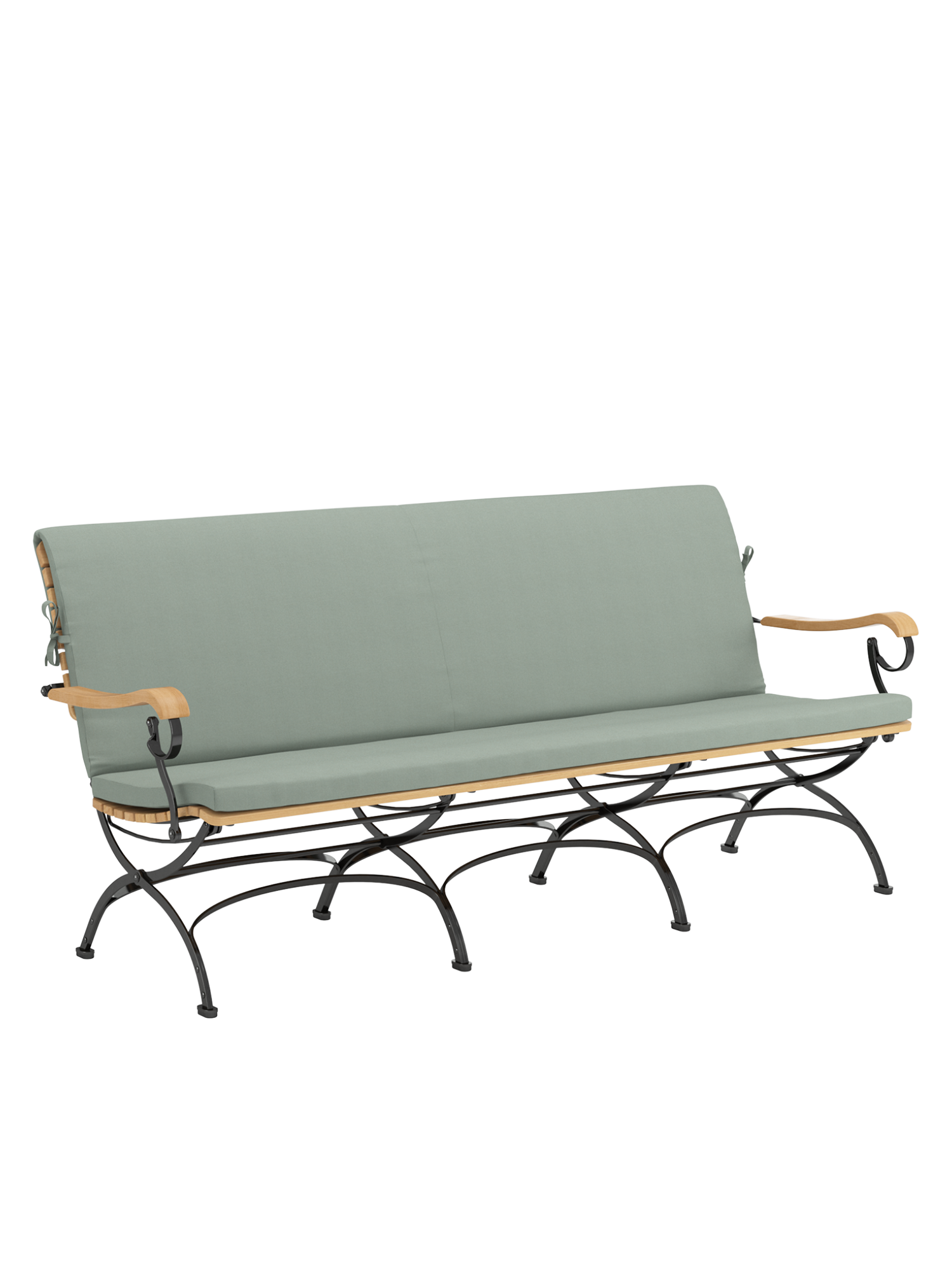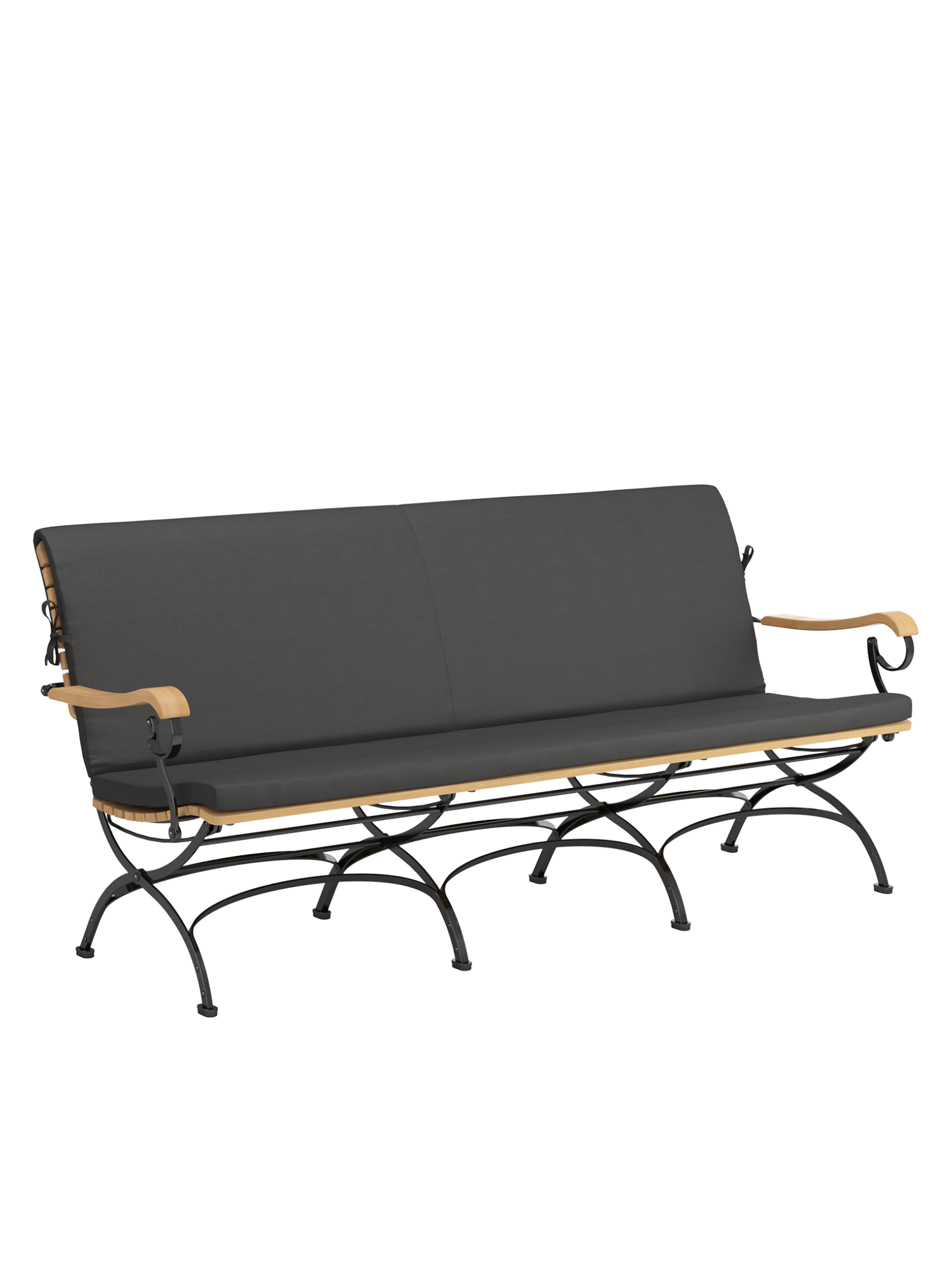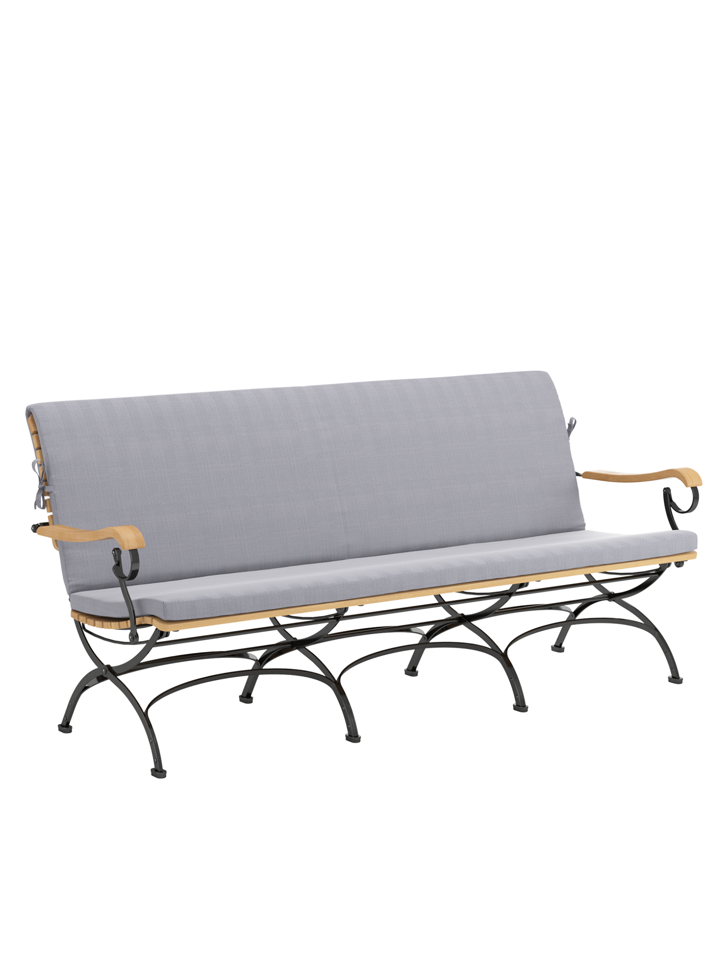 Die schöne Gartenbank aus Teakholzleisten und pulverbeschichtetem Stahl ergänzt die niedrigen Loungemöbel der klassischen Fontenay Serie. Mit ihrer breiten und tiefen Sitzfläche und gerundeten Armlehnen sorgt sie für Komfort am passenden Esstisch, macht mit ihrer markanten Silhouette aber auch als Solitär eine elegante Figur. Ihre Sitzfläche aus Teak ist dreidimensional geformt, so dass sie sich dem Körper anschmiegt. vorn ist sie zur besseren Schenkelauflage abgerundet. Auflagen in verschiedenen Farbtönen erhöhen noch die Bequemlichkeit der Möbel und setzen feine Akzente.