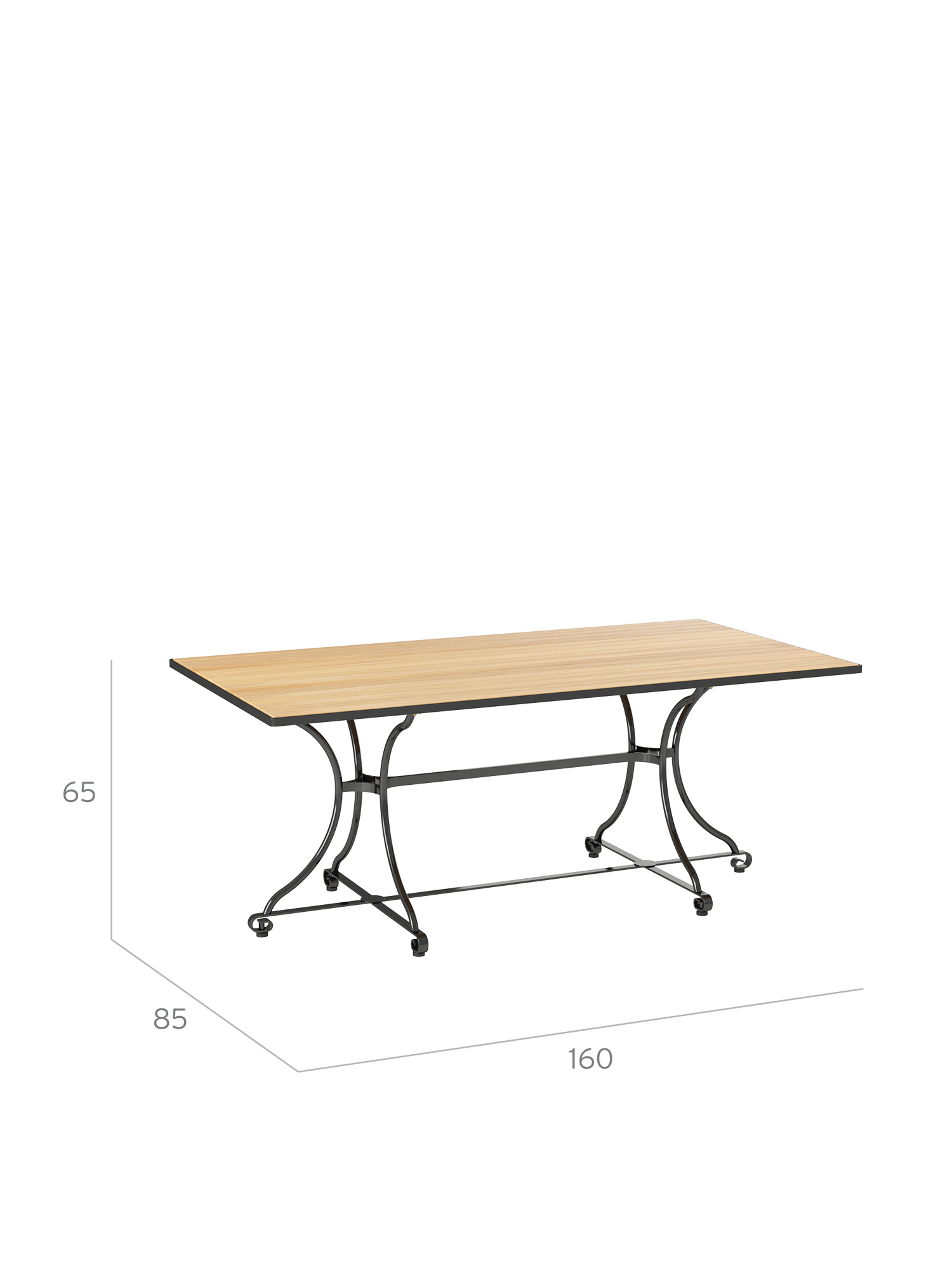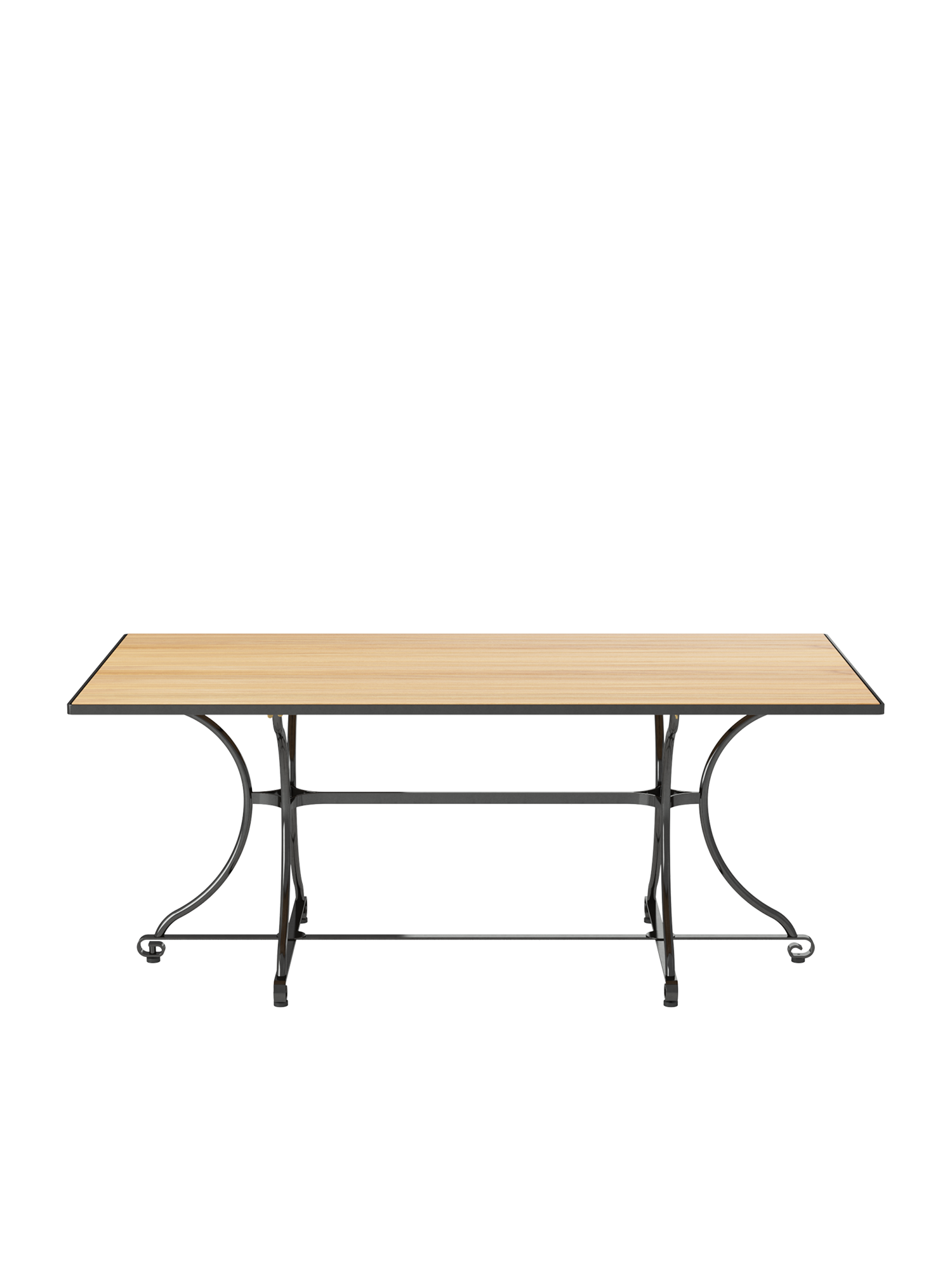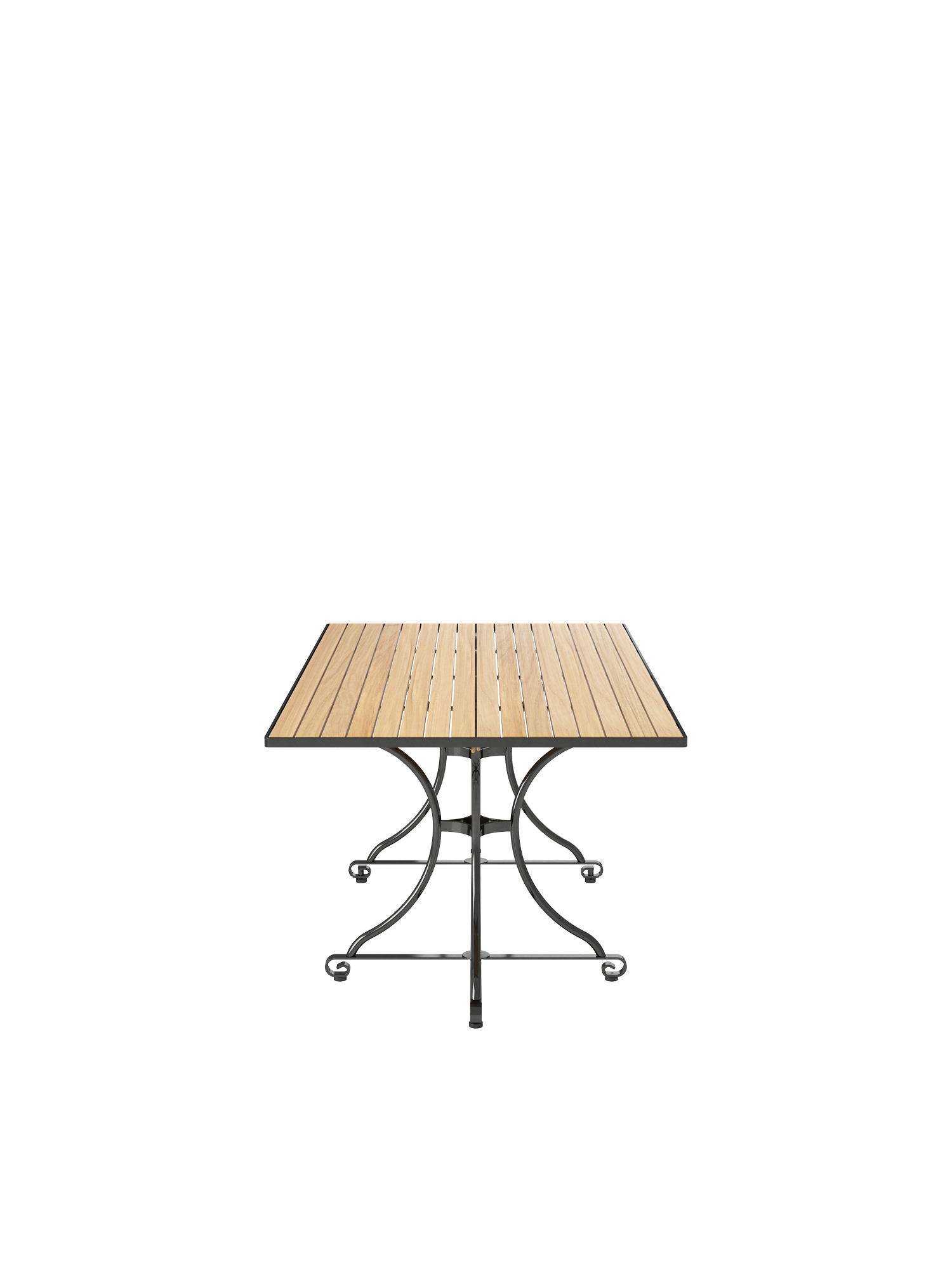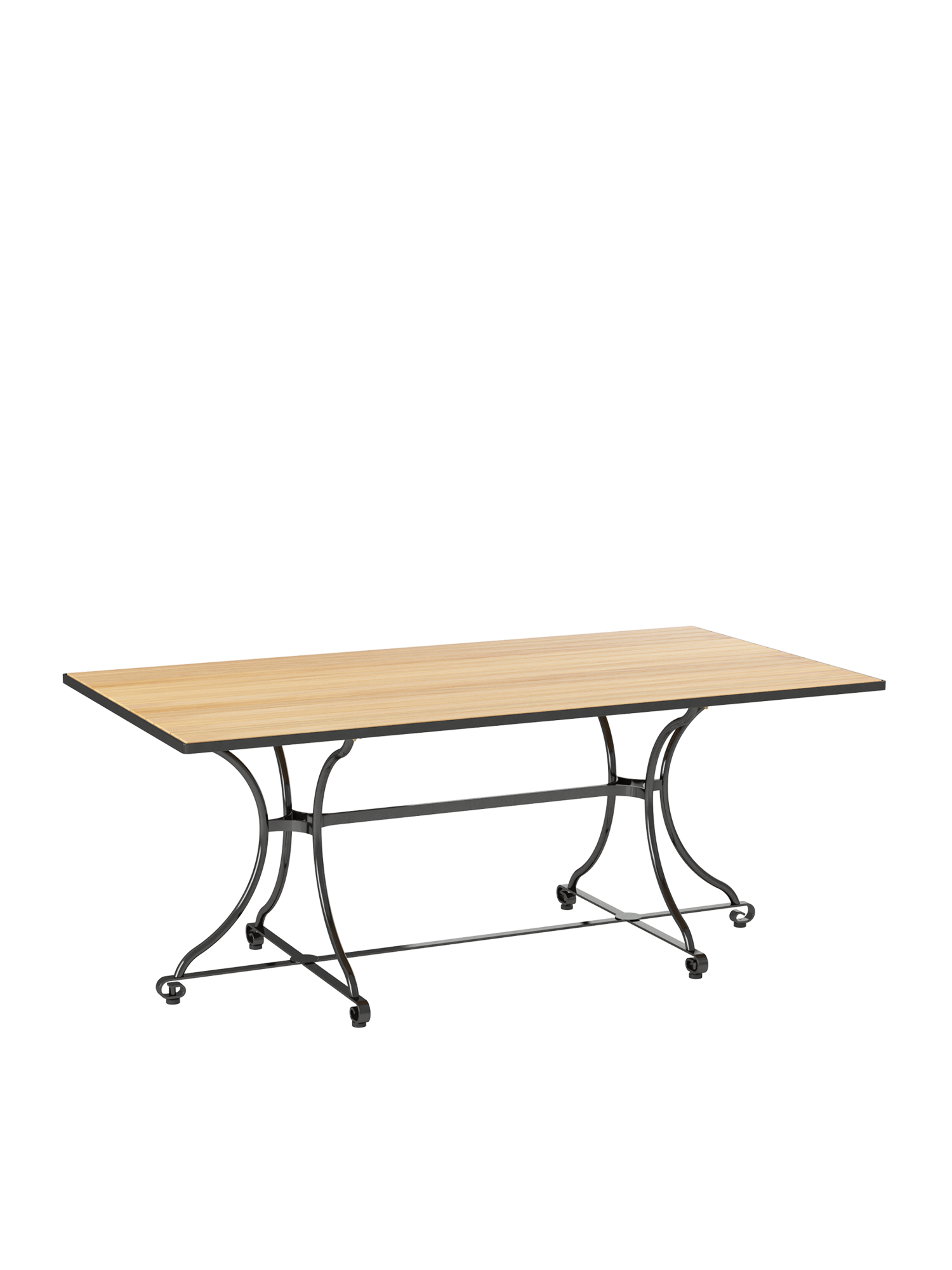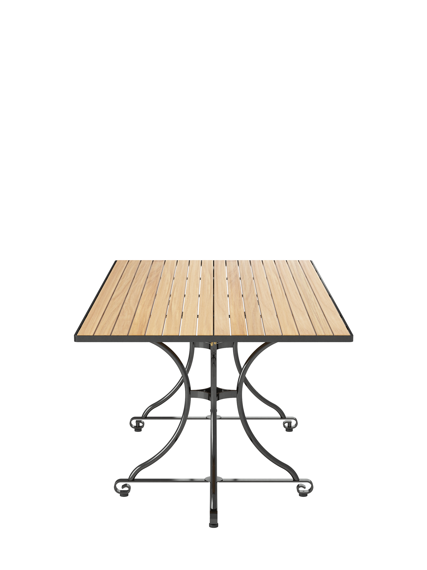 Die Platte des Gartentisches besteht aus Teakleisten in einem Stahlreif, das nicht klappbare Gestell aus verzinktem, graphitschwarz pulverbeschichtetem Stahl. Höhenverstellbare Fußgleiter gleichen Bodenunebenheiten flexibel aus.