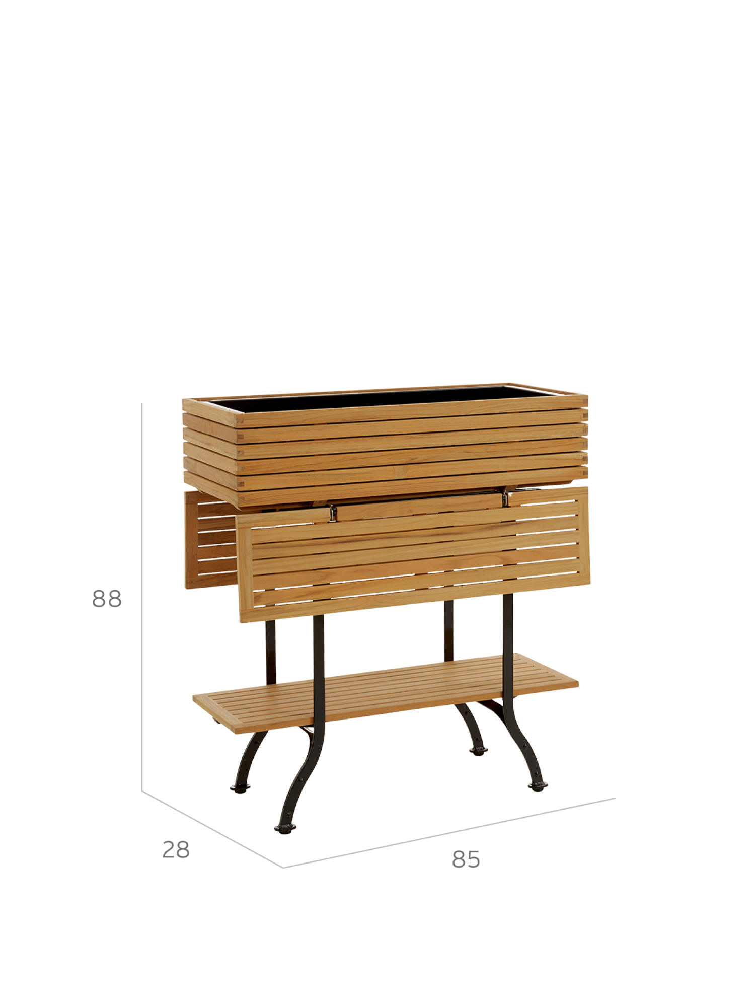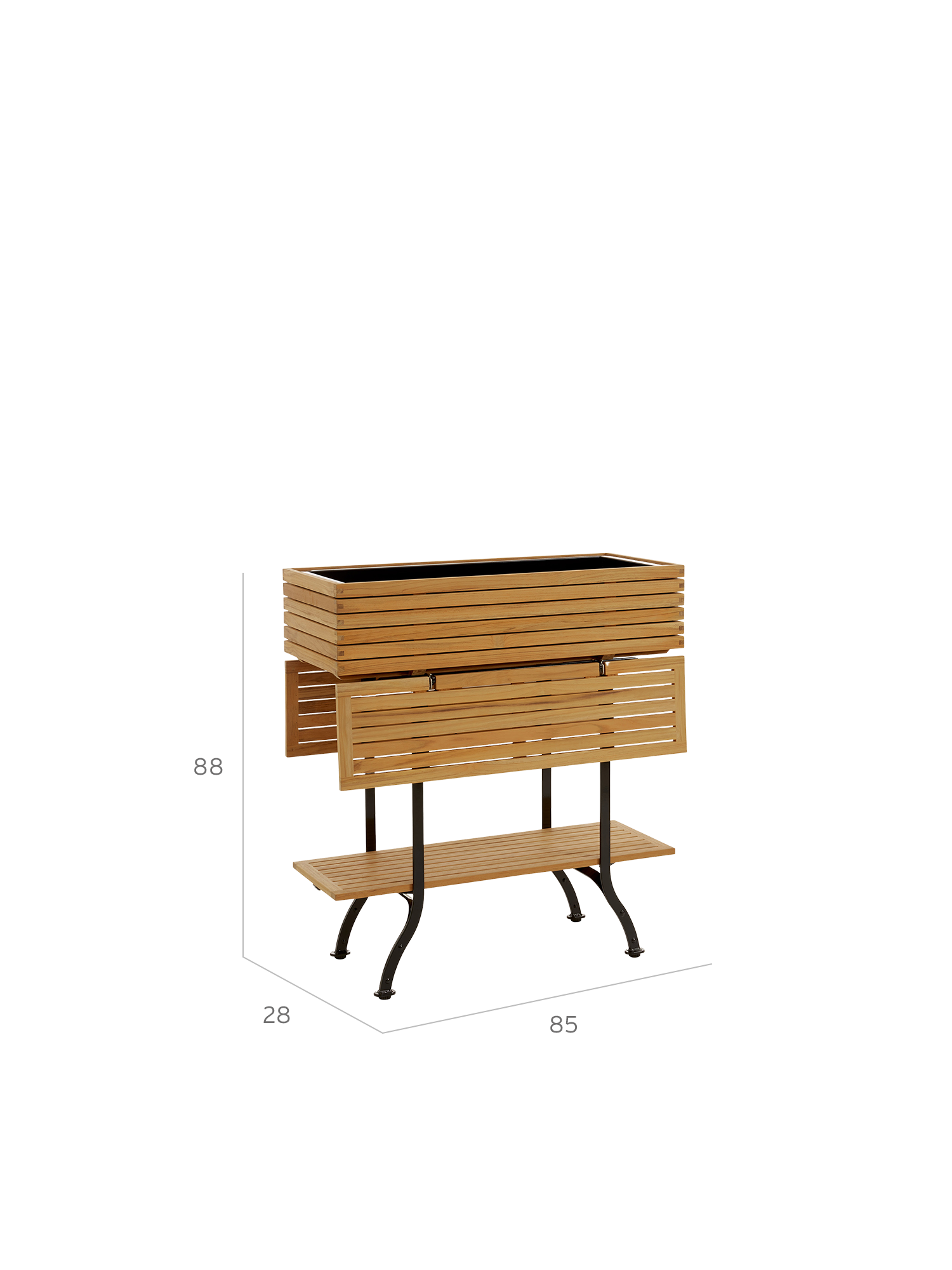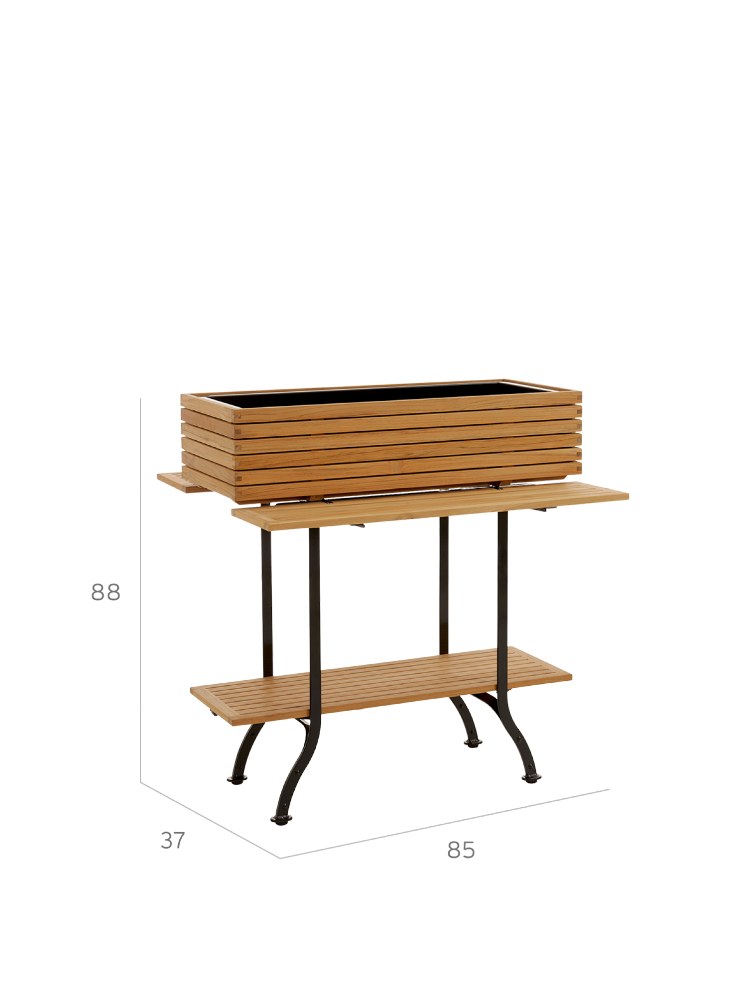 Das Gestell ist aus verzinktem und damit rostgeschütztem Stahl, graphitschwarz pulverbeschichtet, der Einsatz aus schwarz pulverbeschichtetem Aluminium. Seine Verkleidung besteht, genau wie der praktische untere Regalboden und die klappbaren Abstellflächen, aus massiven Teakleisten.