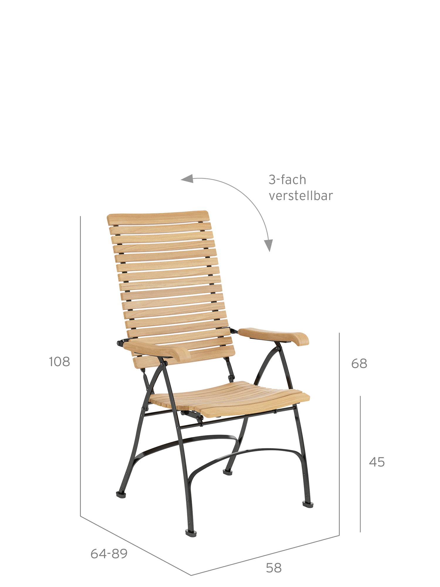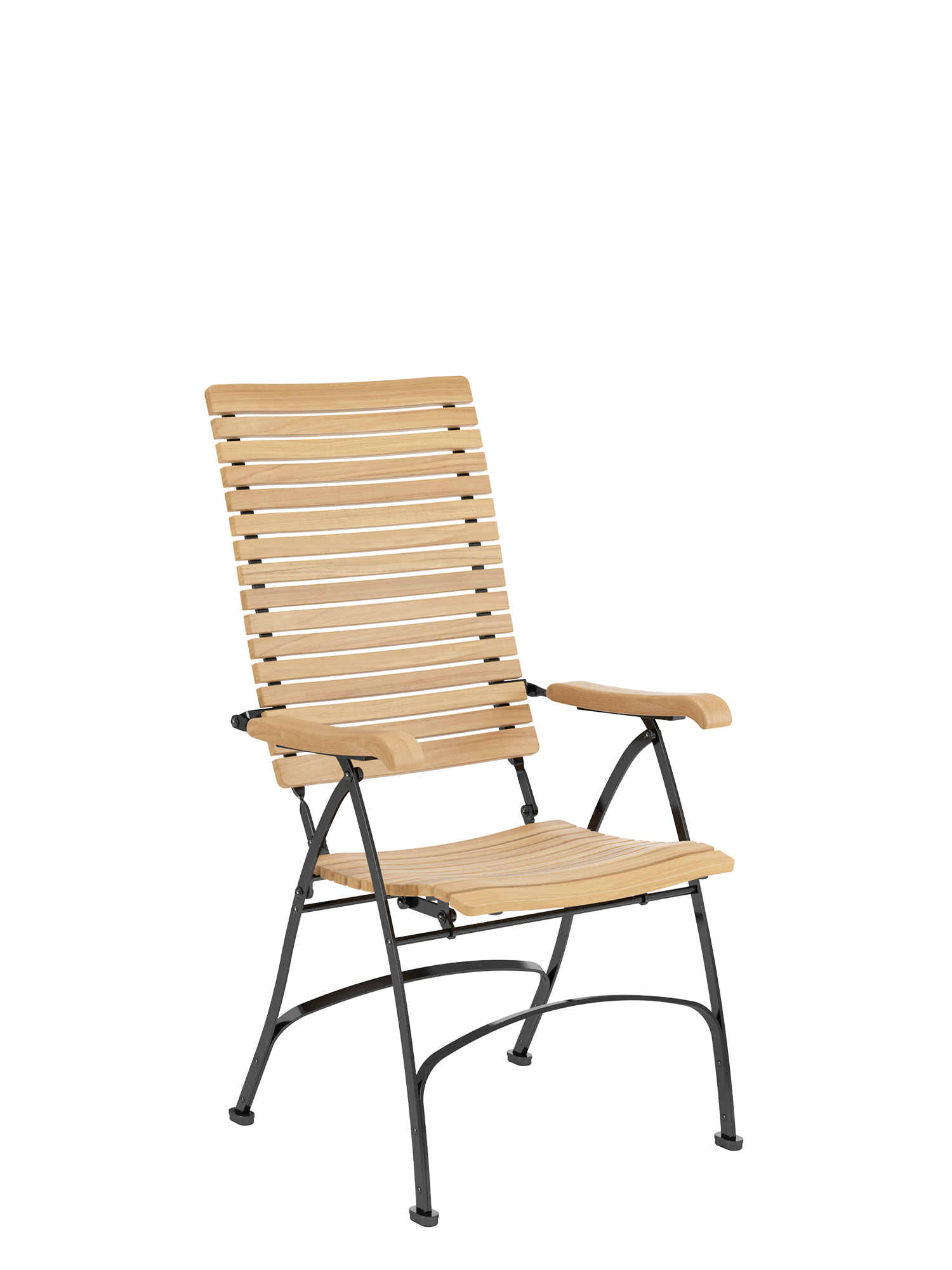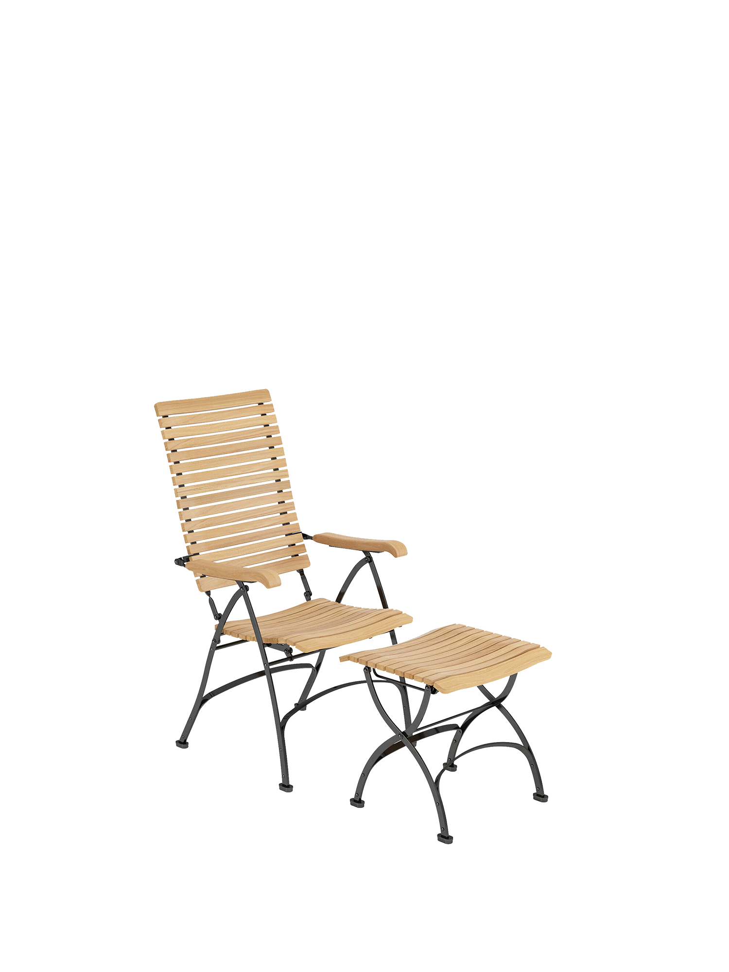 Der Recliner mit extrahoher Lehne fügt sich in jede Tischgesellschaft ein. Für eine perfektionierte Entspannung lässt er sich durch den Hocker zum behaglichen Liegestuhl umfunktionieren. Die klappbaren Möbel kombinieren pulverbeschichtete Stahlgestelle mit präzise bearbeiteten Leisten aus massivem Plantagenteak.