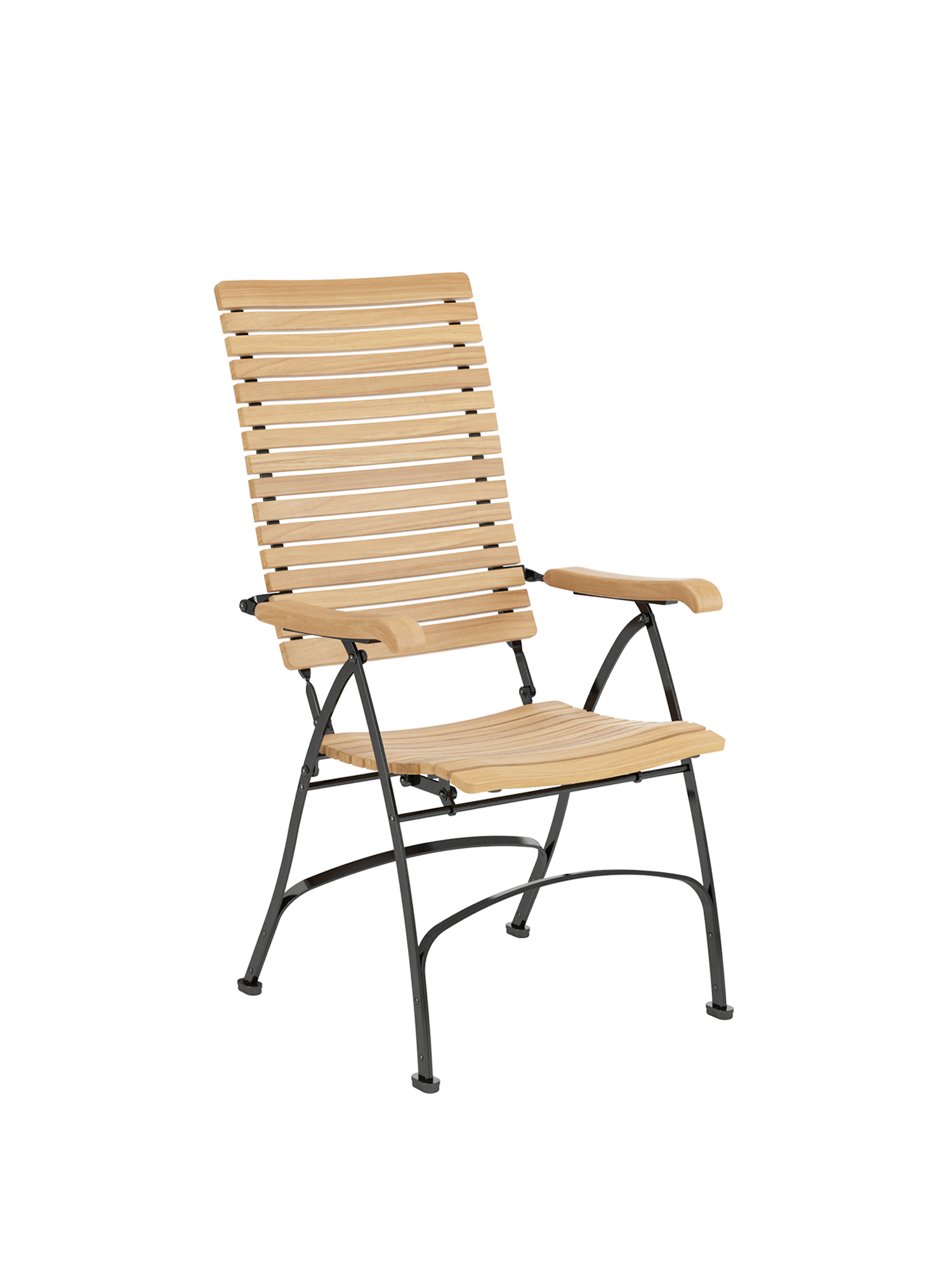 Alle Drehverbindungen aus Edelstahlbolzen sind rostfrei gelagert - für eine dauerhafte Funktion im Freien. Laufrollen aus hochwertigem Polyamid, die unter der Sitzfläche angebracht sind, unterstützen leichtgängiges Klappen und schonen die beschichteten Metallteile. Die große Sitzfläche aus Teak ist dreidimensional geformt, so dass sie sich dem Körper anschmiegt. Vorn ist sie zur besseren Schenkelauflage abgerundet. Das Gestell besteht aus verzinktem und damit rostgeschütztem Stahl, graphitschwarz pulverbeschichtet. Fußgleiter aus abriebfestem Kunststoff schützen wertvolle Böden vor Kratzern.