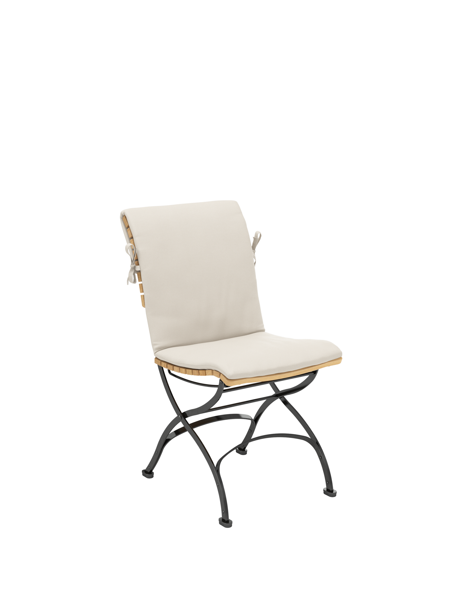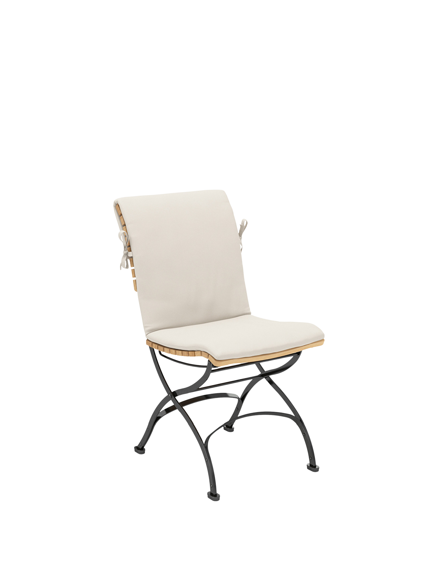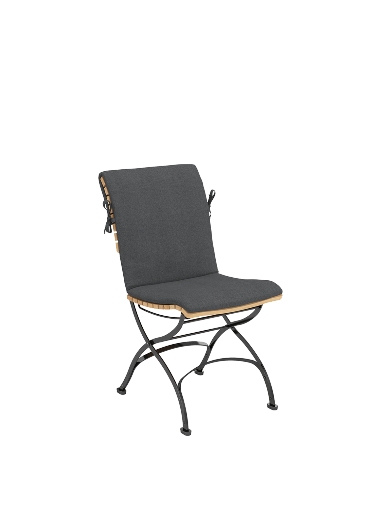 Die Rückenlehne des Fontenay Stuhls besteht aus massiven Teakleisten, die in engem Abstand aufeinander folgen. Ihre Form ist nach einem der ungewöhnlichsten Kurvenverläufe modelliert: dem des menschlichen Rückens. Die große Sitzfläche aus Teak ist dreidimensional geformt, so dass sie sich dem Körper anschmiegt. Vorn ist sie zur besseren Schenkelauflage abgerundet. Auflagen in verschiedenen Farbtönen erhöhen noch die Bequemlichkeit der Möbel und setzen feine Akzente.