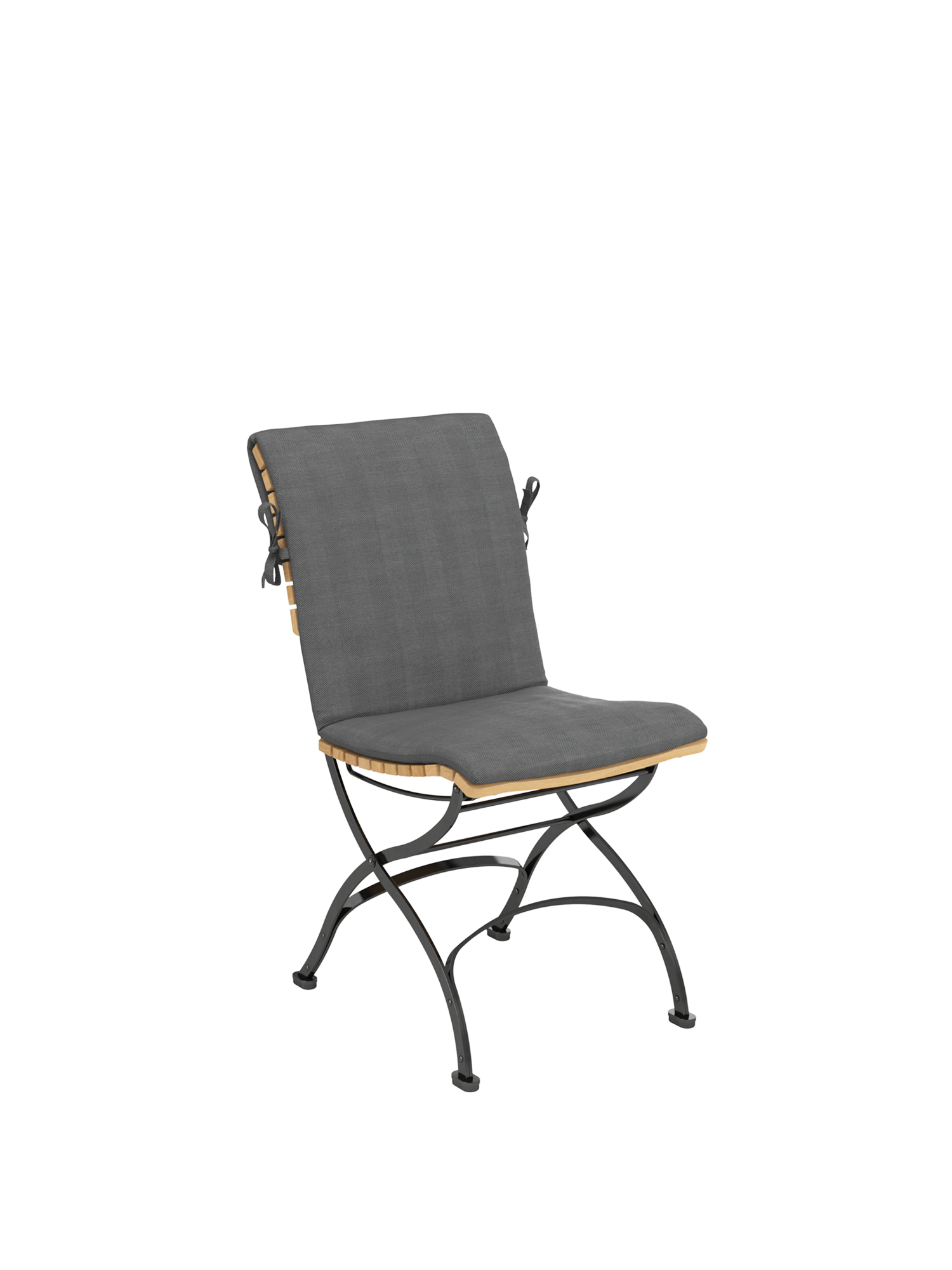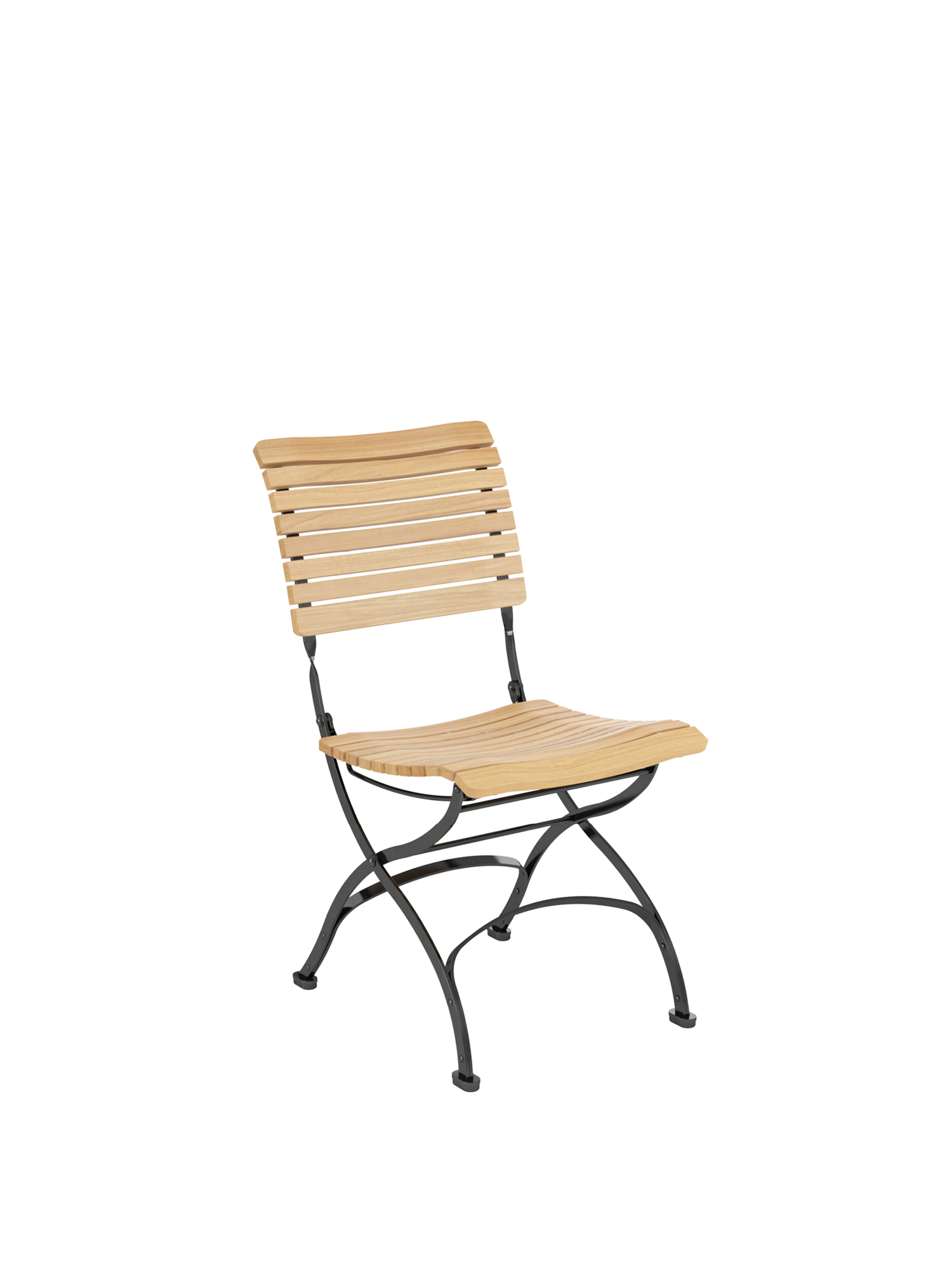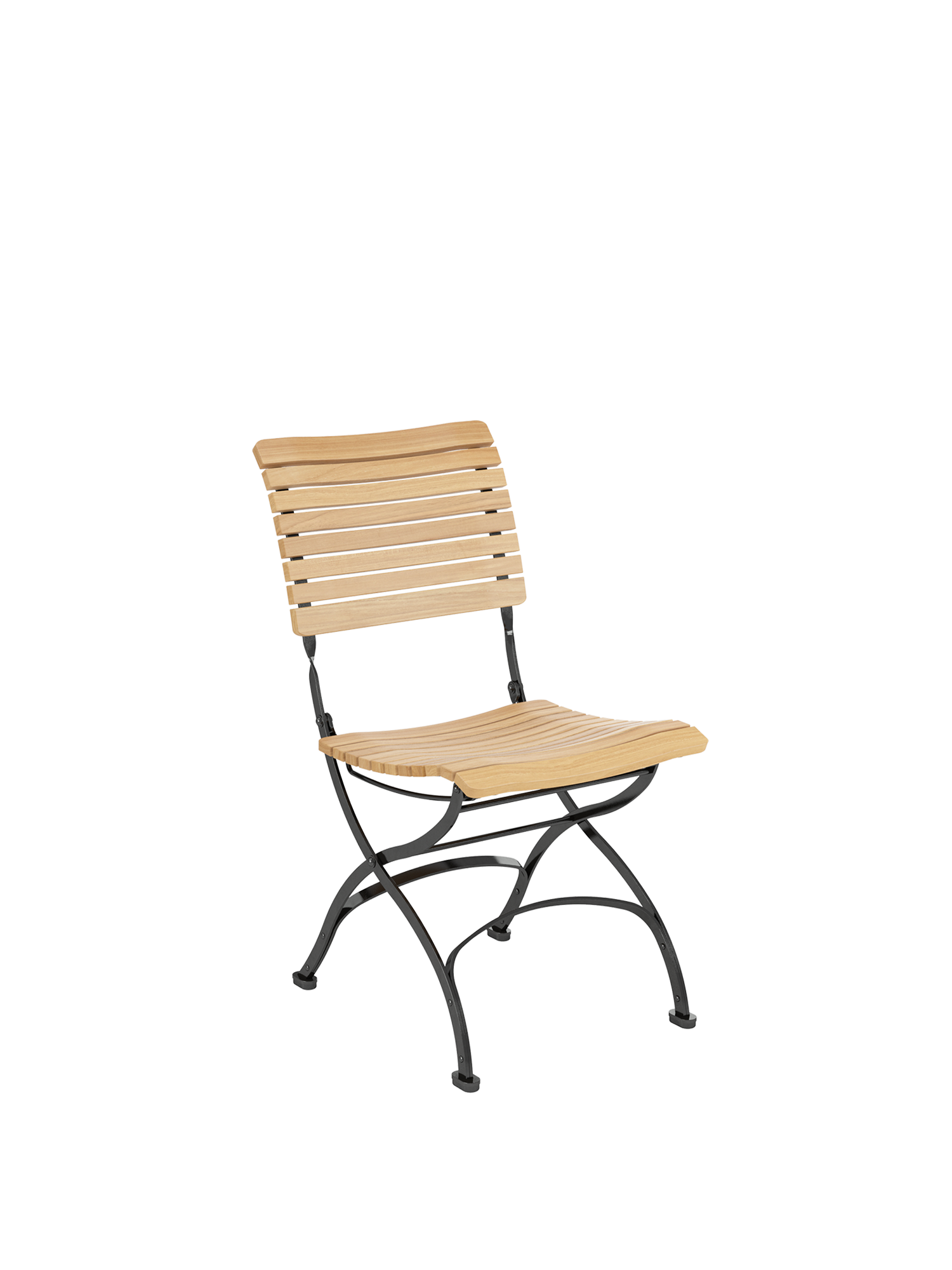 Alle Drehverbindungen aus Edelstahlbolzen sind rostfrei gelagert - für eine dauerhafte Funktion im Freien. Laufrollen aus hochwertigem Polyamid, die unter der Sitzfläche angebracht sind, unterstützen leichtgängiges Klappen und schonen die beschichteten Metallteile. Das Gestell besteht aus verzinktem und damit rostgeschütztem Stahl, graphitschwarz pulverbeschichtet. Zusammengefaltet ist der Stuhl 12 cm schmal. Fußgleiter aus abriebfestem Kunststoff schützen wertvolle Böden vor Kratzern.