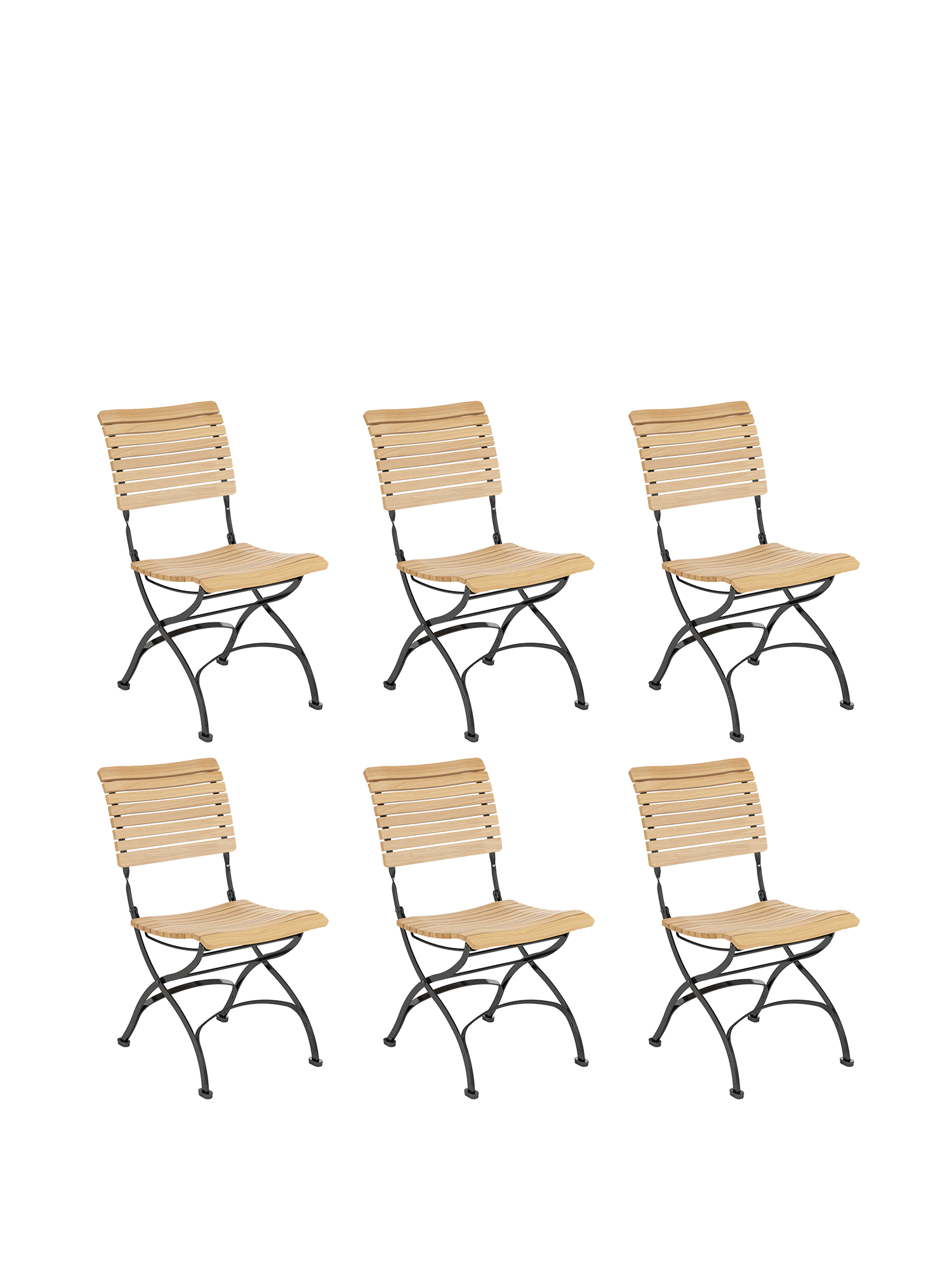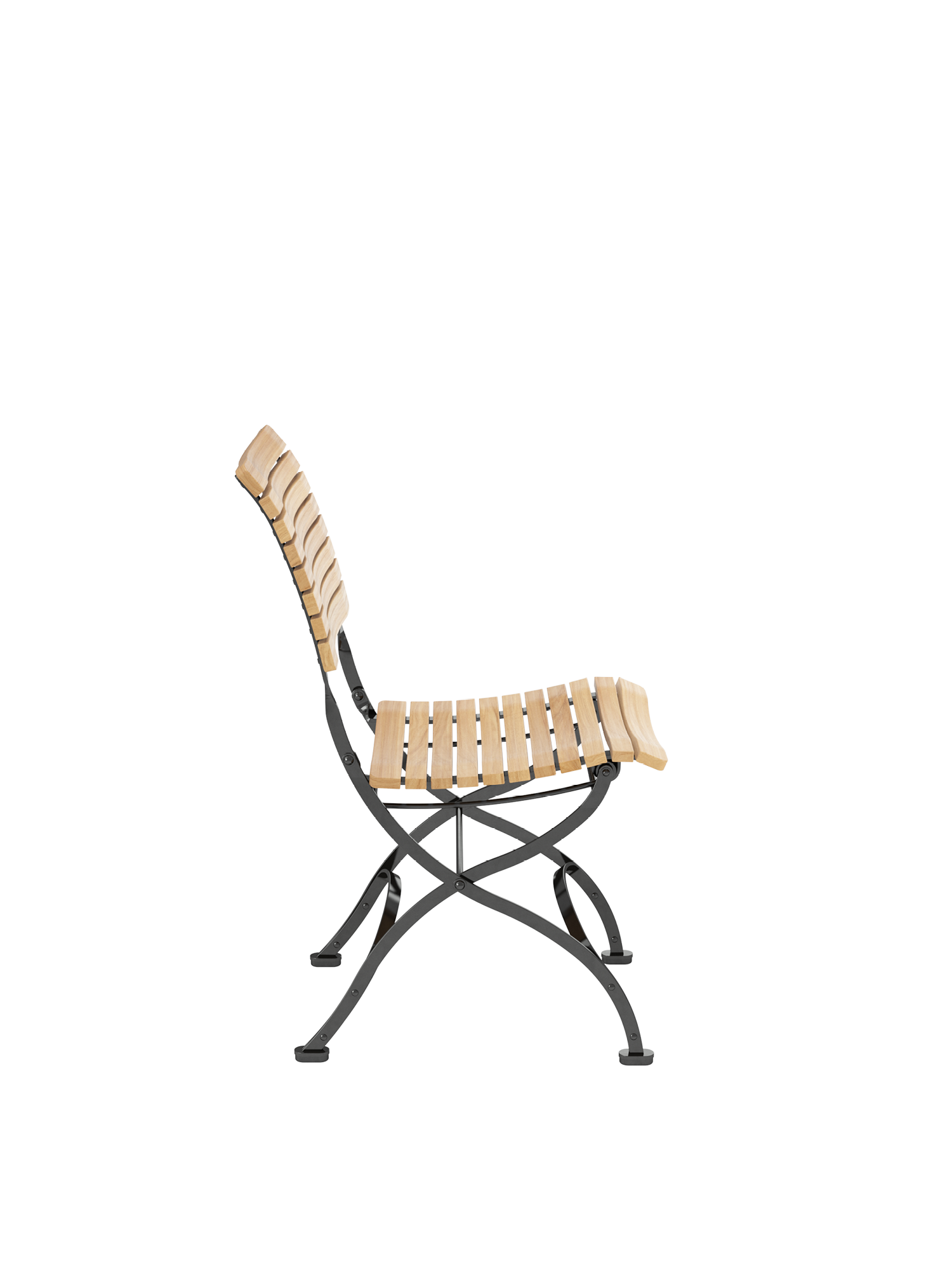 Die Rückenlehne des Fontenay Stuhls wird aus massiven Teakleisten gefertigt, die in engem Abstand aufeinander folgen. Ihre Form ist nach einem der ungewöhnlichsten Kurvenverläufe modelliert: dem des menschlichen Rückens. Die dreidimensional geformte Sitzfläche schmiegt sich dem Körper an. Das Gestell besteht aus verzinktem, pulverbeschichtetem Stahl. Zusammengefaltet ist der Stuhl nur 12 Zentimeter schmal.