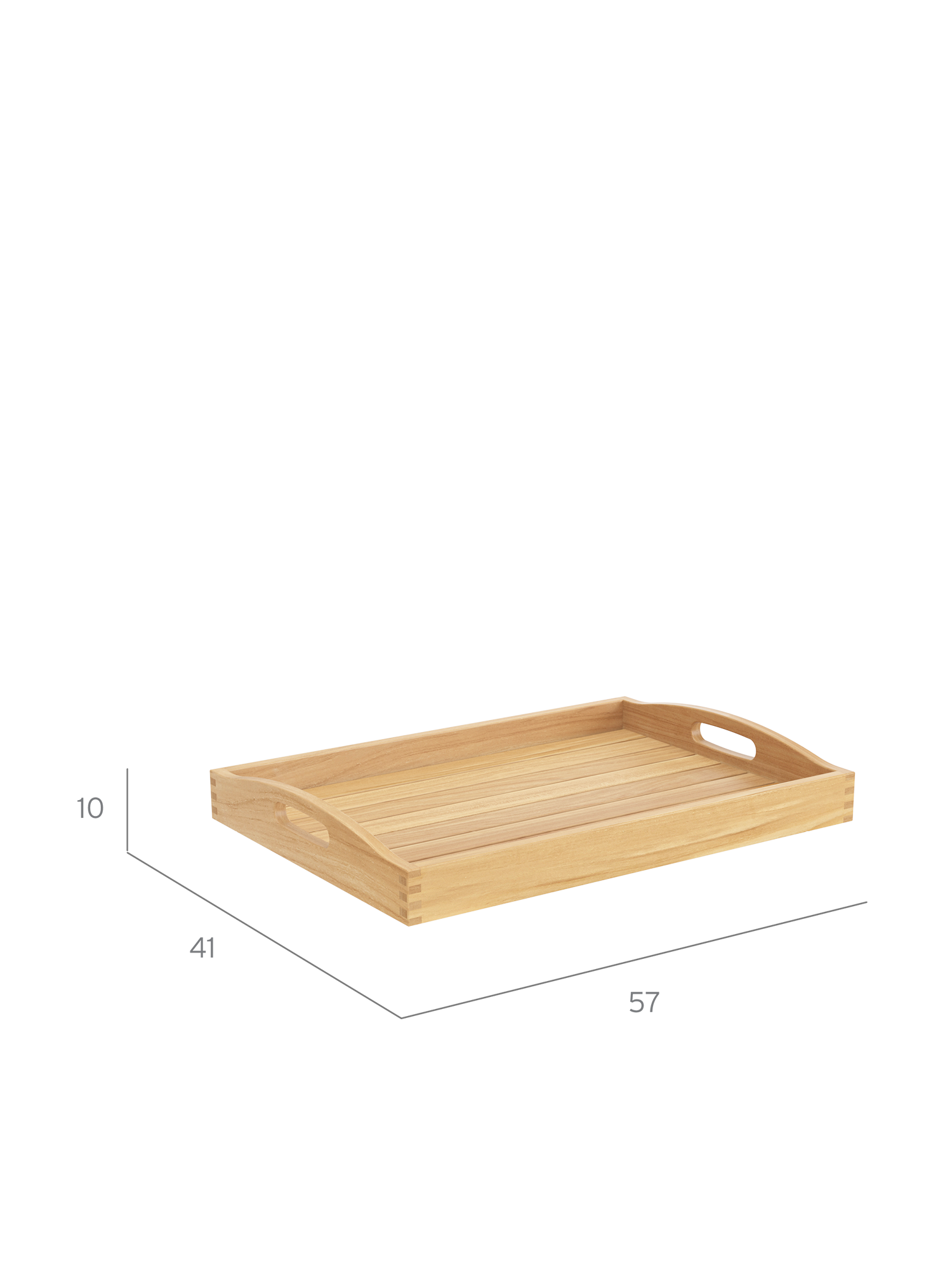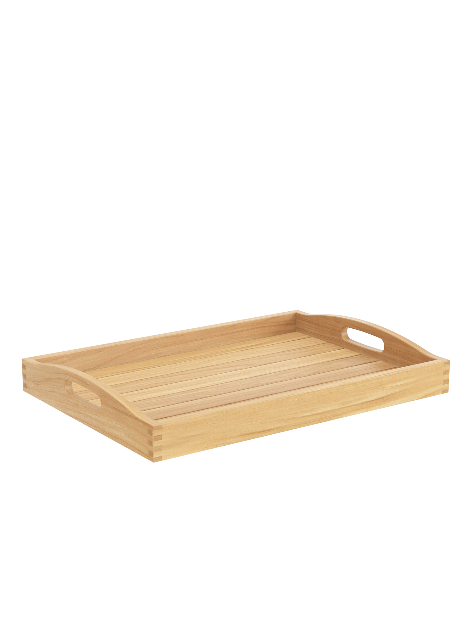 Formvollendet serviert das elegante Tablett aus Teakleisten das Frühstück, transportiert Zutaten zum Lunch im Freien oder trägt Gläser und Geschirr an den Esstisch. Geradlinig und mit zwei Griffen versehen, bietet es stabilen Halt und eine große Auflagefläche, deren wetterfeste Qualitäten es für den Einsatz im Innen- und Außenbereich prädestiniert.