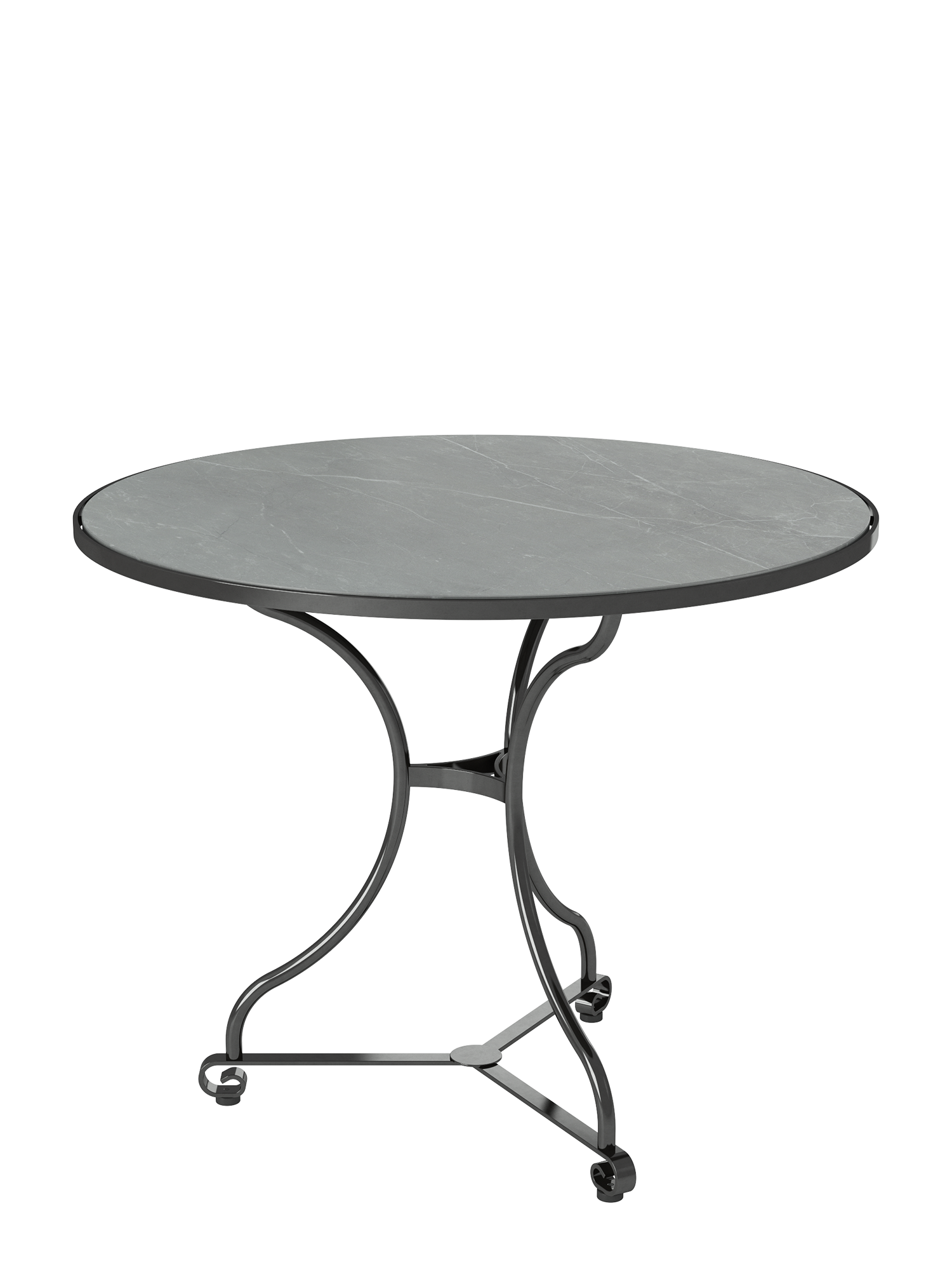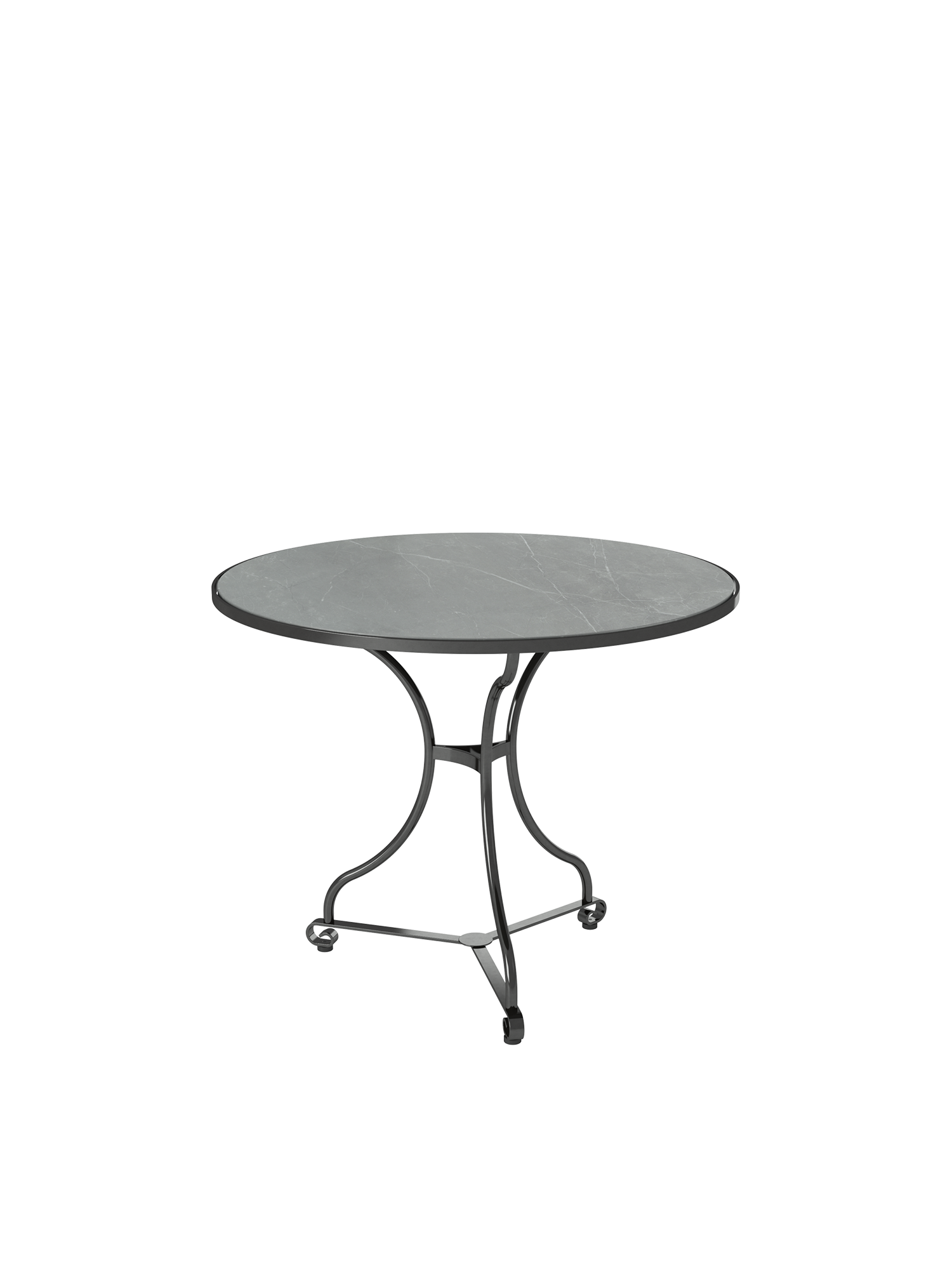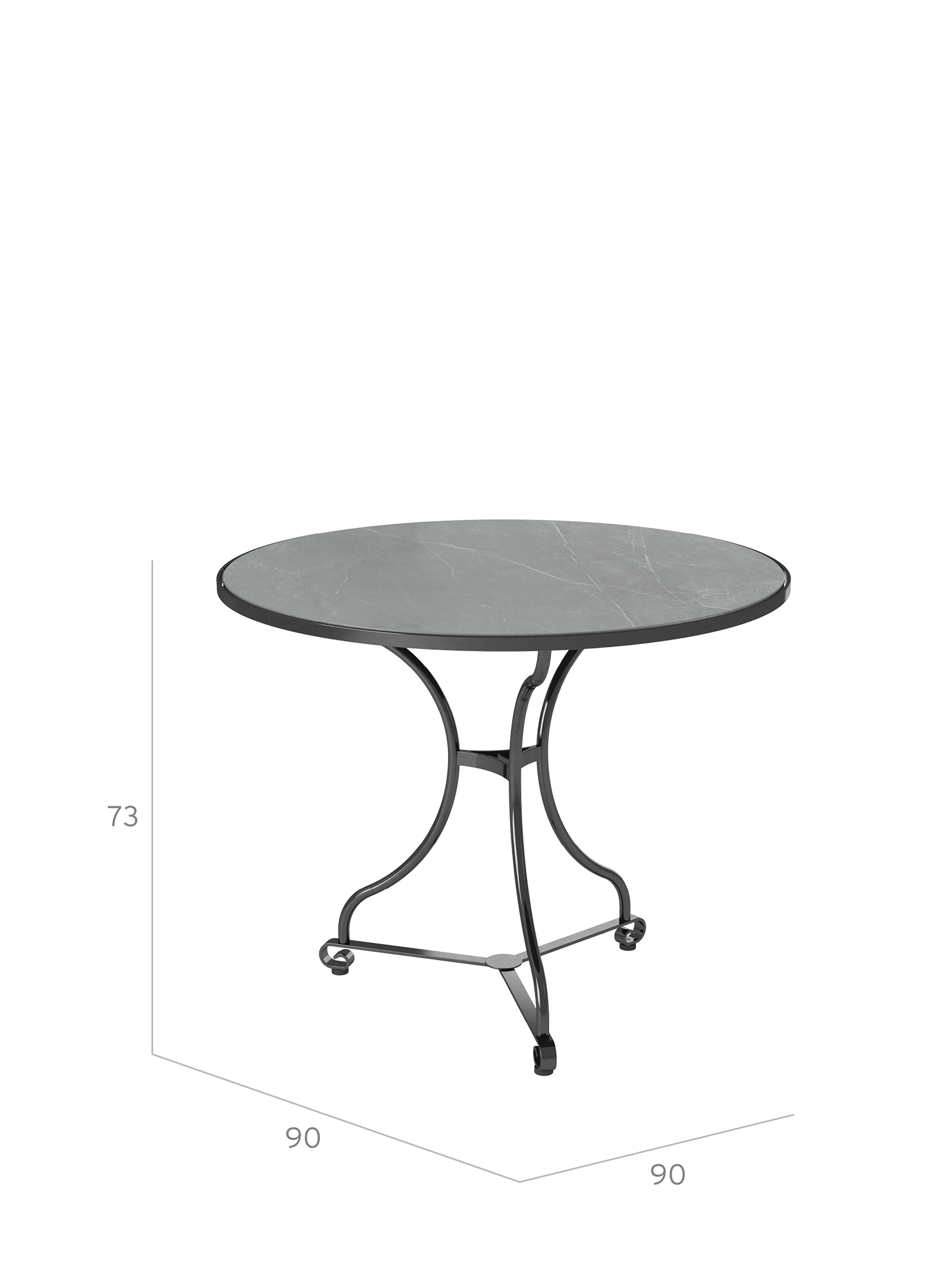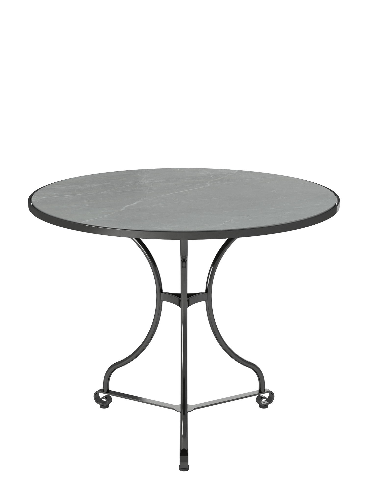 Die mattgraue Keramikplatte mit der Anmutung dekorativ gemaserten Marmors verleiht dem klassischen Gartentisch einen edlen Akzent.