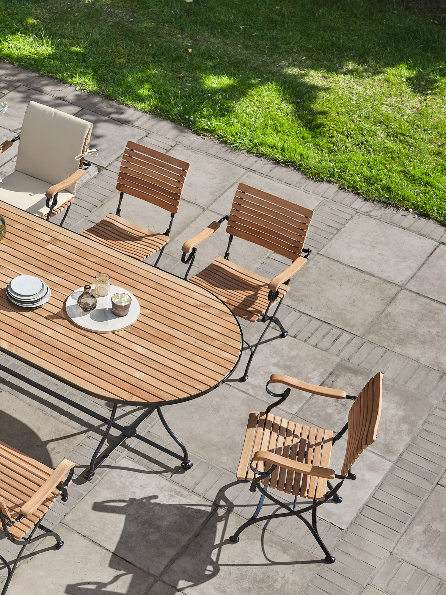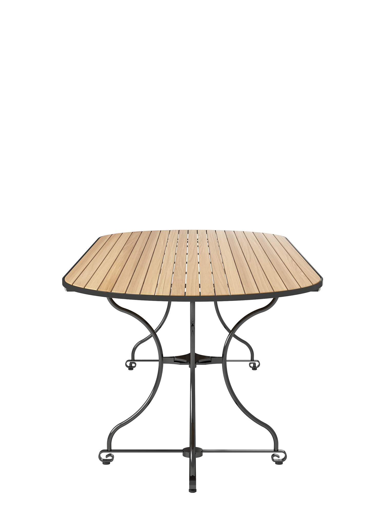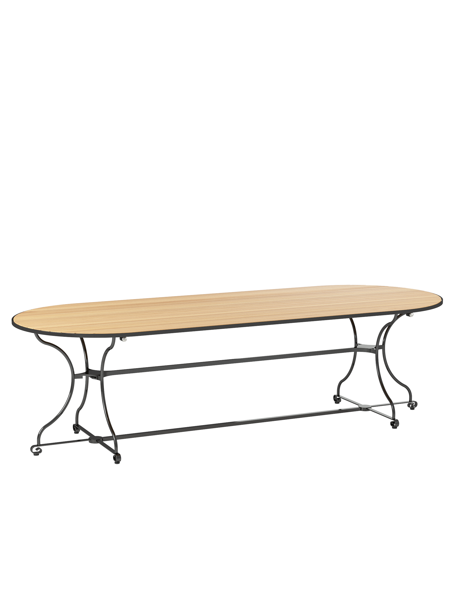 Über dem Gestell des großzügigen Tisches spannen sich massive Teakleisten nahtlos über die gesamte Länge der ovalen Tischplatte. Ihre außergewöhnliche Breite bietet großen Tafelrunden jede Menge Bewegungsfreiheit.