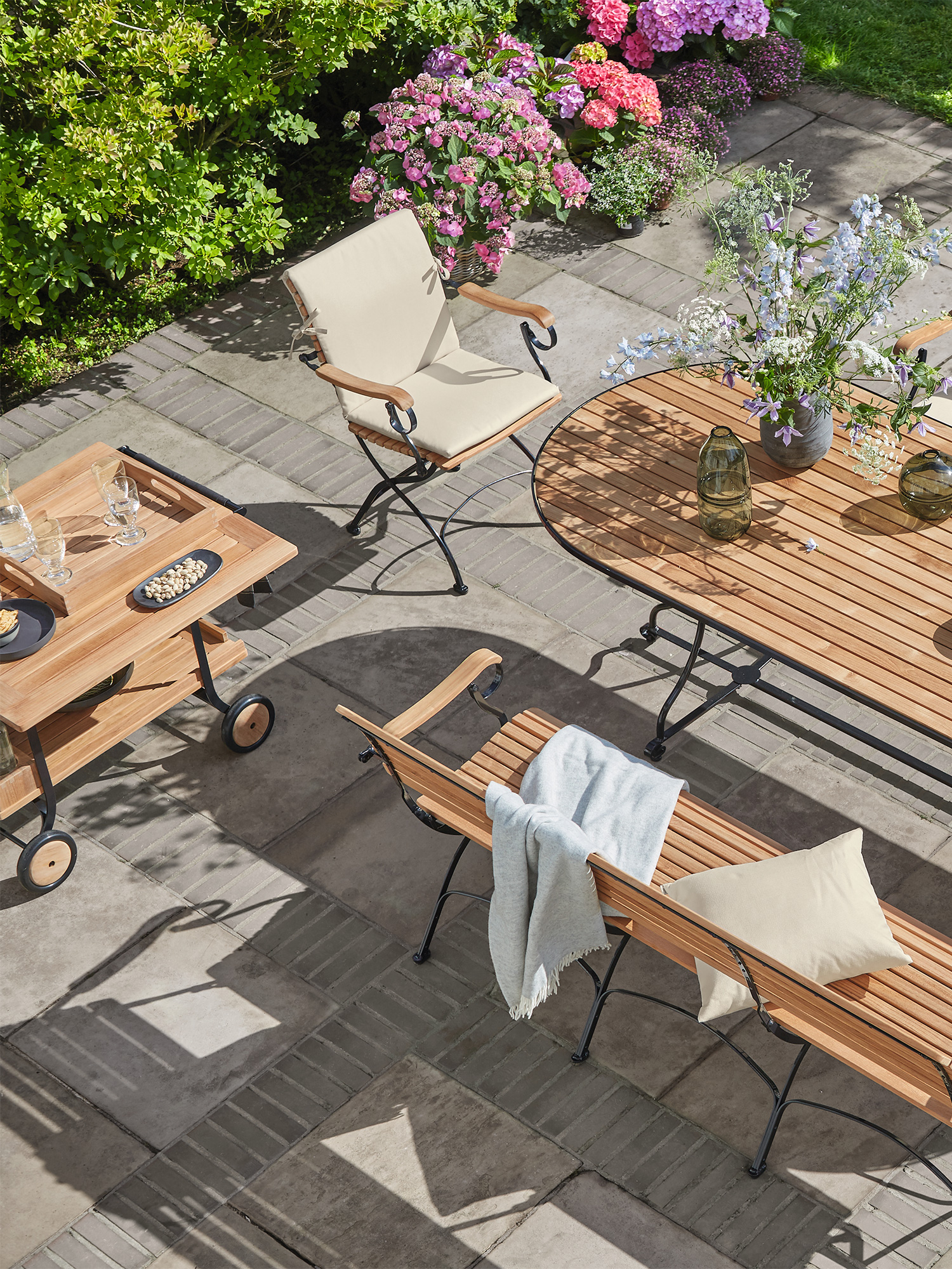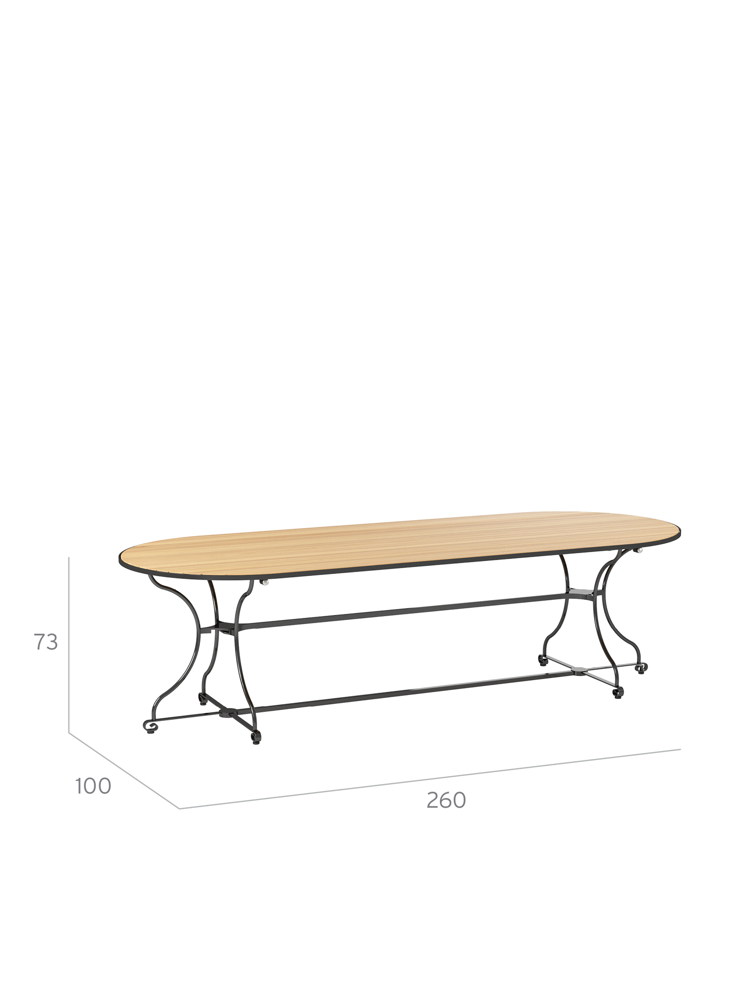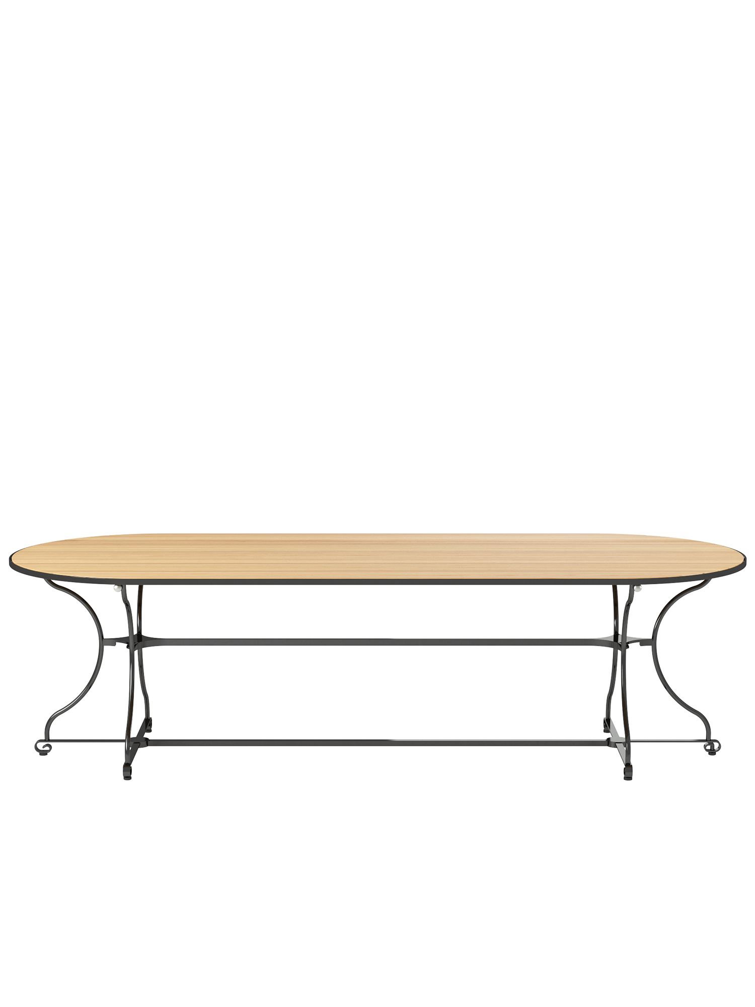Über dem Gestell des großzügigen Tisches spannen sich massive Teakleisten nahtlos über die gesamte Länge der ovalen Tischplatte. Ihre außergewöhnliche Breite bietet großen Tafelrunden jede Menge Bewegungsfreiheit.