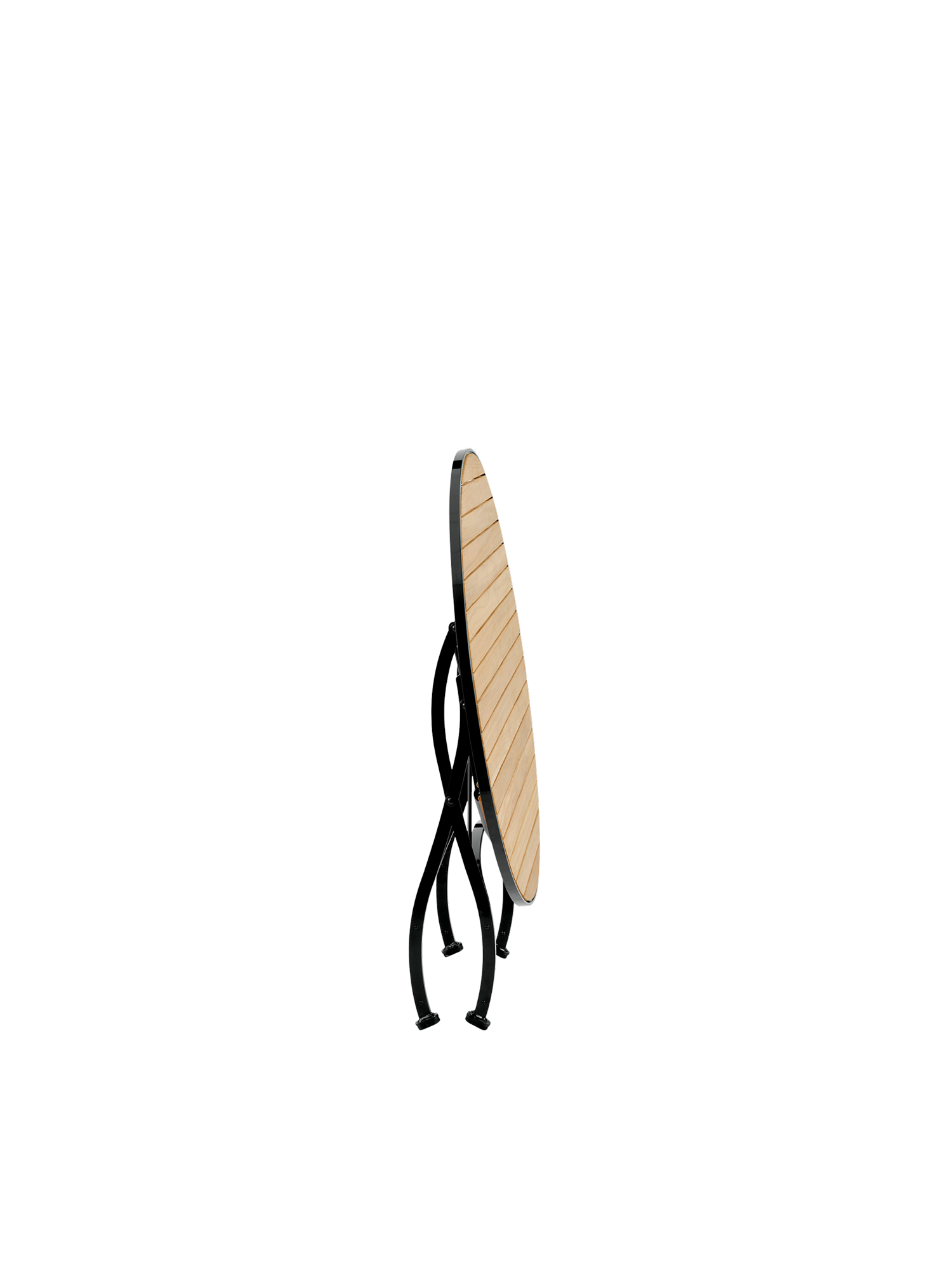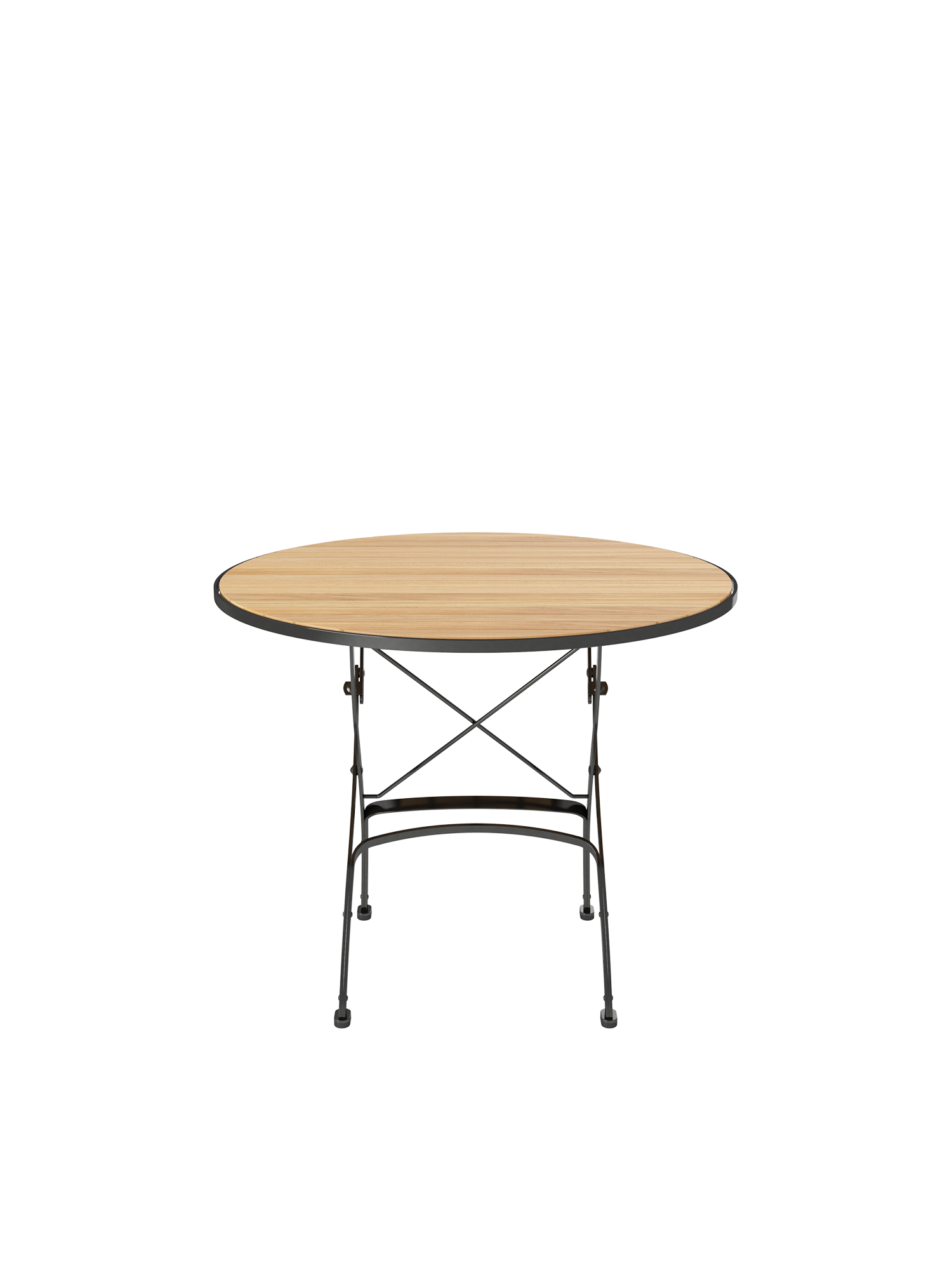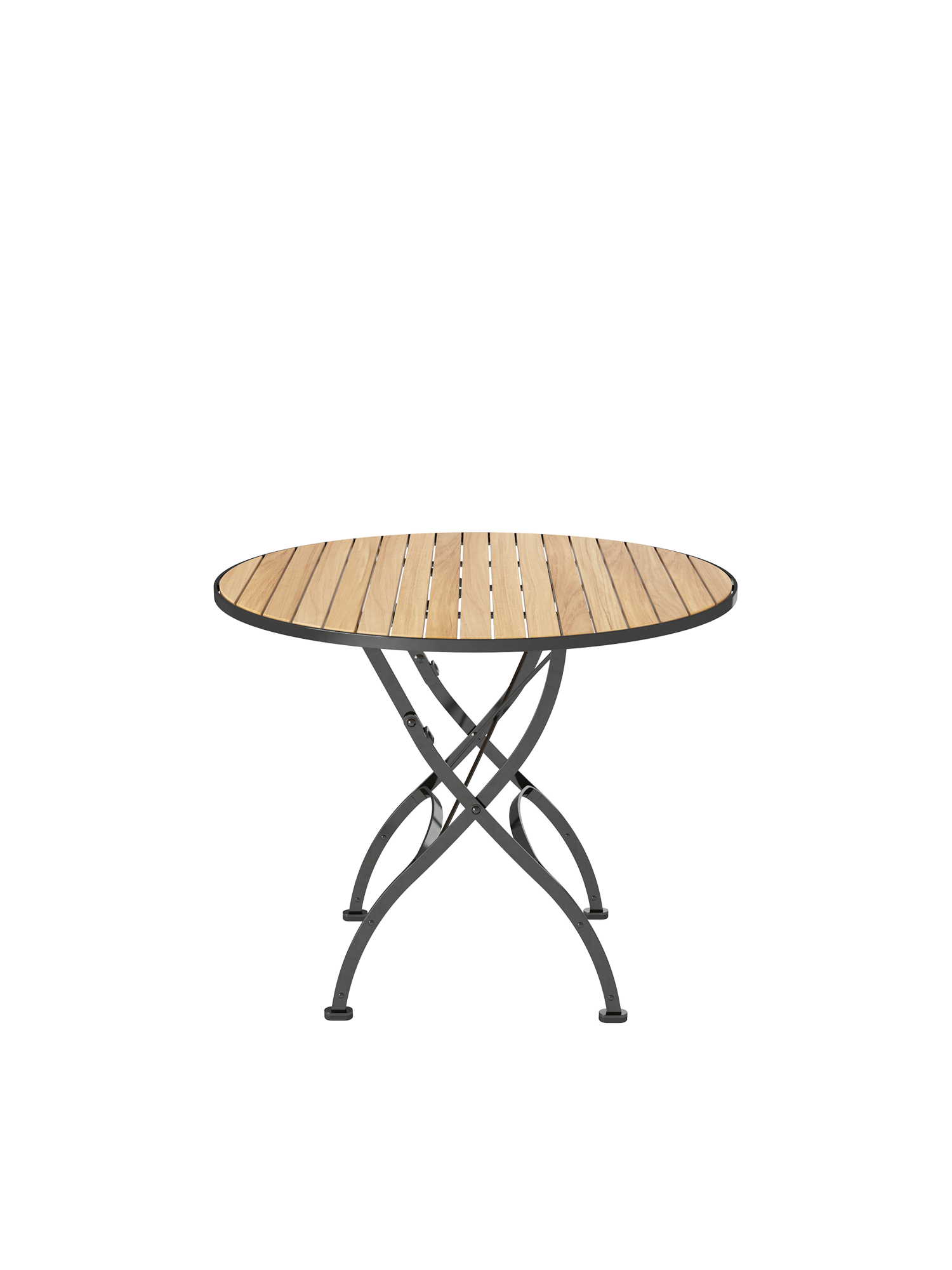 Präzise bearbeitete Leisten aus massivem Plantagenteak prägen die edle Anmutung des klappbaren Gartentisches der Fontenay Kollektion, der sich platzsparend verstauen lässt.