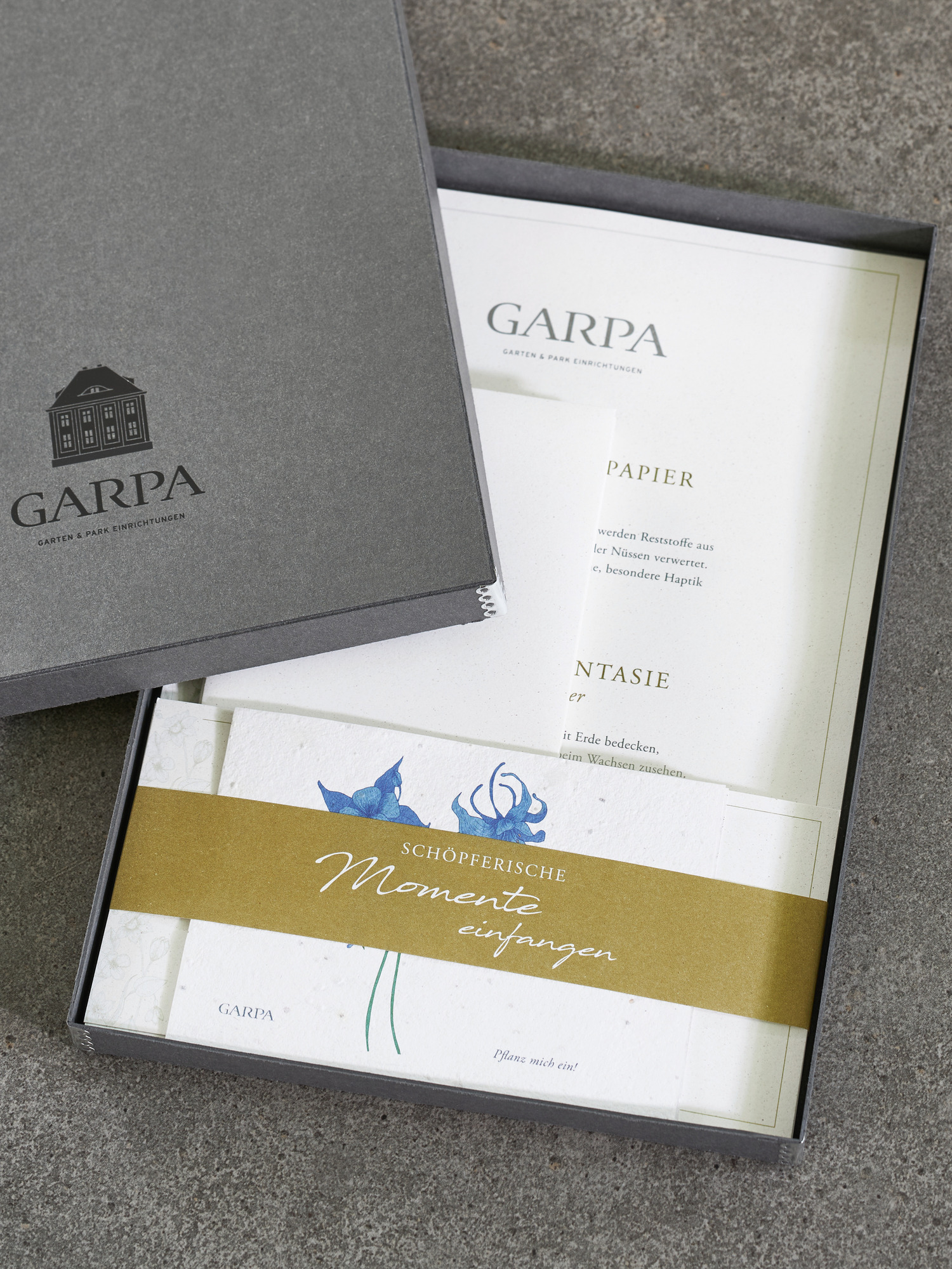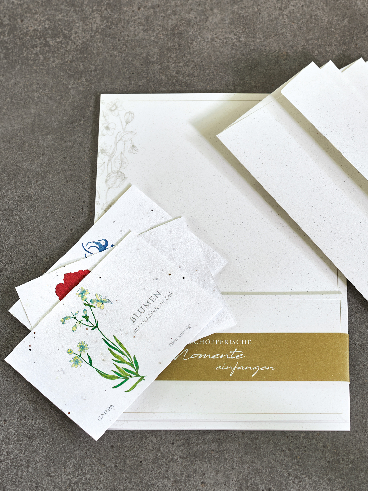 Inhalt: 30 Briefbogen, 6 Kuverts, drei Samenkärtchen mit Banderole