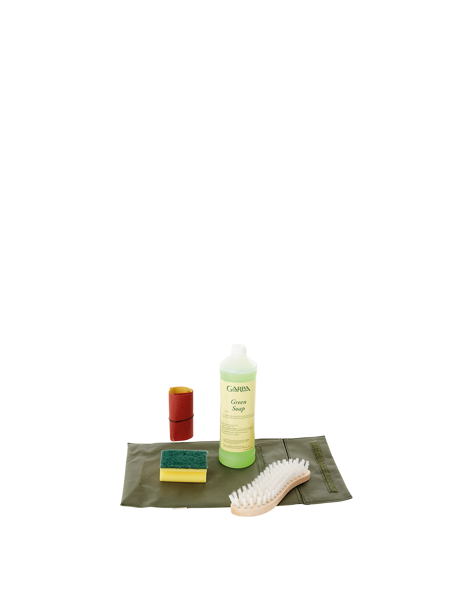 - enthält: Grüne Seife, Schleifpapier P120, Scheuerbürste, Topfreiniger und Latex-Handschuhe Gr. L