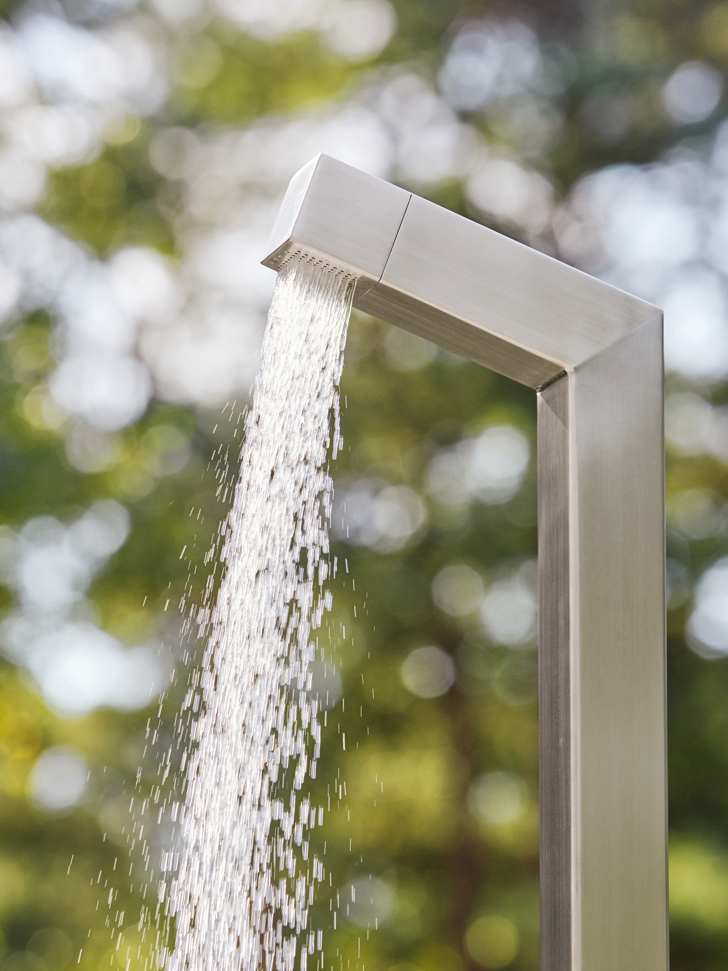 Die hochwertige Kombination aus Teakholz und Edelstahl setzt eindrucksvolle Akzente in exklusiven Freiräumen. Im harmonischen wie praktischen Design gestalten Gartendusche und Handtuchhalter die Erfrischung im Grünen überaus komfortabel.