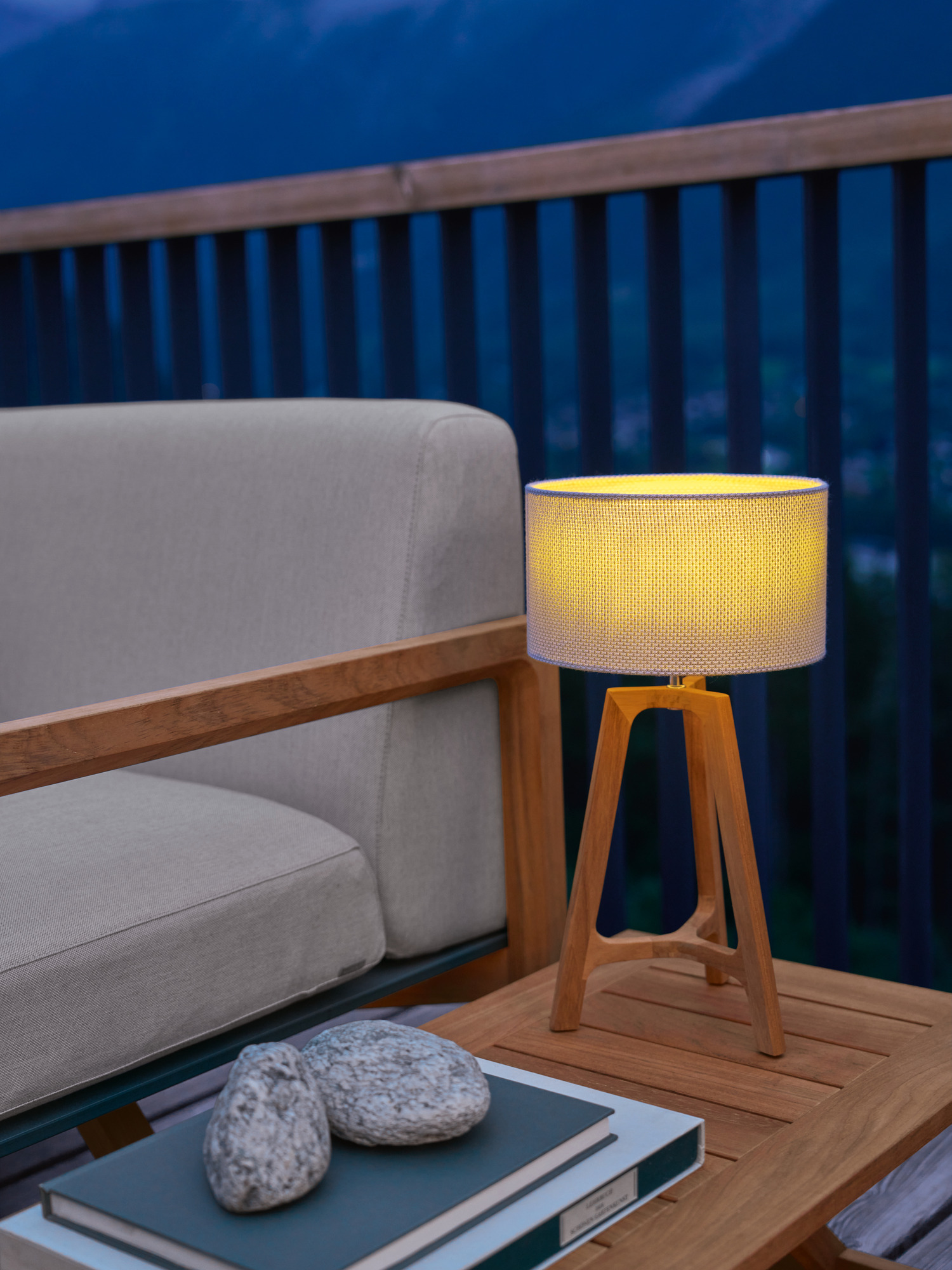 Die dreibeinige Solar-Tischleuchte hat in jeder Gesellschaft einen guten Stand. Mit sanftem Licht erhellt sie die abendliche Szenerie. Der zartgraue, wetterbeständige Schirm fügt sich in jedes Ambiente ein. Das Solarpaneel ist dezent dahinter verborgen. Zum Aufladen kann die Leuchte auch an eine Steckdose angeschlossen werden. Bei Bedarf gibt ein zusätzlicher Edelstahlteller noch mehr Stabilität.