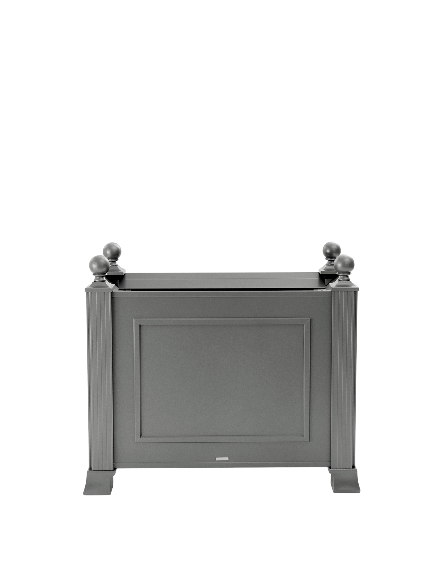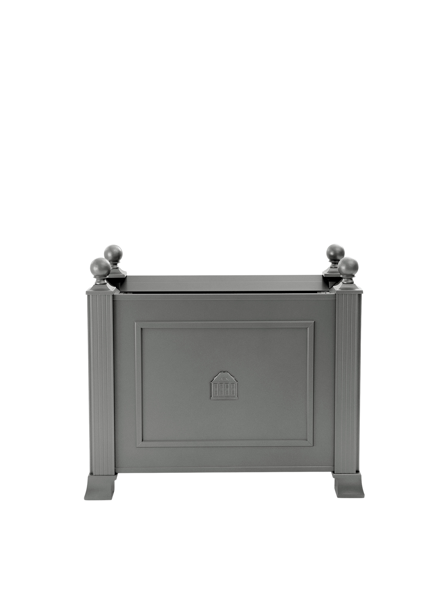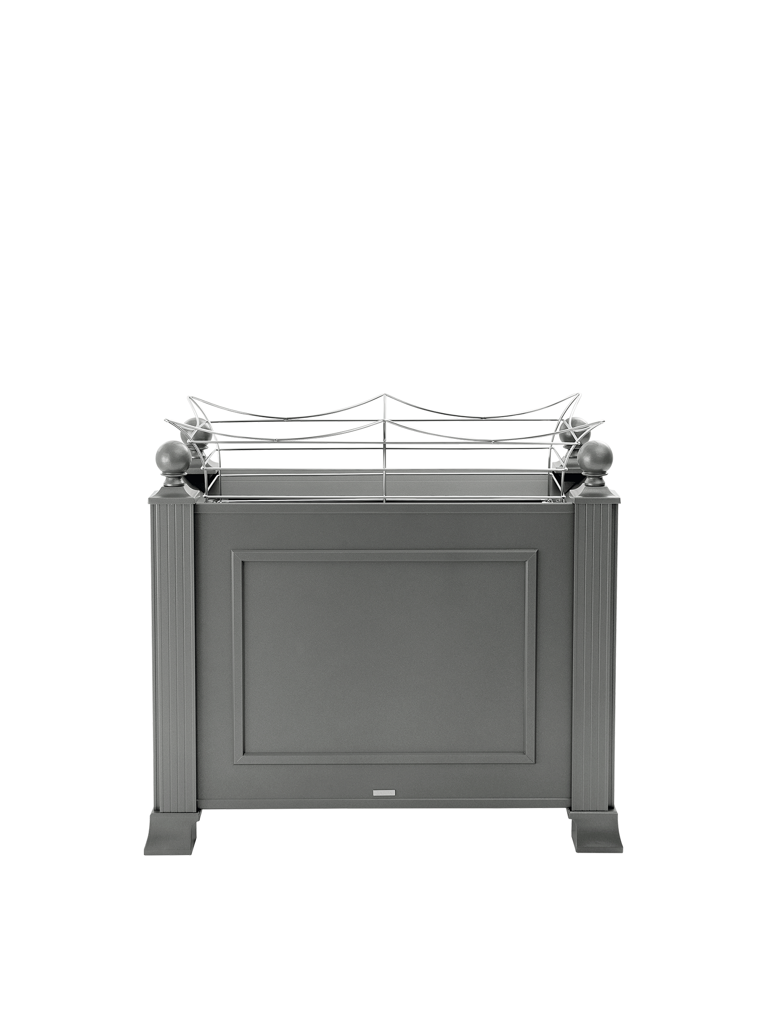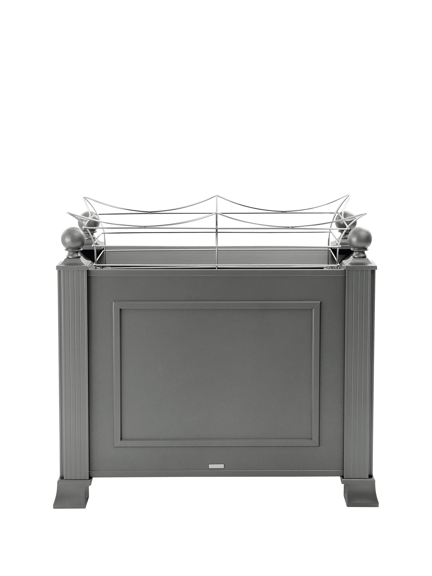 Von Kugeln gekrönt und von starken Füßen getragen demonstrieren die säulenartigen Eckelemente des Grenoble Pflanzkübels Standfestigkeit. Elegant und robust wirkt der Blumenkübel dank des grauen pulverbeschichteten Aluminiums. Ein filigranes Hochrelief auf der Vorderseite zeigt das Garpa Stammhaus.