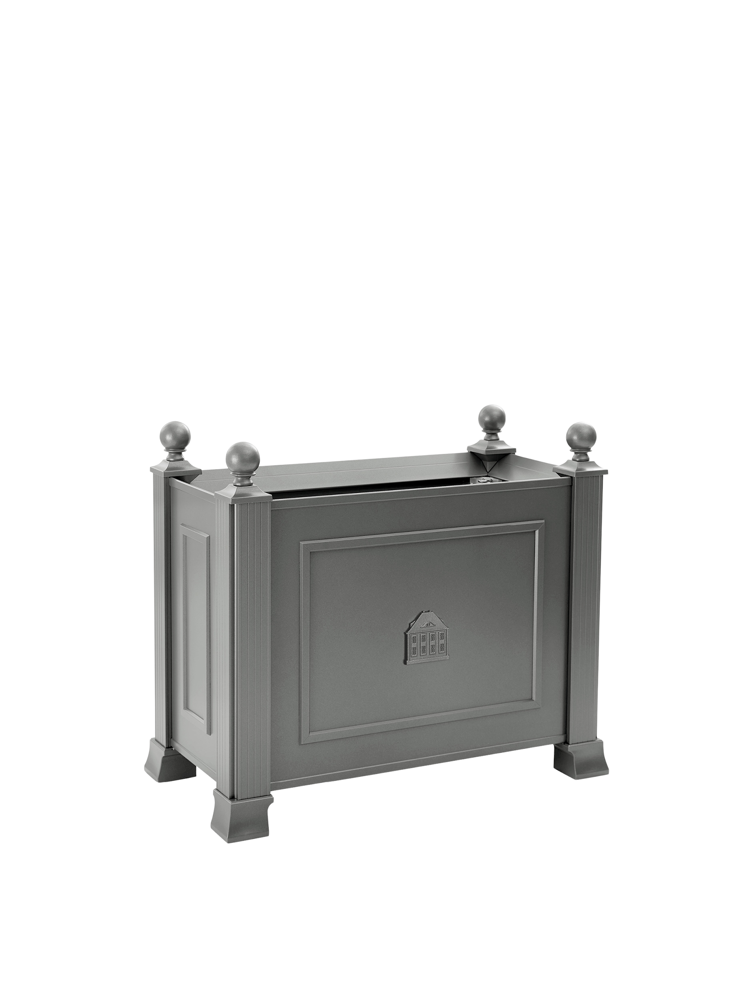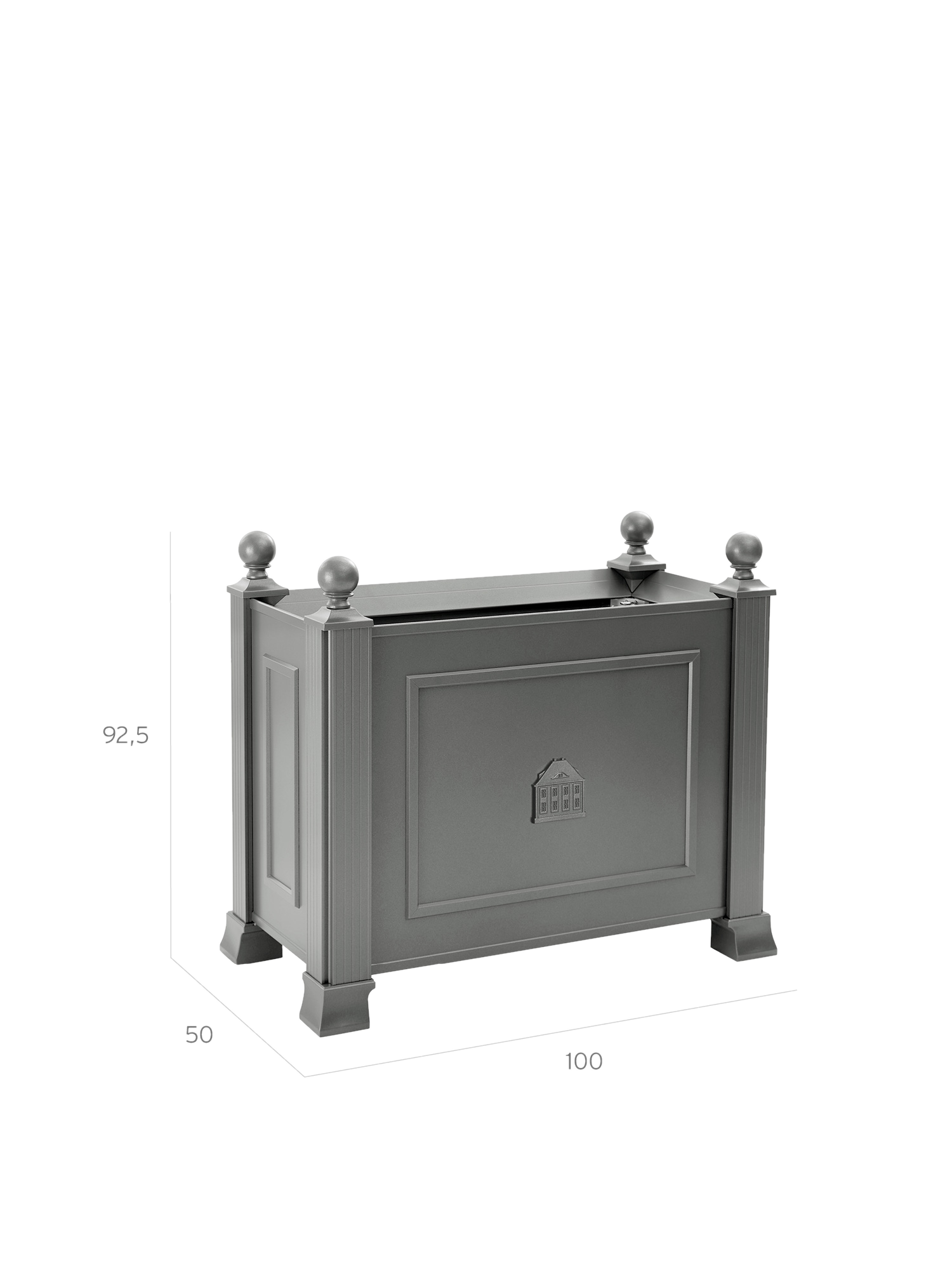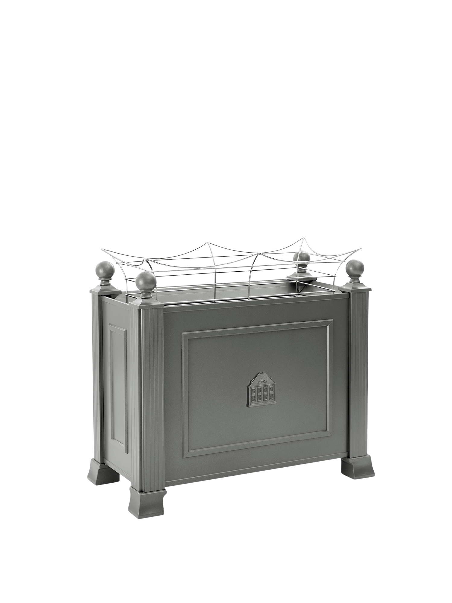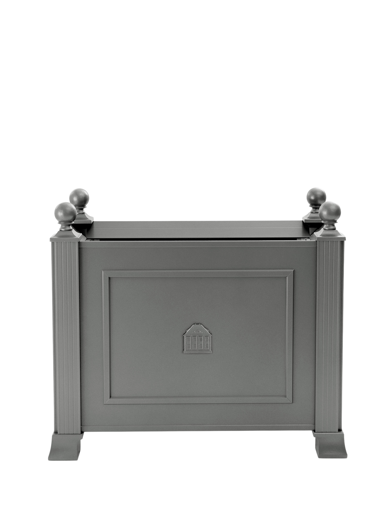 Von Kugeln gekrönt und von starken Füßen getragen demonstrieren die säulenartigen Eckelemente des Grenoble Pflanzkübels Standfestigkeit. Elegant und robust wirkt der Blumenkübel dank des grauen pulverbeschichteten Aluminiums. Ein filigranes Hochrelief auf der Vorderseite zeigt das Garpa Stammhaus.