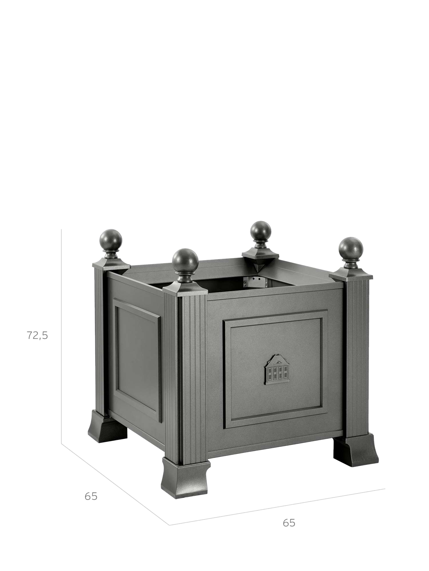 Von Kugeln gekrönt und von starken Füßen getragen demonstrieren die säulenartigen Eckelemente des Grenoble Pflanzkübels Standfestigkeit. Elegant und robust wirkt der Blumenkübel dank des grauen pulverbeschichteten Aluminiums. Ein filigranes Hochrelief auf der Vorderseite zeigt das Garpa Stammhaus.