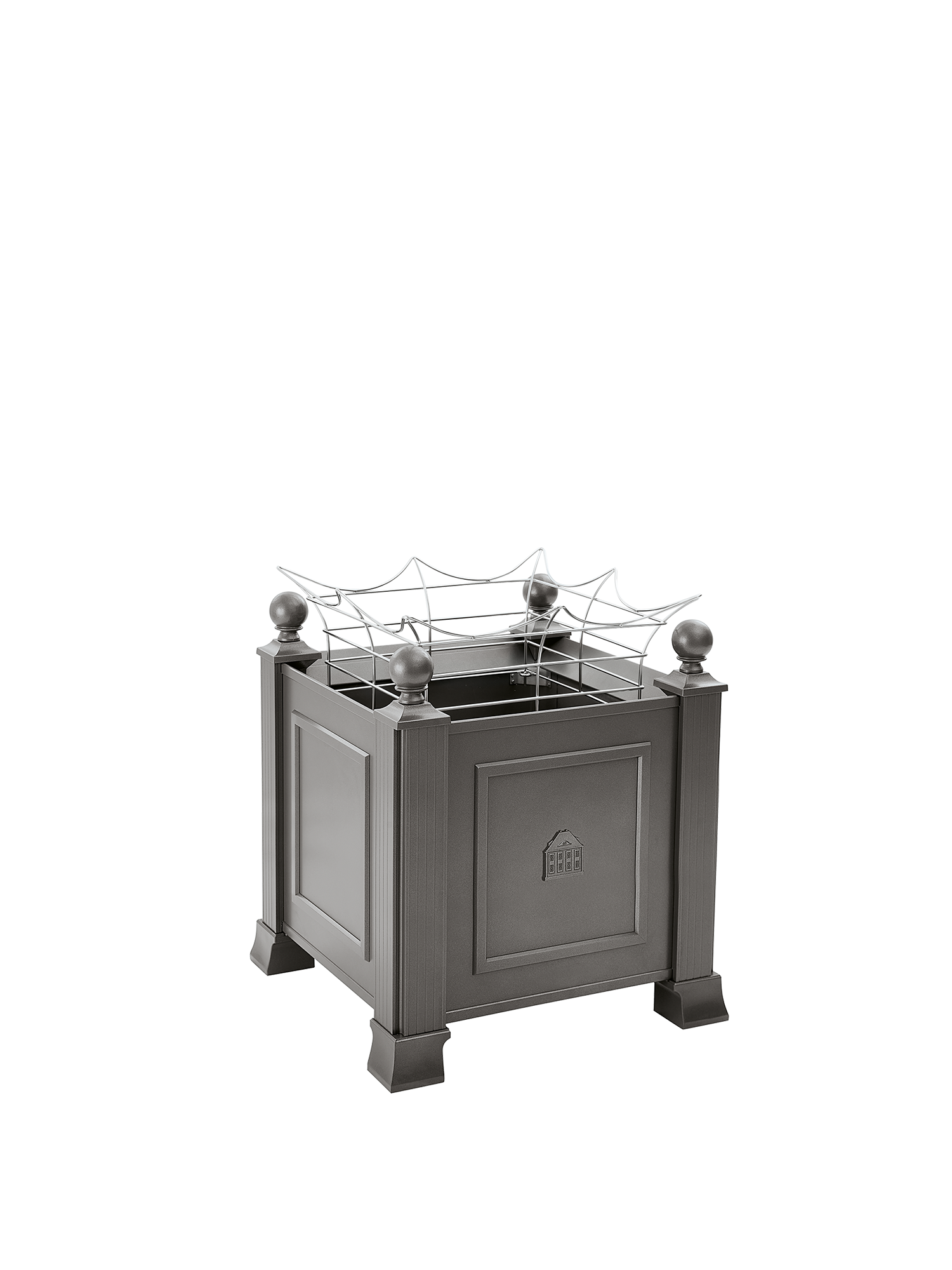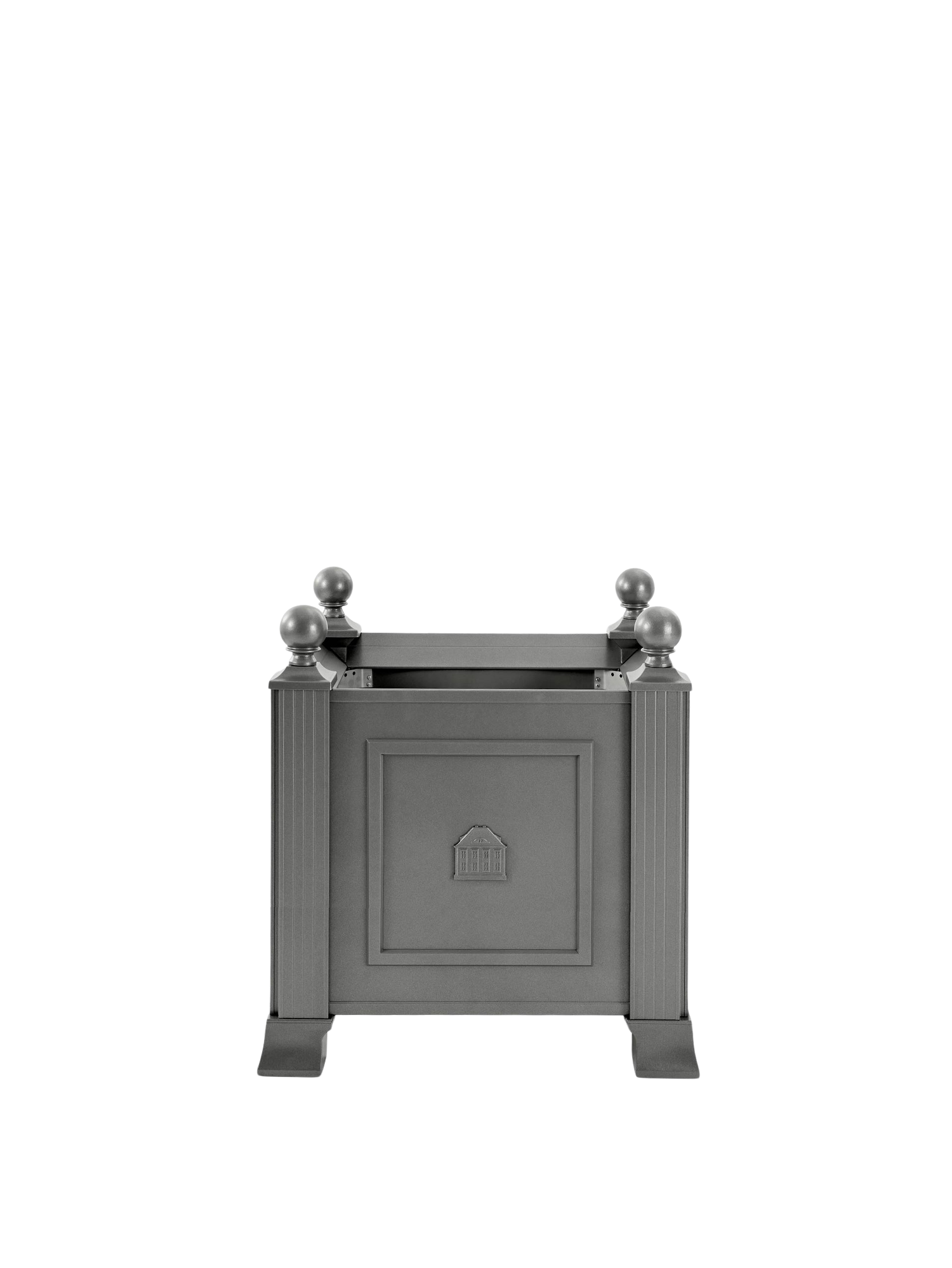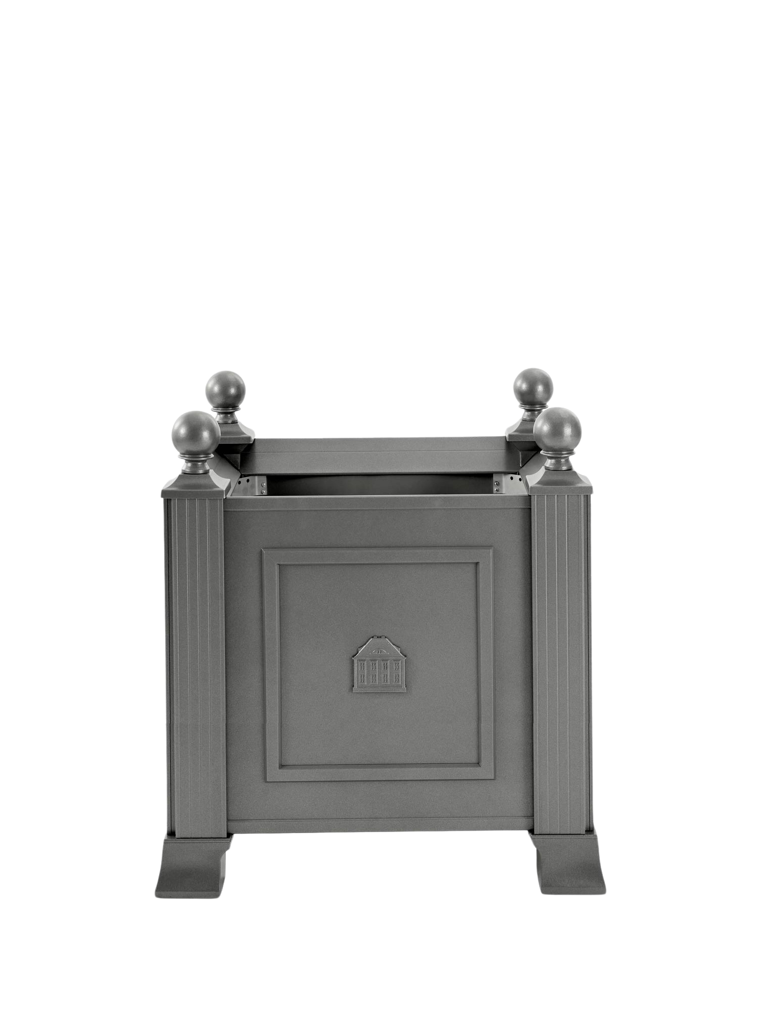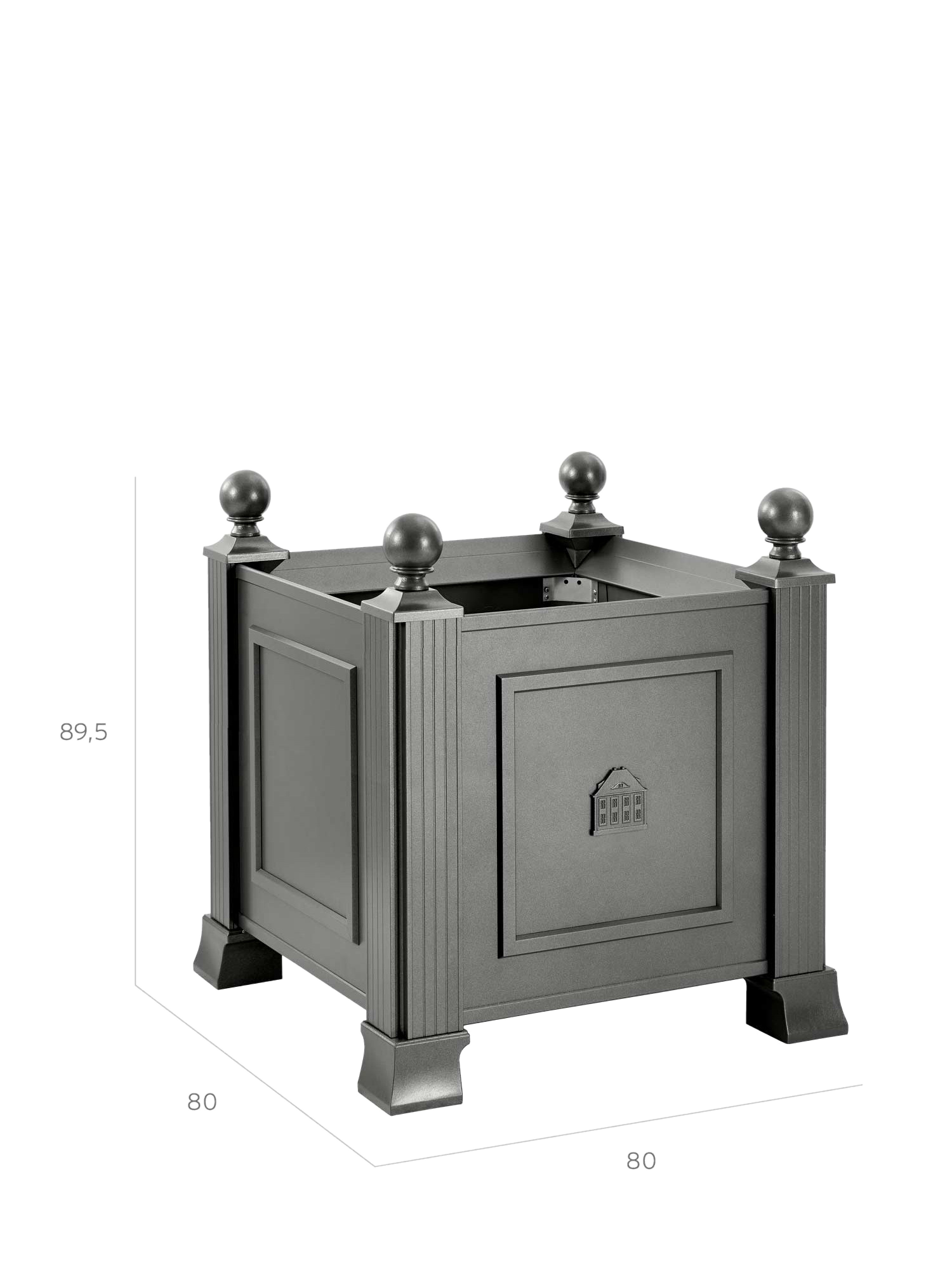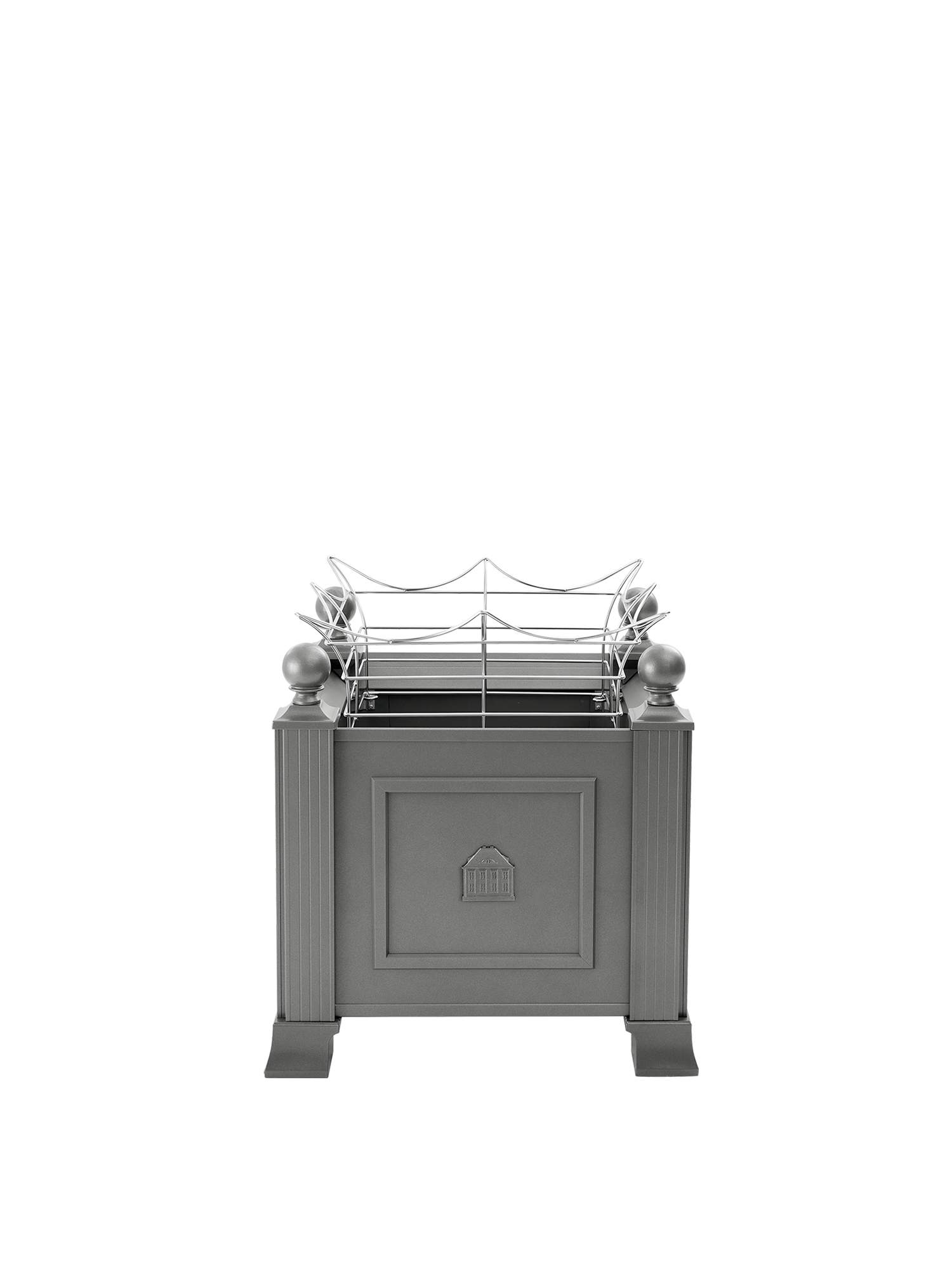 Von Kugeln gekrönt und von starken Füßen getragen demonstrieren die säulenartigen Eckelemente des Grenoble Pflanzkübels Standfestigkeit. Elegant und robust wirkt der Blumenkübel dank des grauen pulverbeschichteten Aluminiums. Ein filigranes Hochrelief auf der Vorderseite zeigt das Garpa Stammhaus.
