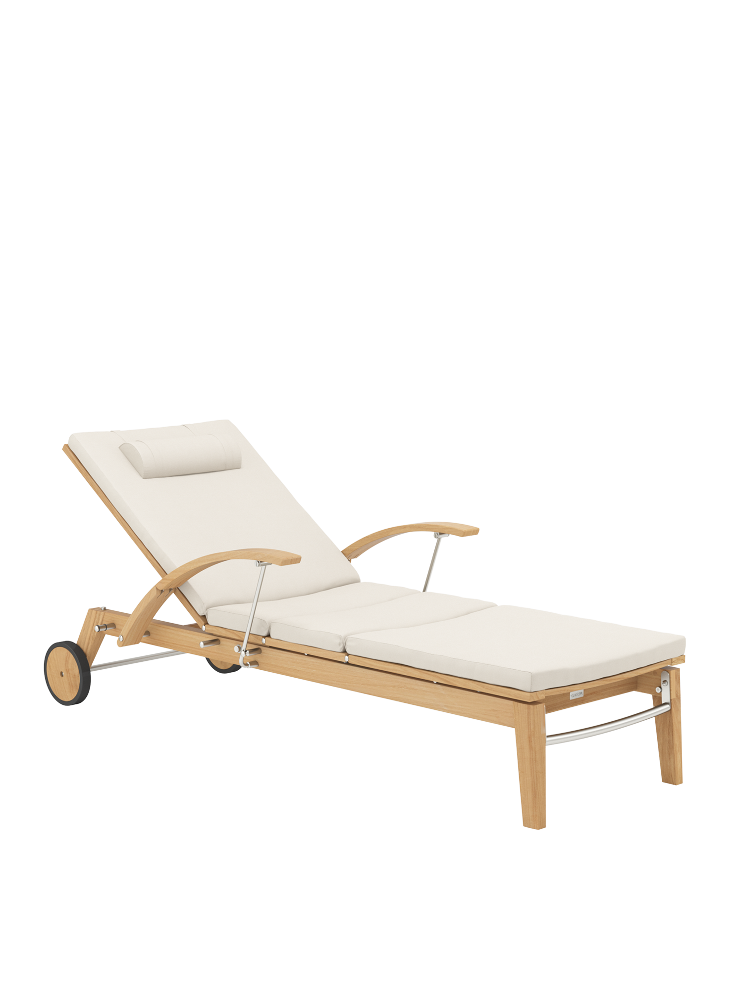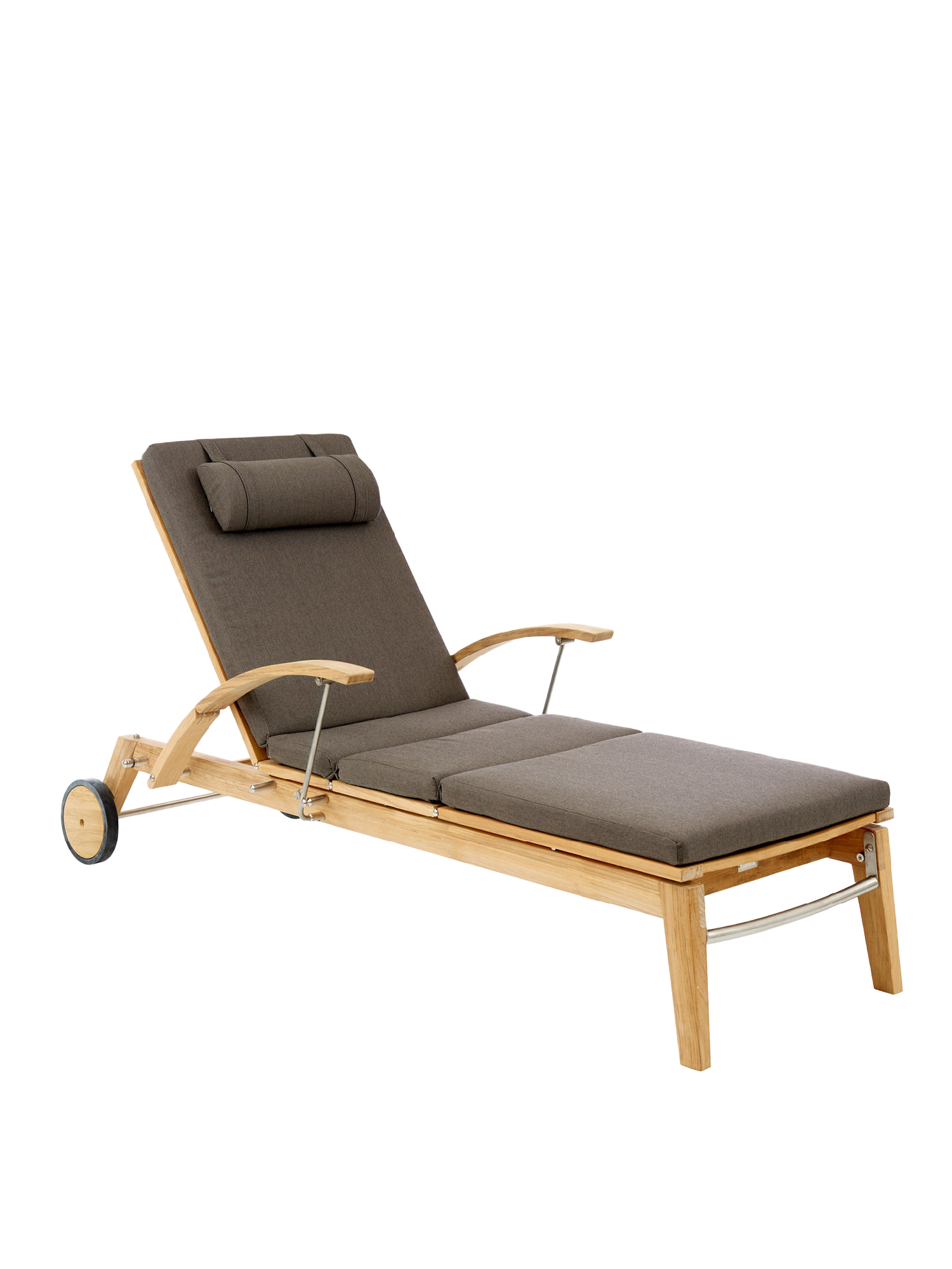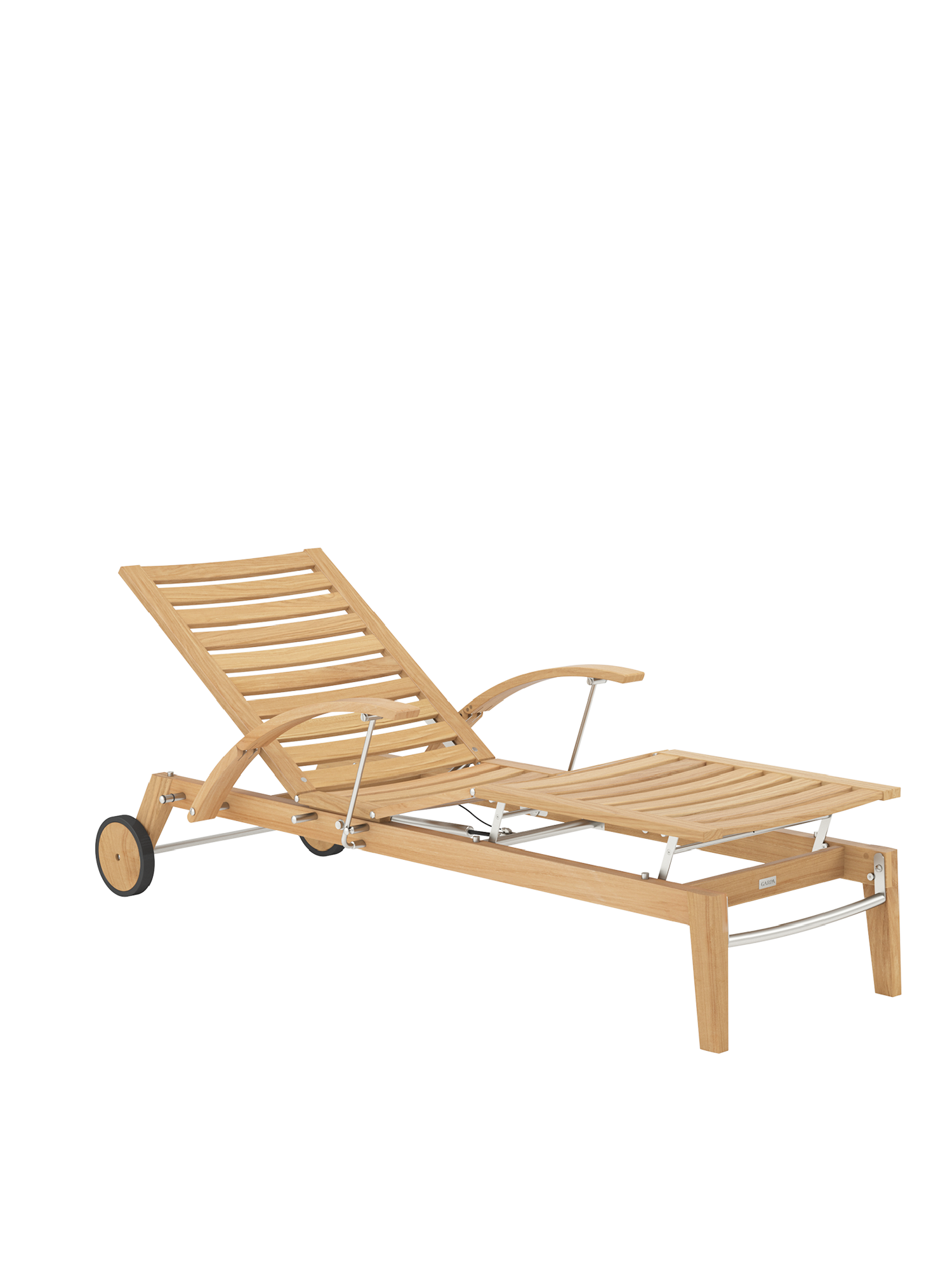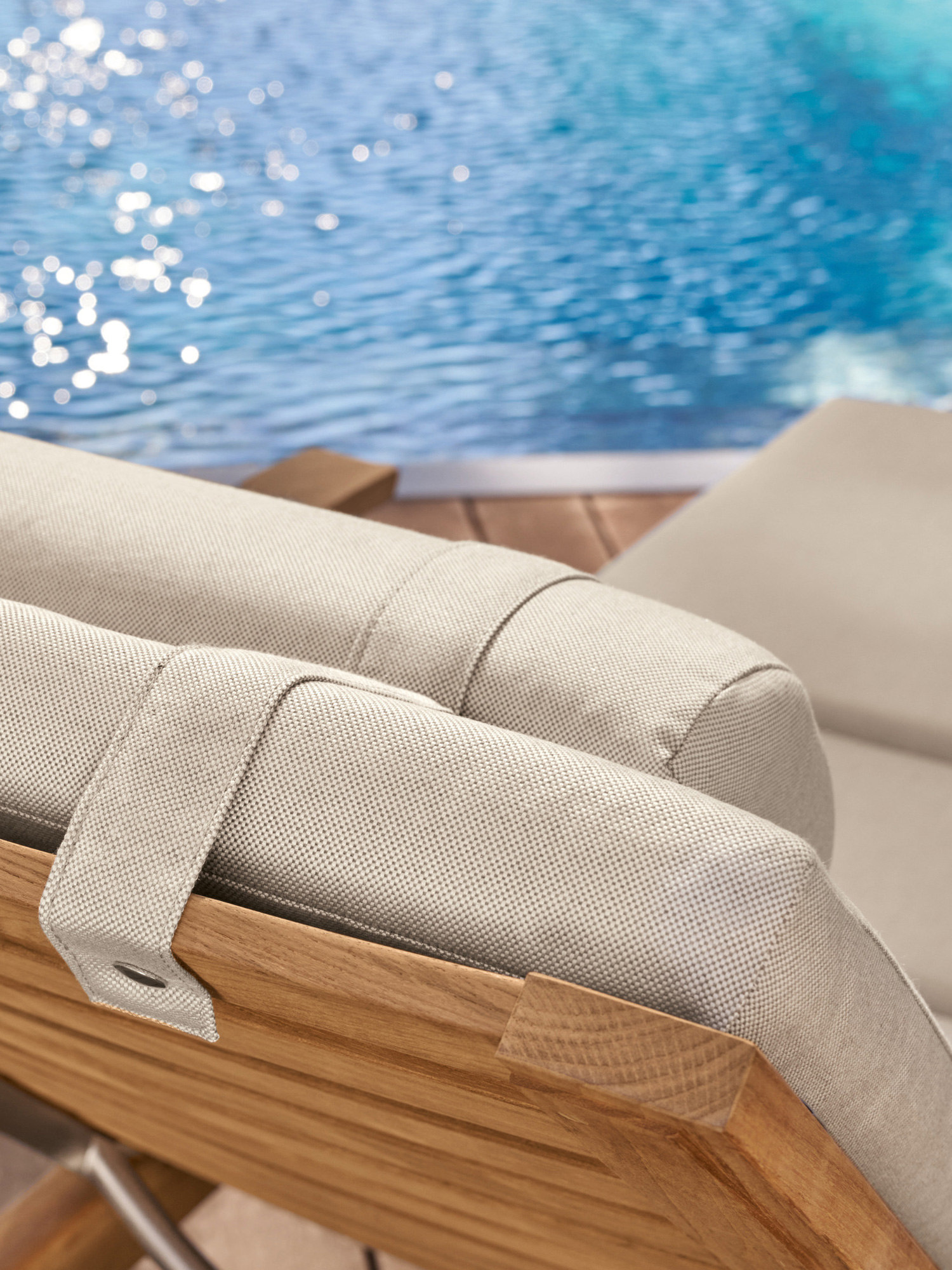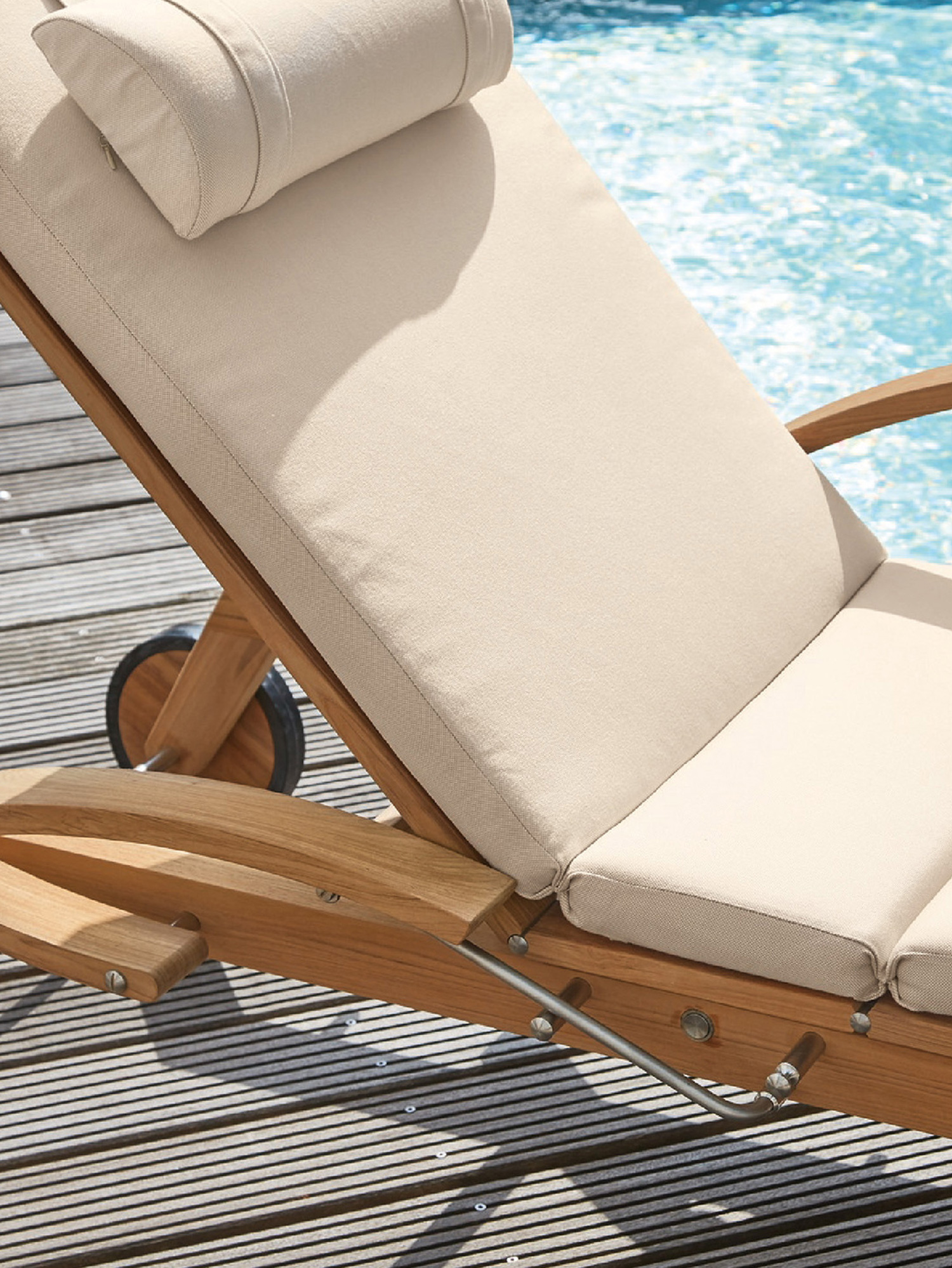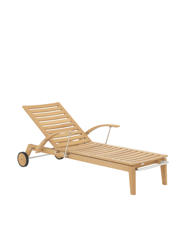 Hamptons vereint schlichte Eleganz mit einem Höchstmaß an Komfort und technischer Raffinesse. Die Rückenlehne der Liege aus Teak lässt sich dank einer Gasdruckfeder einfach per Knopfdruck bedienen. Dezent unter dem Sitz verborgen übernimmt sie die stufenlose Einstellung der gewünschten Liegeposition. Zum bequemen Aus- und Einstieg können die Armlehnen einzeln nach hinten geklappt werden.