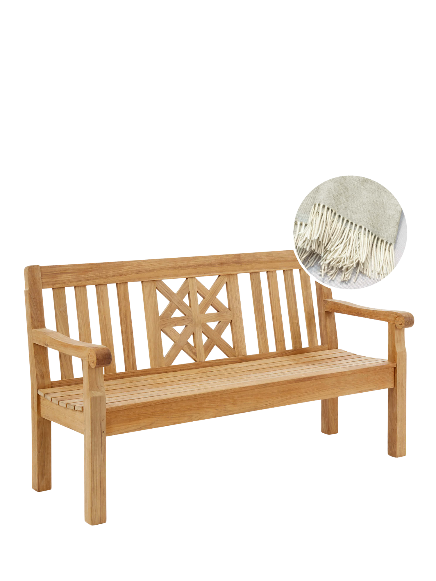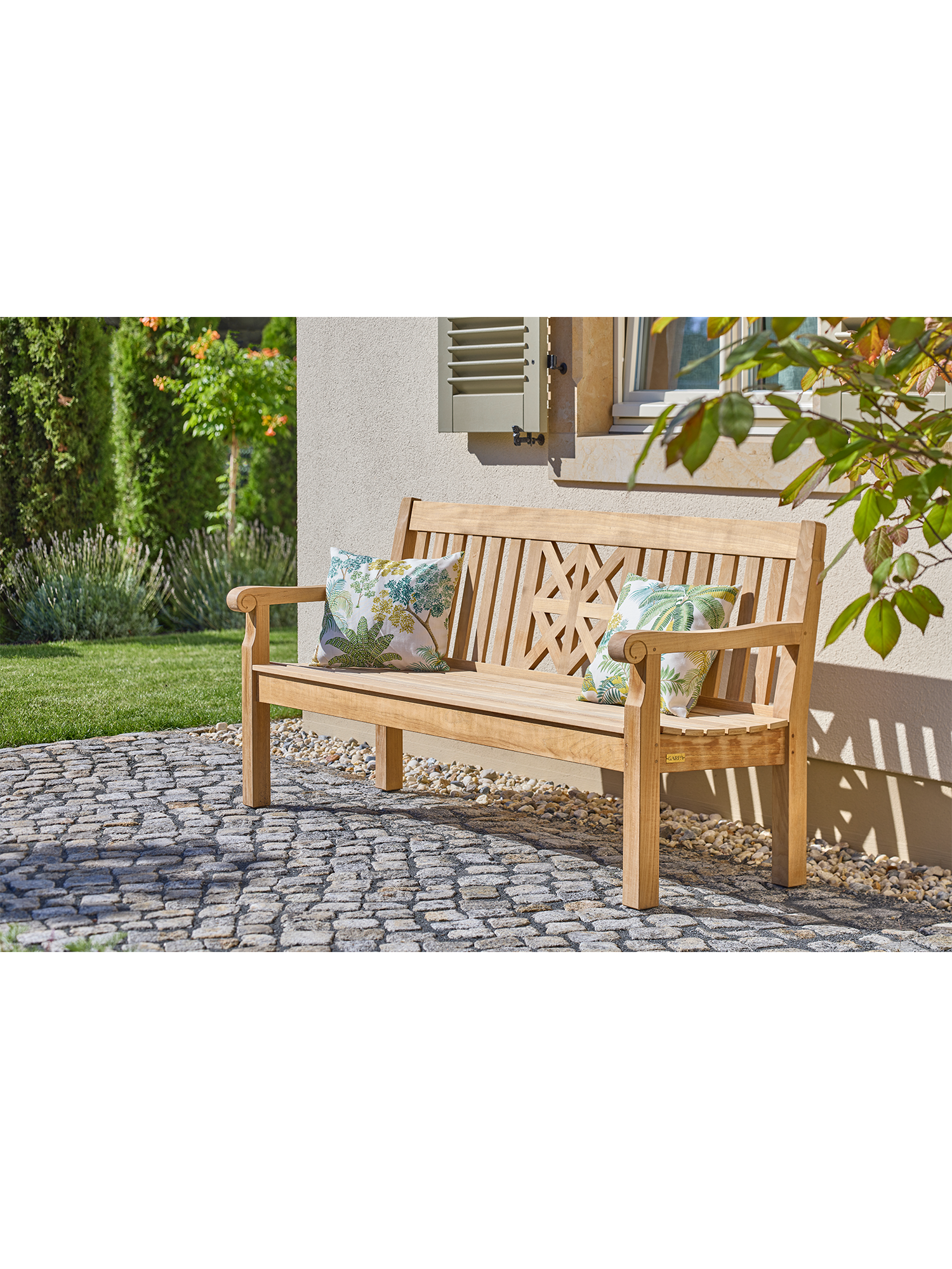 Mit ihrer großzügig bemessenen Sitzfläche mit eng gestellten Leisten aus Teak und einer ergonomisch geneigten Rückenlehne ermöglichen die Gartenbänke der Serie Hestercombe eine angenehm entspannte Haltung. Alle Sprossen sind eingezapft und gehen sanft in die Querstrebe über, so dass keine Unebenheiten spürbar werden.