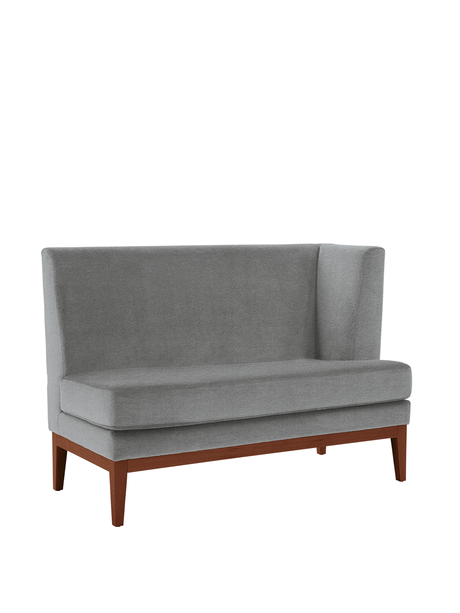 Die moderate Tiefe des Sofas mit hoher Rückenlehne lädt zum komfortablen aufrechten Sitzen ein: an festlicher Abendtafel oder zum entspannten Dinner. Mit jeweils einer Armlehne rechts bzw. links können zwei Hyde Dining Sofas als attraktives Paar nebeneinander an den passenden Esstisch gestellt werden. Lässt man zwischen ihnen einen Abstand, bietet dieser Bewegungsfreiheit, ohne dass auch alle anderen Gäste aufstehen müssen. Die Hyde Sofas sind mit einem samtigen Kunstfaser-Velours in Grau bezogen. Das Gestell besteht aus geöltem amerikanischem Nussbaum.