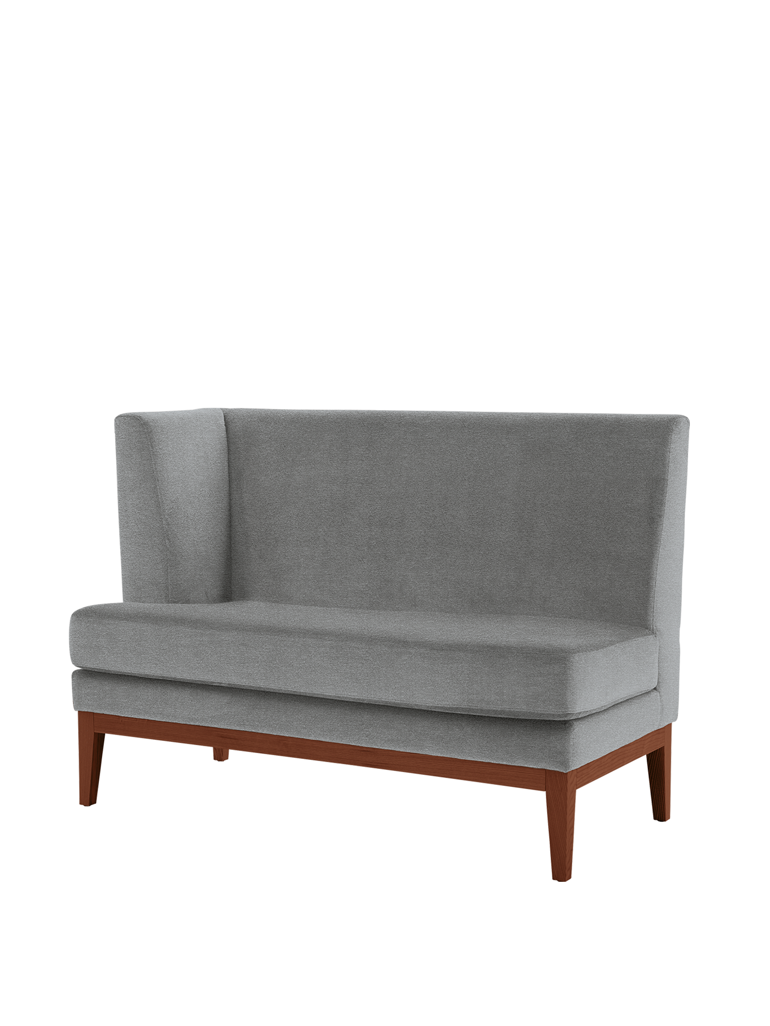 Die moderate Tiefe des Sofas mit hoher Rückenlehne lädt zum komfortablen aufrechten Sitzen ein: an festlicher Abendtafel oder zum entspannten Dinner. Mit jeweils einer Armlehne rechts bzw. links können zwei Hyde Dining Sofas als attraktives Paar nebeneinander an den passenden Esstisch gestellt werden. Lässt man zwischen ihnen einen Abstand, bietet dieser Bewegungsfreiheit, ohne dass auch alle anderen Gäste aufstehen müssen. Die Hyde Sofas sind mit einem samtigen Kunstfaser-Velours in Grau bezogen. Das Gestell besteht aus geöltem amerikanischem Nussbaum.