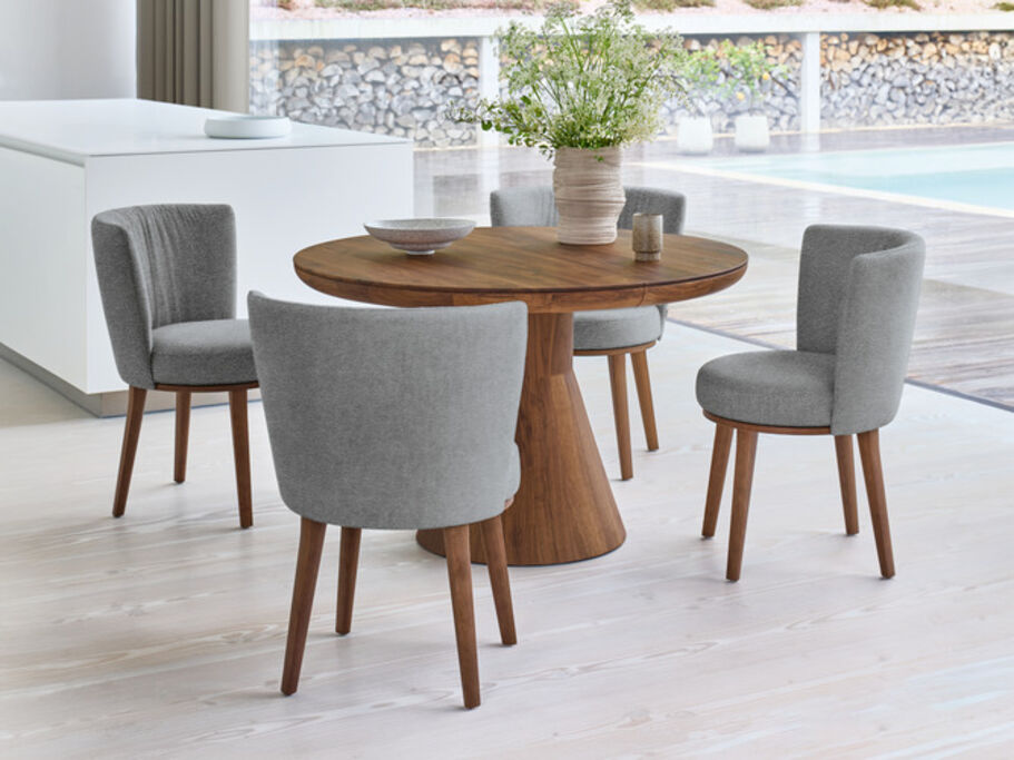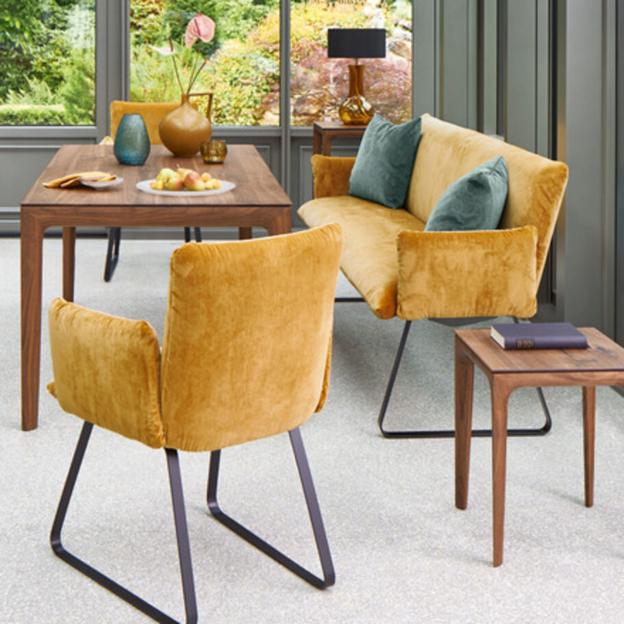 Für große Tafeln und vertraute Runden: Stühle und Bänke aus wohnlichen Stoffen und edlen Hölzern laden zum Tischgespräch.