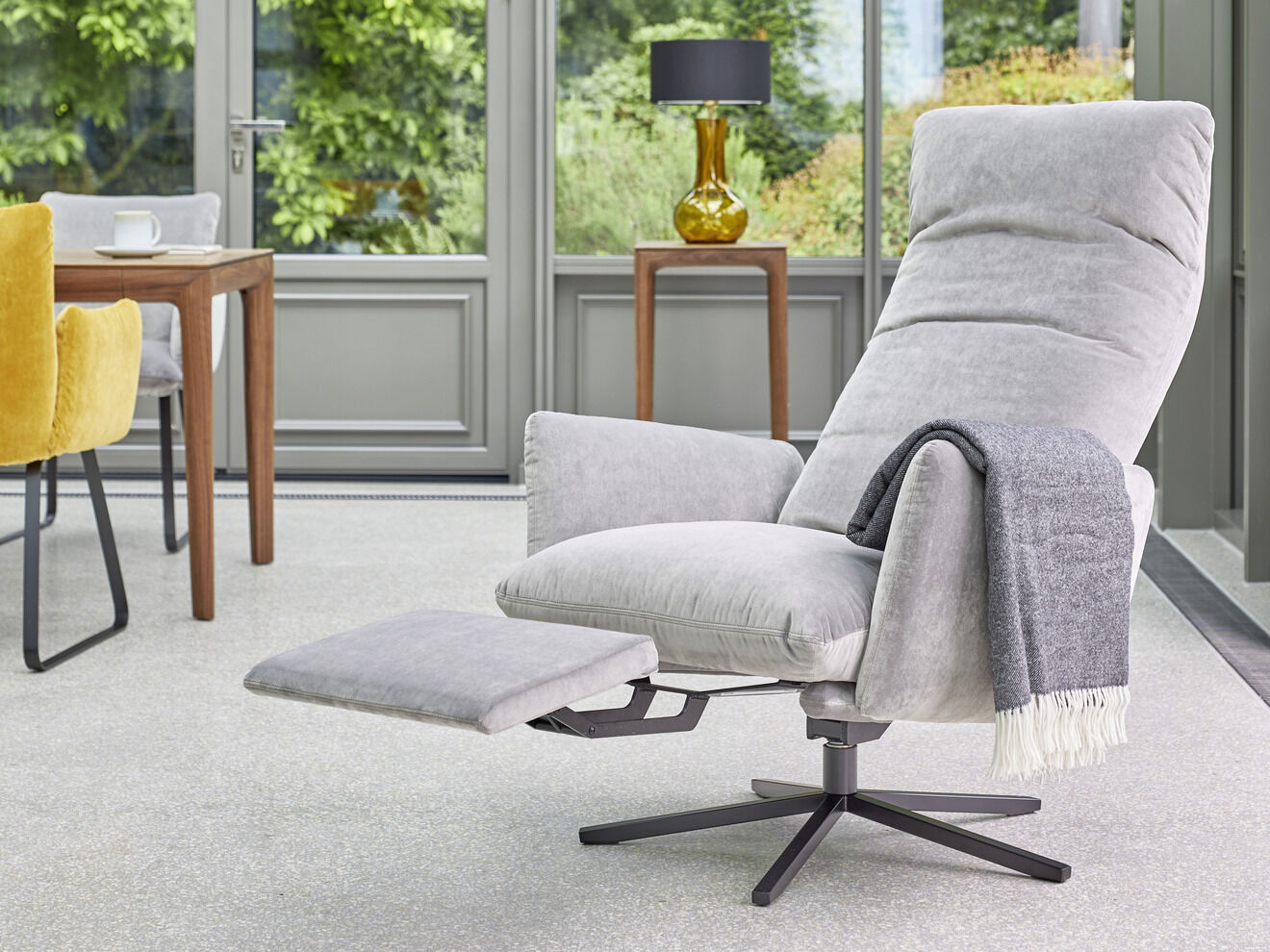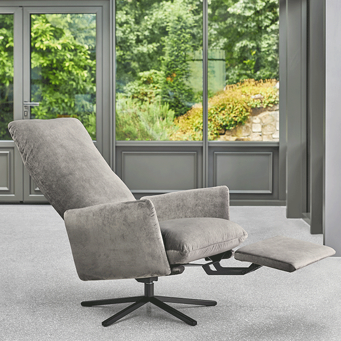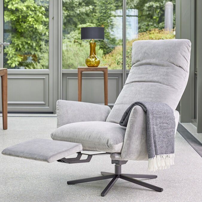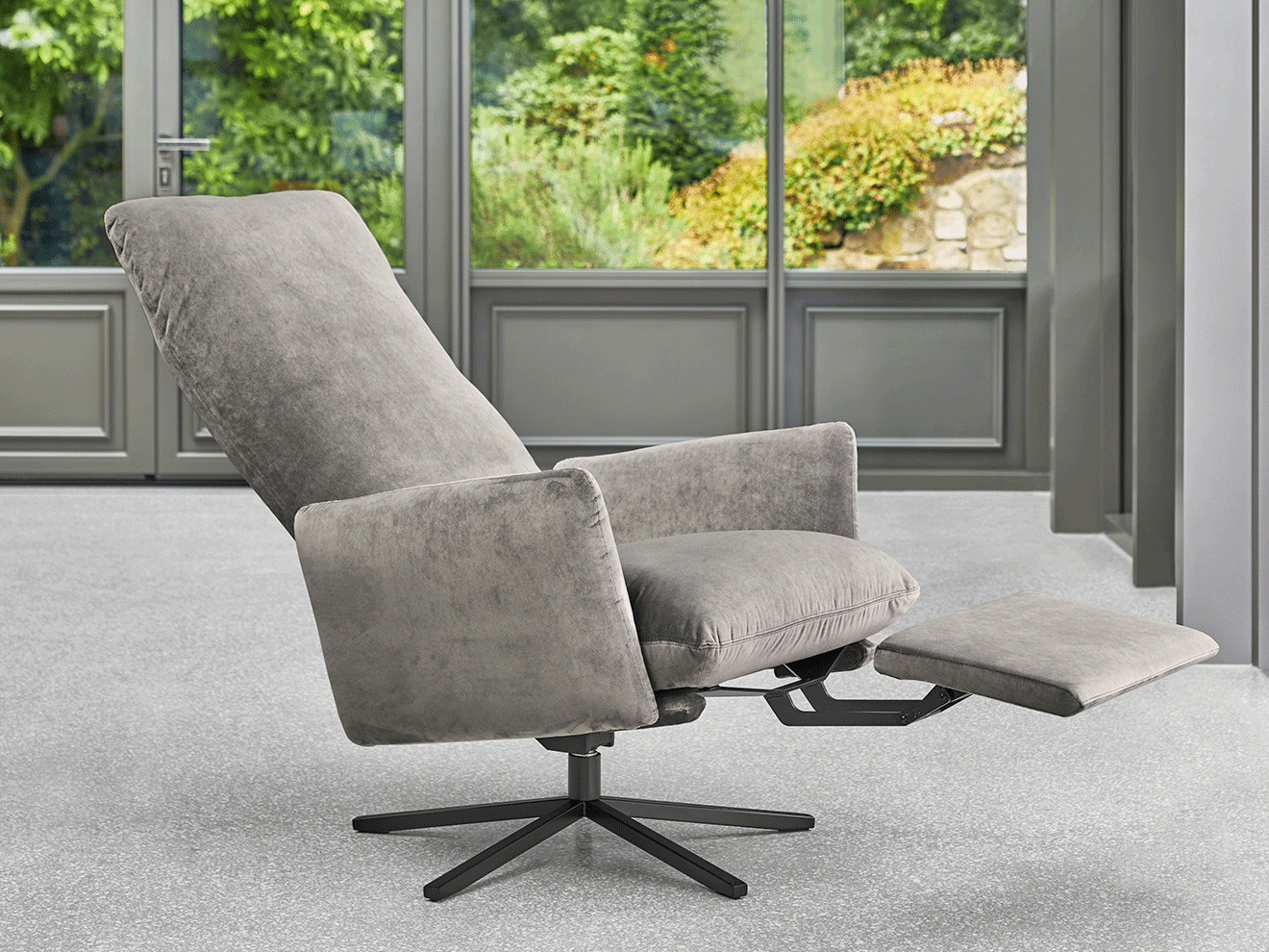 Durch Verlagerung des Körpergewichts findet der glückliche Besitzer zu jeder gewünschten Sitz- oder Liegeposition und fixiert sie im Handumdrehen mithilfe eines Hebels. Eine manuell ausziehbare Fußstütze und ein mehrfach verstellbares Kopfteil vollenden den Komfort. Auf Anfrage ist der Sessel in weiteren Farben erhältlich.