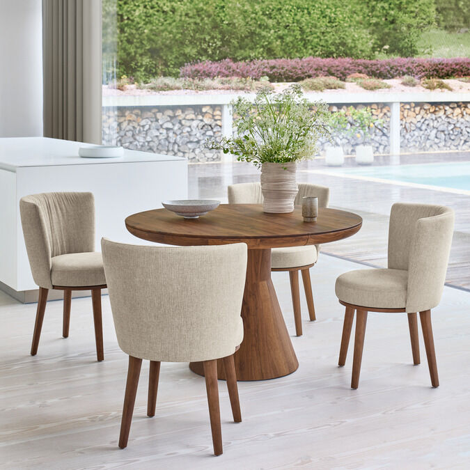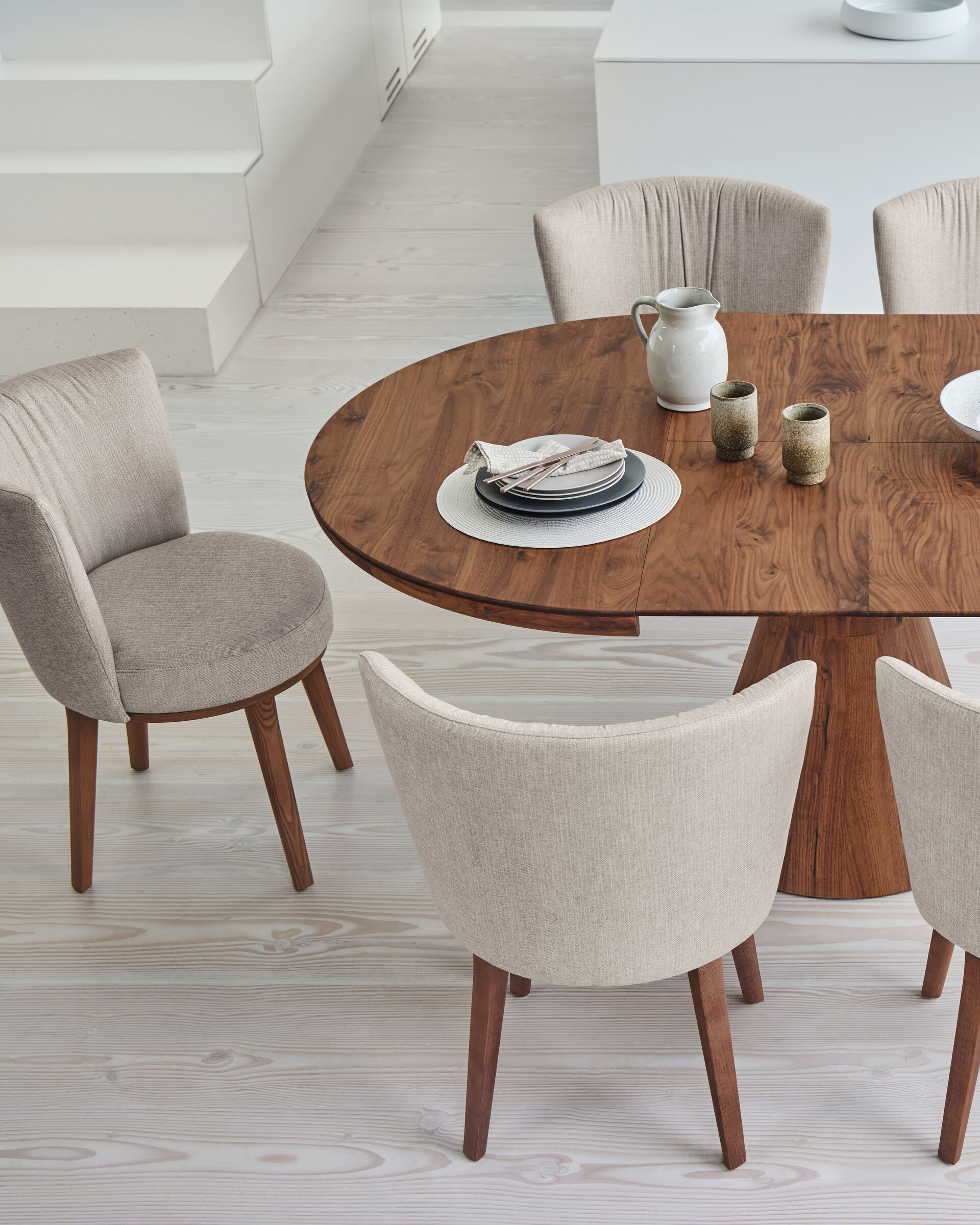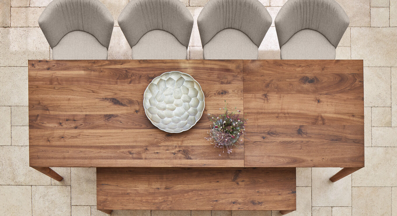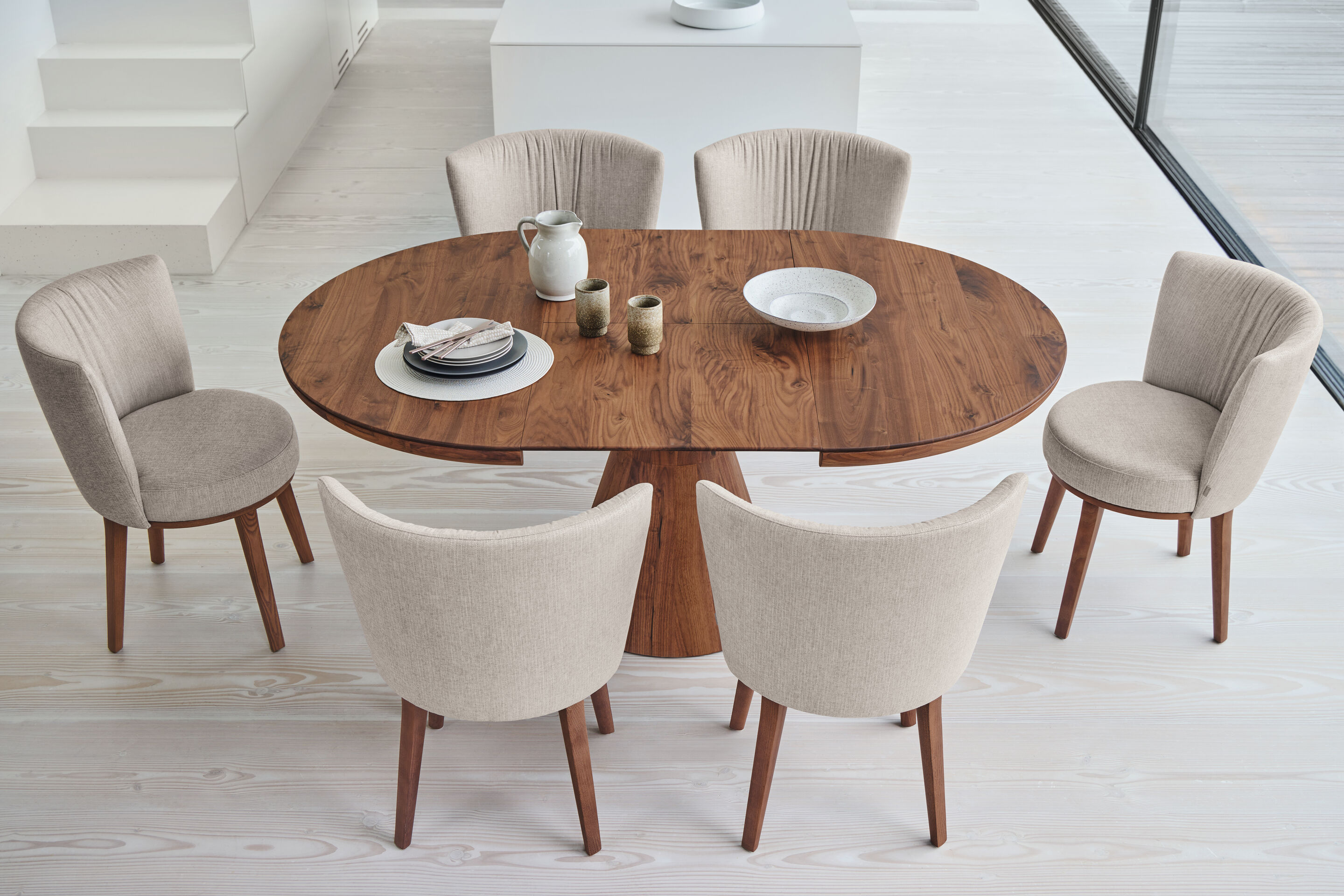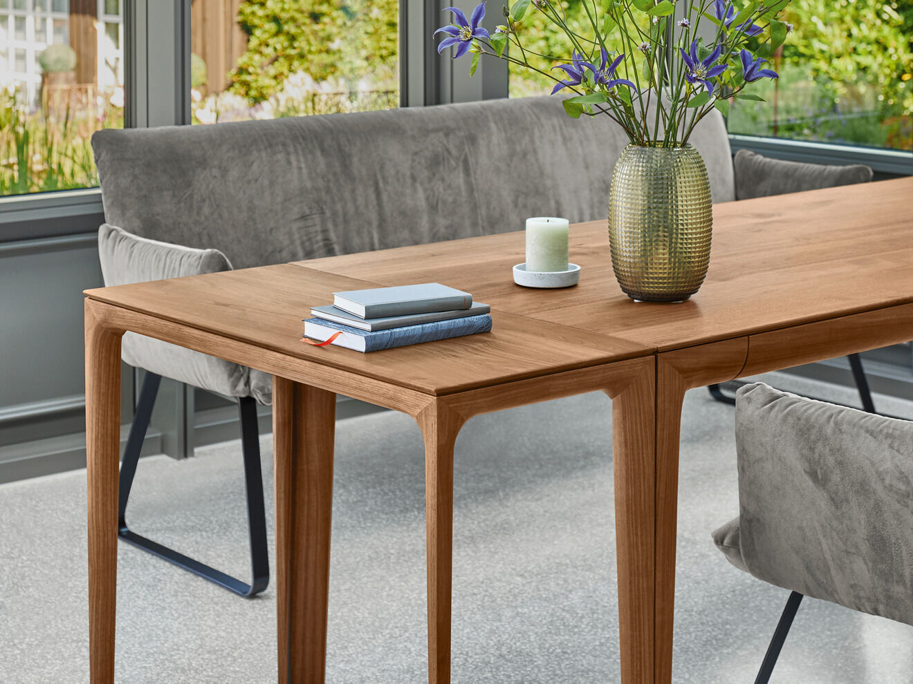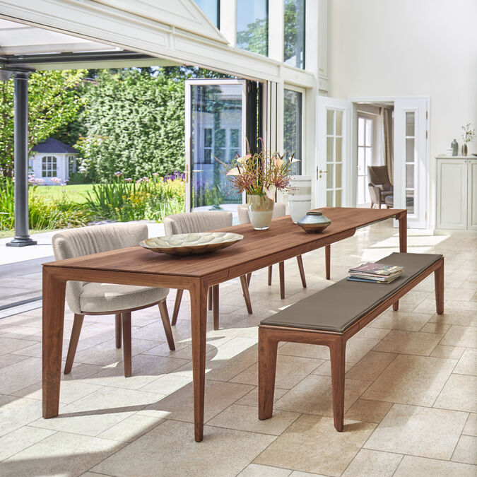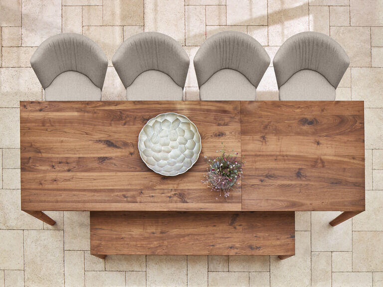 An Tischen, die sich mit wenig Aufwand verlängern lassen, werden auch Überraschungsgäste entspannt willkommen geheißen. Die großzügigen, ausziehbaren Esstische der Kollektion versammeln Familie und Freunde zur geselligen Runde.