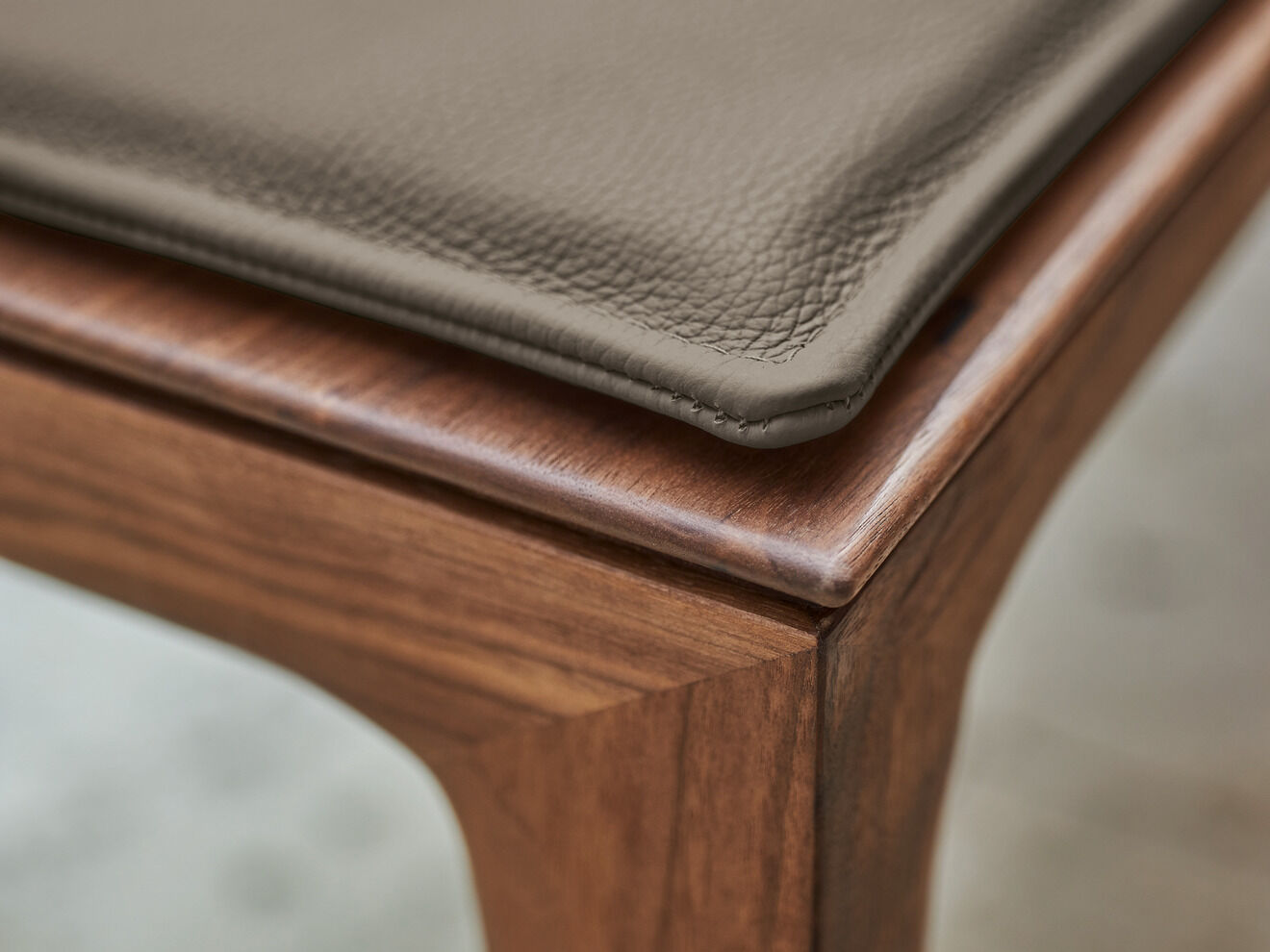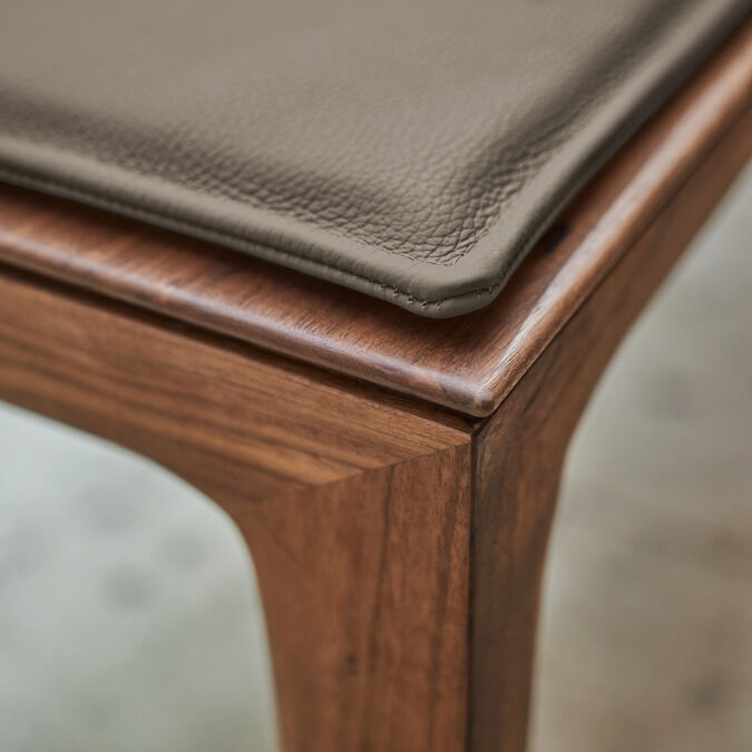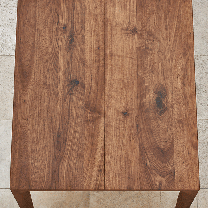 Der rechteckige, ausziehbare Tavo Tisch bietet viel Beinfreiheit. Die aufwendige Verarbeitung amerikanischen Nussbaums zeugt von bewundernswerter Handwerkskunst: Eine umlaufende Schattenfuge lässt das Design filigran, fast schwebend erscheinen, die Beine sind nach innen von Hand gerundet. Mit seiner ausdrucksstarken Maserung und den charakteristischen Asteinschlüssen macht das überaus angenehm zu berührende, geölte Holz jedes Exemplar zum Unikat.