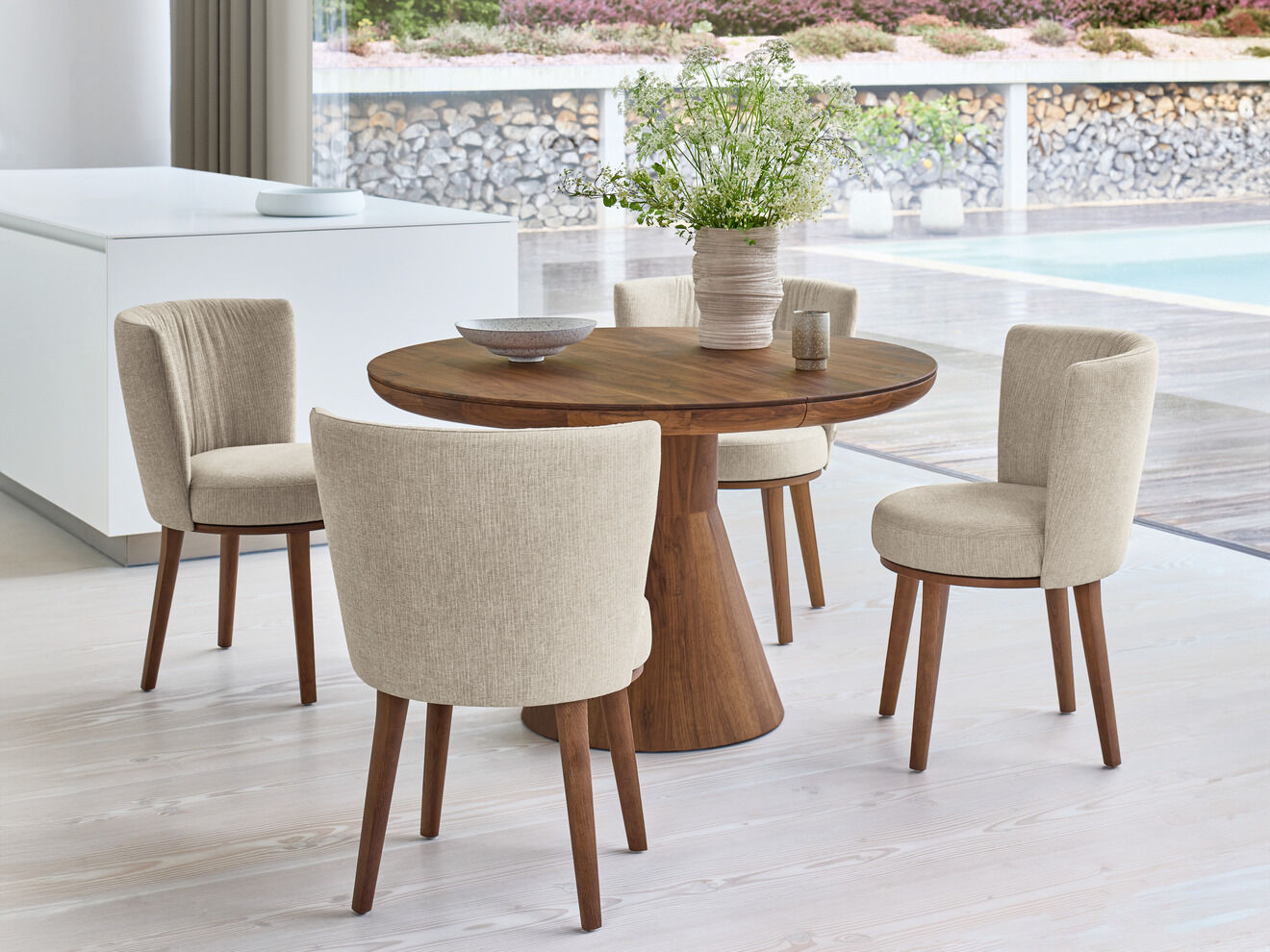 An diesem runden Tisch können vier Personen bequem sitzen. Wird er ausgezogen, ist sogar Platz für sechs. Der kräftige konische Mittelfuß lässt dafür genügend Freiraum. Aus massivem amerikanischem Nussbaum gearbeitet, bildet der Tisch den so dekorativen wie funktionalen Mittelpunkt jeder Frühstücks-, Tee- oder Dinnergesellschaft. Die geschmeidig abgerundeten Kanten und das samtig geölte Holz machen jede Berührung zum sinnlichen Erlebnis. Ein leicht zu handhabender Ausziehmechanismus erlaubt es, sein Maß von 120 Zentimeter Durchmesser um 60 Zentimeter zum Oval zu verlängern.