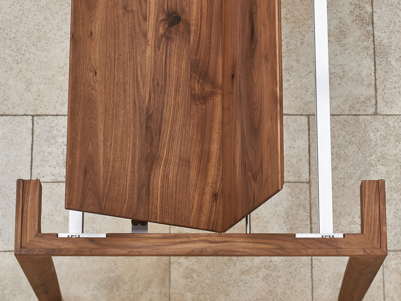 Die stattliche Länge des Tavo Esstischs von 180 Zentimetern lässt sich bei Bedarf mühelos um einen weiteren Meter ergänzen. Die natürliche Maserung des amerikanischen Nussbaums – eine bei jedem Tisch einzigartige Komposition der Natur – variiert in der Verlängerung; eine durchgehend einheitliche Maserung ist aber als Spezialanfertigung möglich. Alle Kanten des massiven Möbels werden von Hand geschliffen. Die Eingriffe für den Schmetterlingsmechanismus sind angenehm mit Leder ausgelegt. Schienen und Kugellager werden solide aus Aluminium und Edelstahl gefertigt.