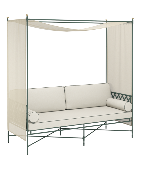 Der separat erhältliche Baldachin bereichert den Zweisitzer. Durch die angenähten Klettverschlüsse kann der bei 40 Grad waschbare Stoff im stilvollen Beigeton flexibel am Gestänge befestigt werden, das aus pulverbeschichtetem Edelstahl besteht und dekorative Knäufe aus massivem Messing hat.