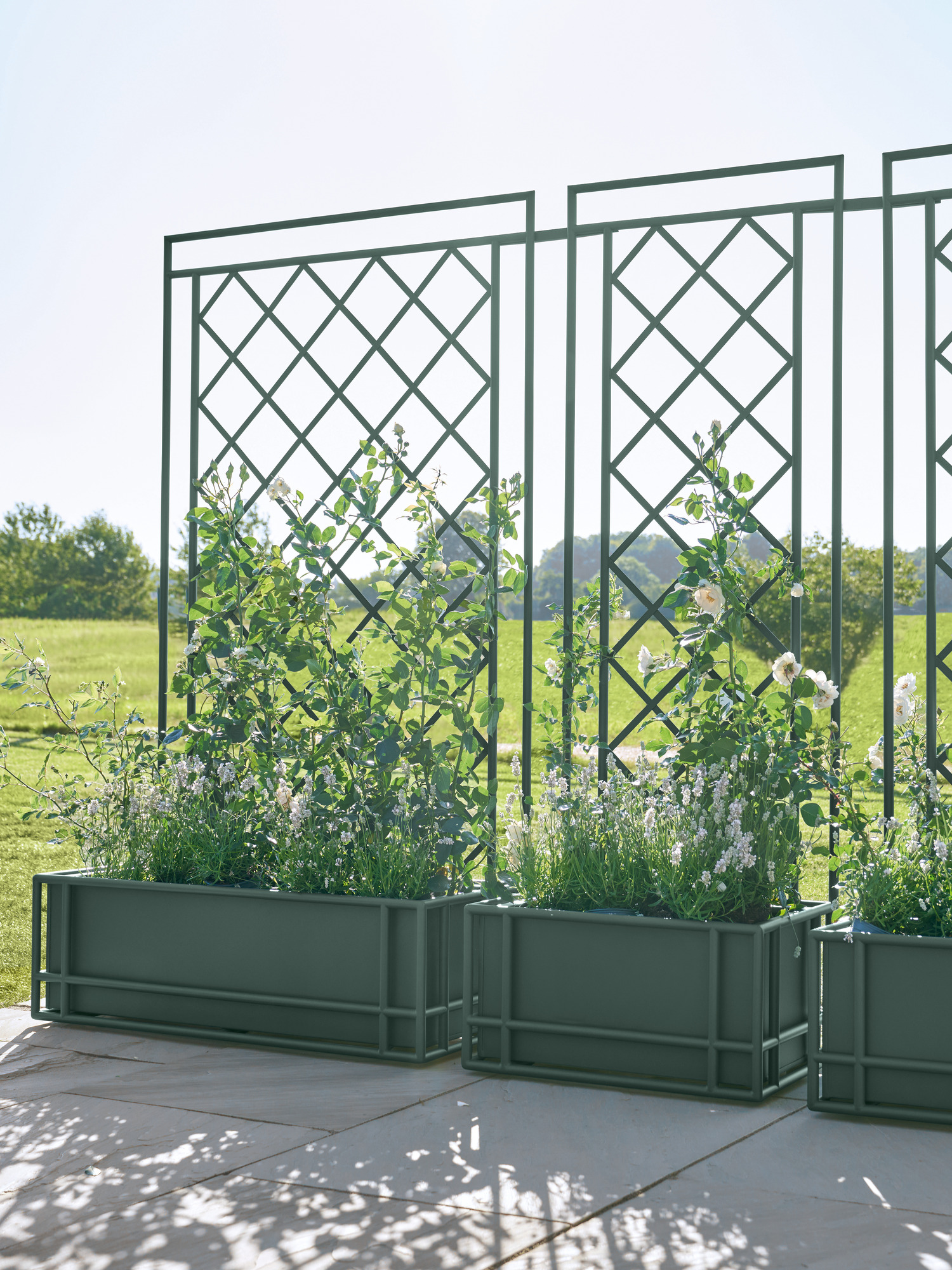 Die Pflanzkübel und Rankwände der Kasal Kollektion bestehen aus pulverbeschichtetem Aluminium. Mit im 2er-Set erhältlichen Verbindungsstücken können sie freistehend kombiniert werden, um Wilden Wein, Kletterhortensien oder Clematis hochwachsen zu lassen.