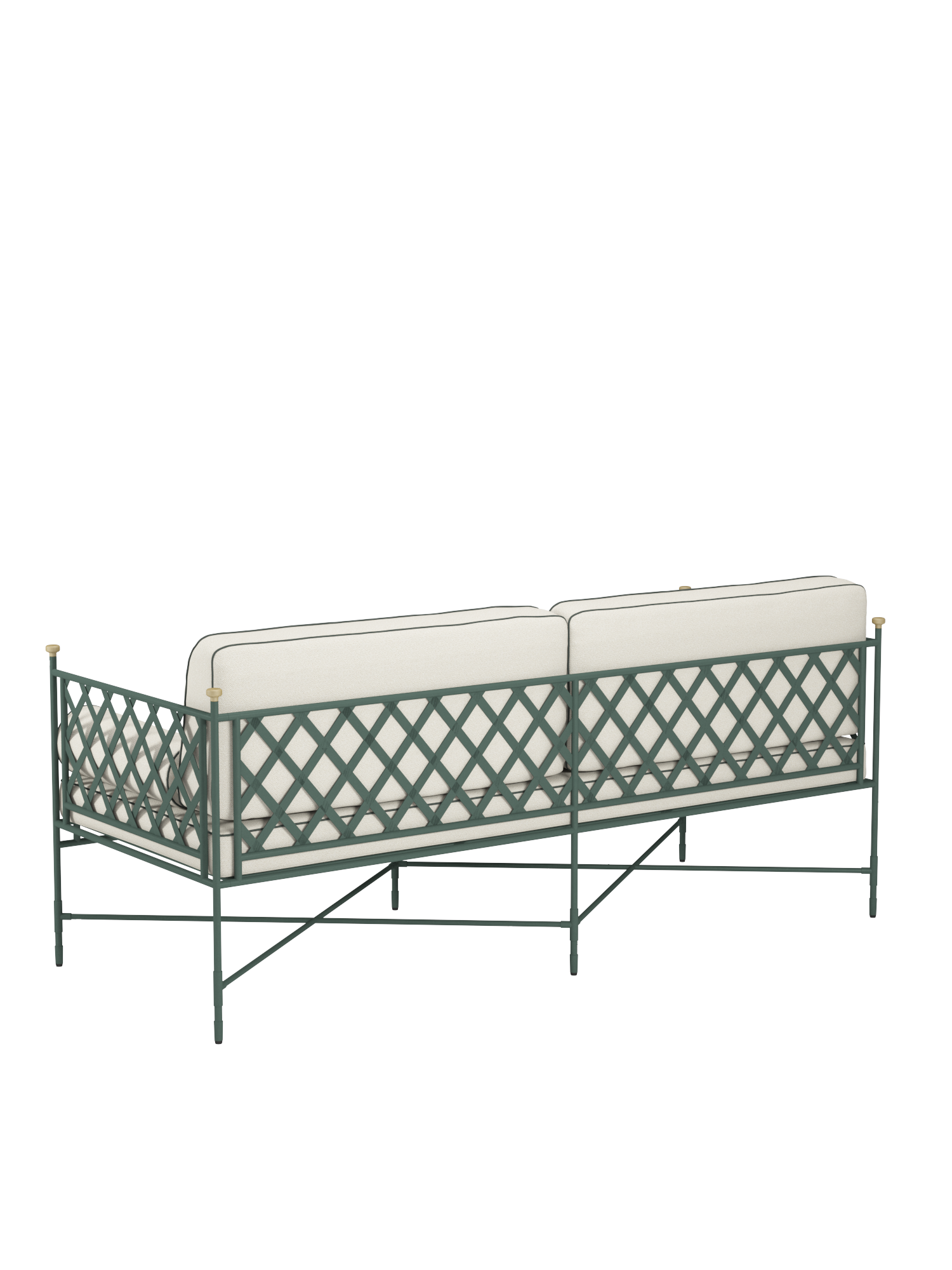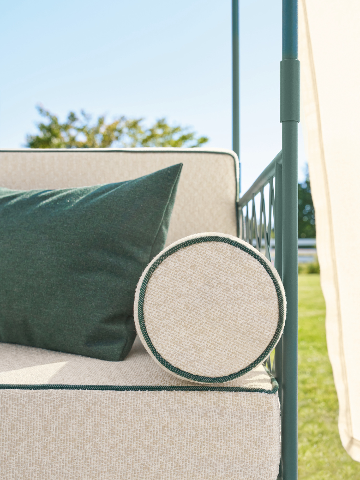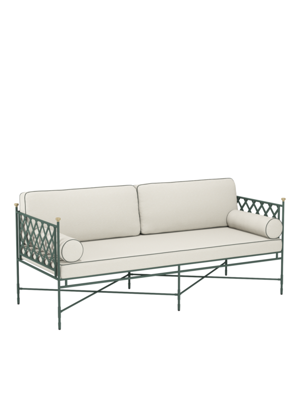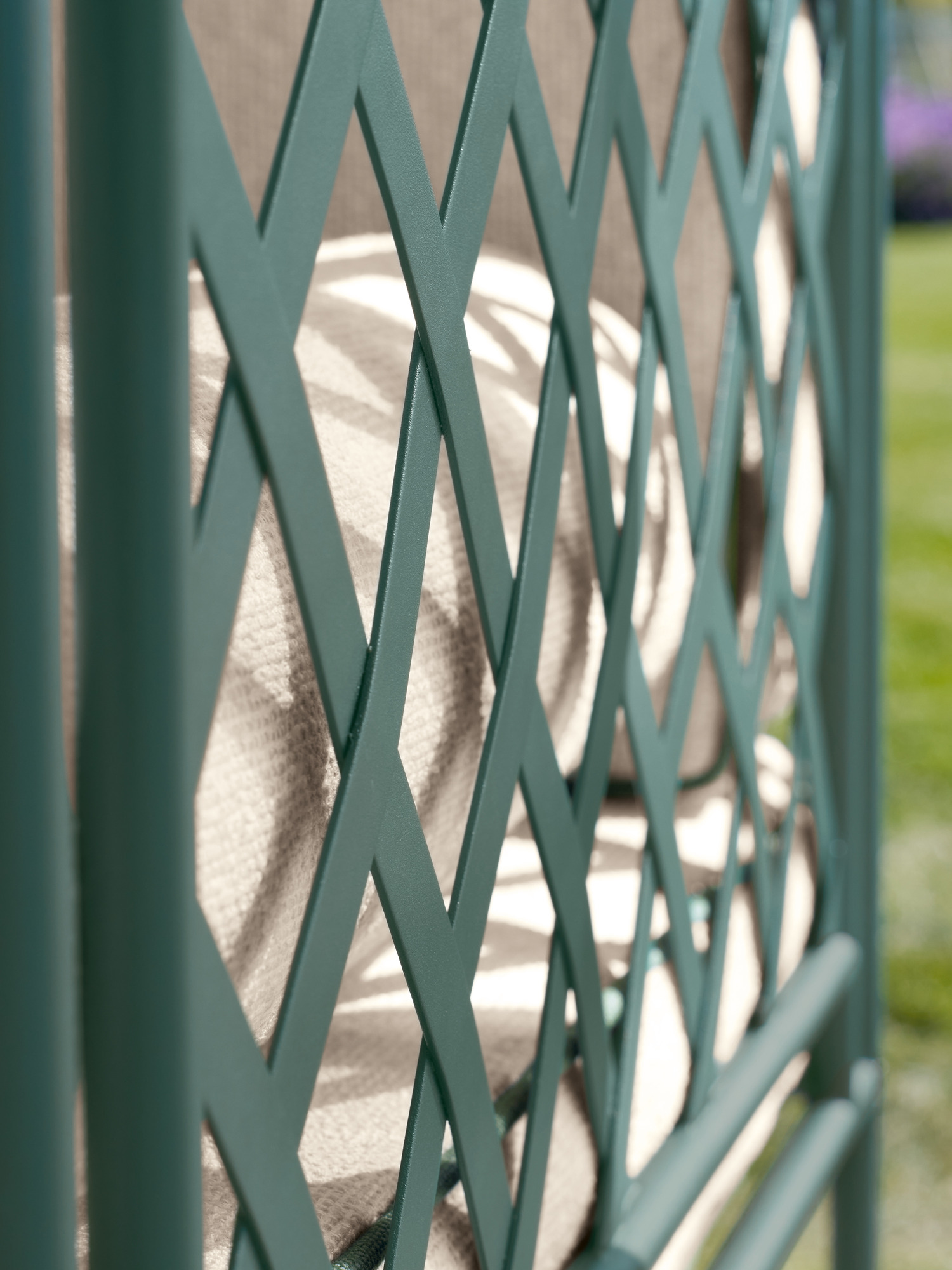 Die zum Lieferumfang gehörenden Auflagen im Dessin Limestone/Diopsid zeichnen sich durch Keder aus, die mit dem Grünton der Pulverbeschichtung harmonieren. Wer sich bequem zurücklehnen möchte, greift auf passende Dekokissen in den Maßen 30 x 50 oder 50 x 50 zurück.