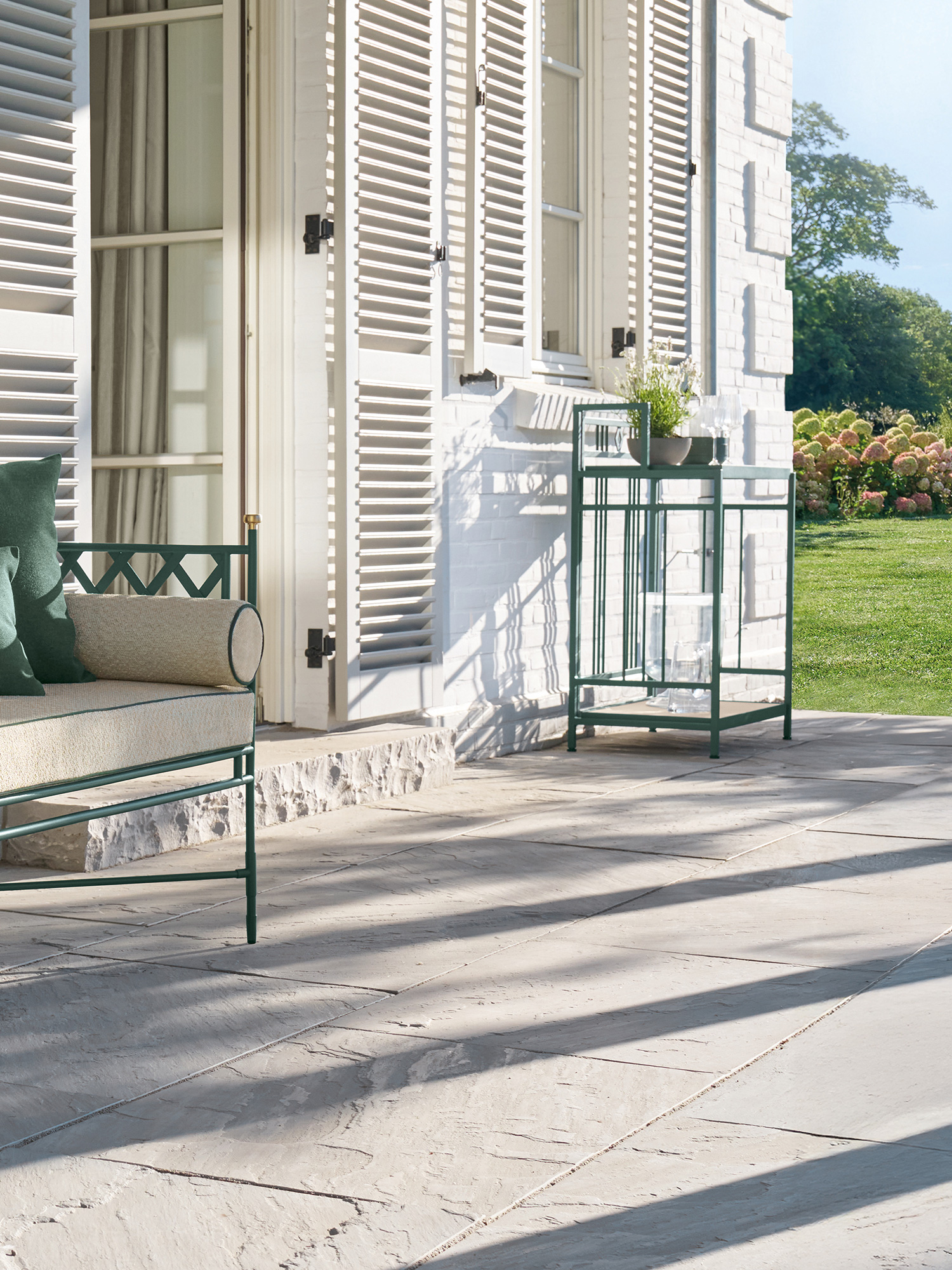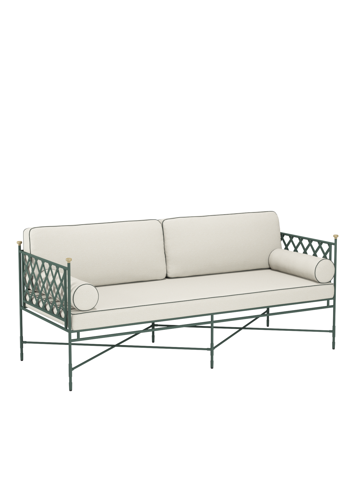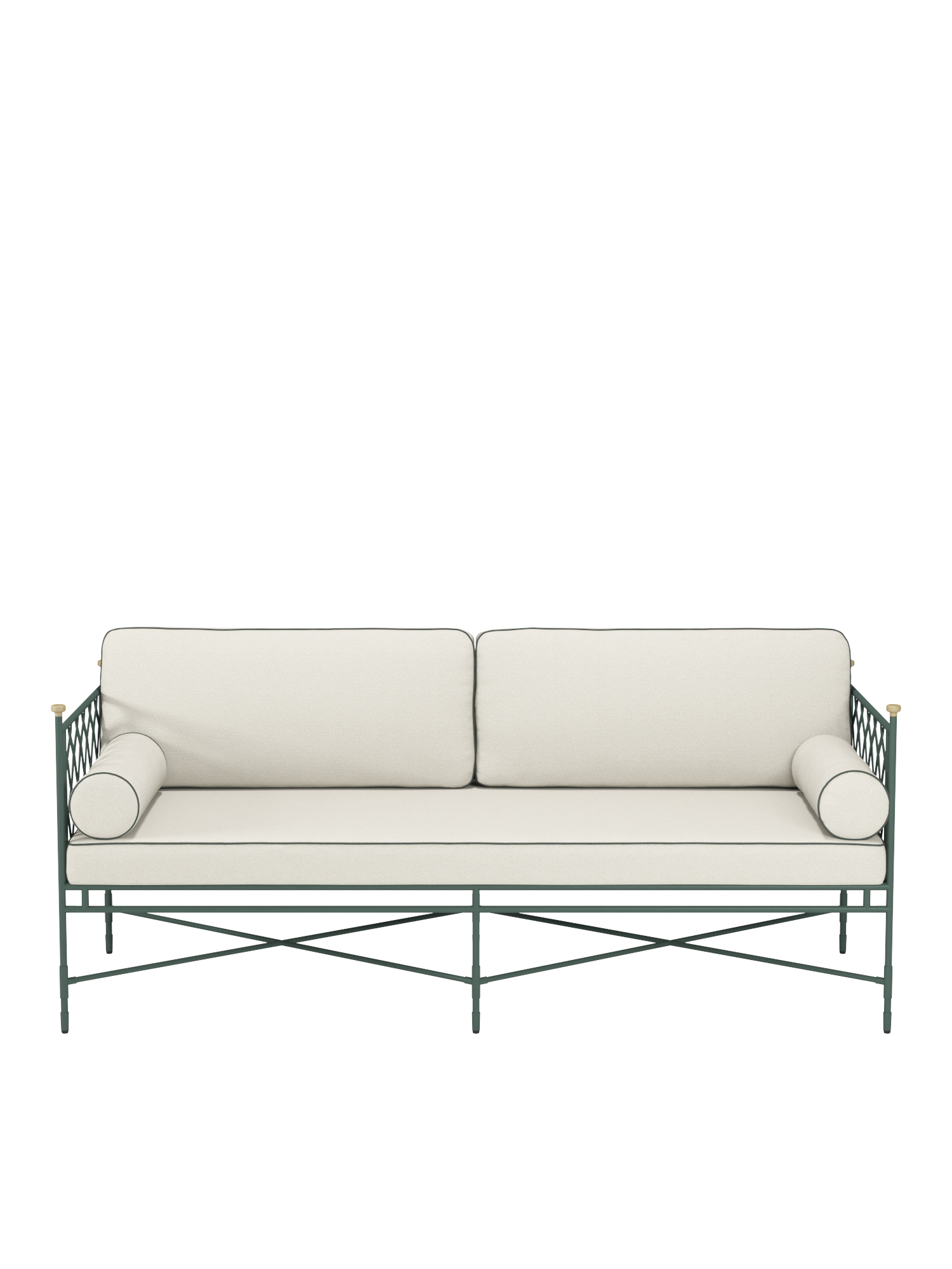 Die zum Lieferumfang gehörenden Auflagen im Dessin Limestone/Diopsid zeichnen sich durch Keder aus, die mit dem Grünton der Pulverbeschichtung harmonieren. Wer sich bequem zurücklehnen möchte, greift auf passende Dekokissen in den Maßen 30 x 50 oder 50 x 50 zurück.
