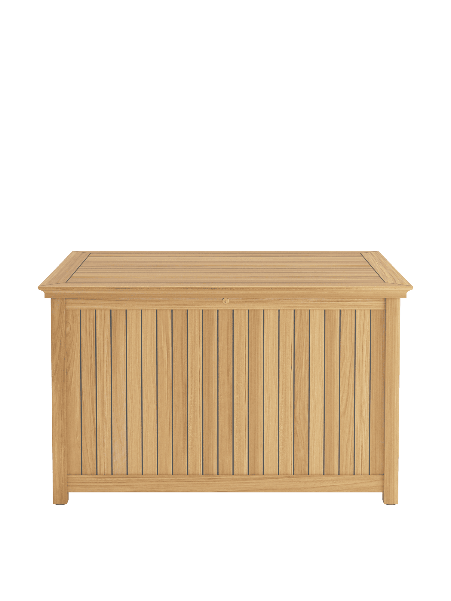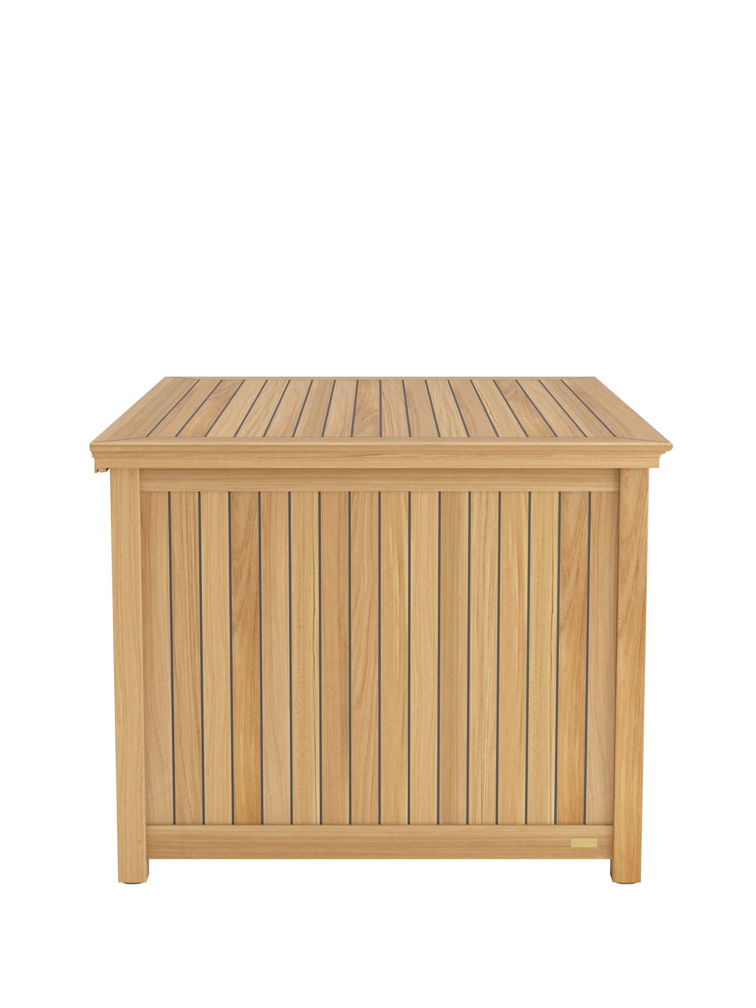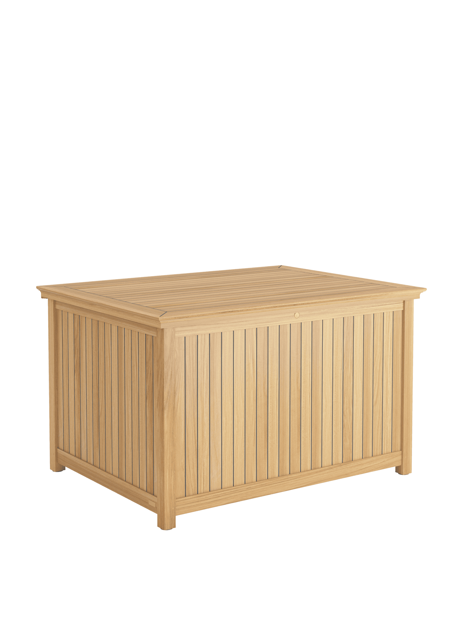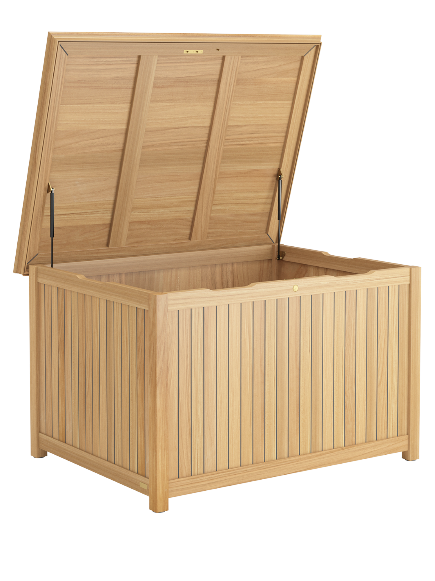 Die Kissentruhen für die Auflagen der Garpa Gartenmöbel zeigen sich perfekt in Form und Funktion. Alle konstruktiven Bauteile sind aus massivem Teak. Die Seiten und der Deckel bestehen aus wetterfestem Schichtholz, das mit 2,5 mm starkem Teak furniert und wie die Decksplanken von Hochseeyachten verfugt ist. Schloss und Scharniere sind aus hochwertigem Messing.