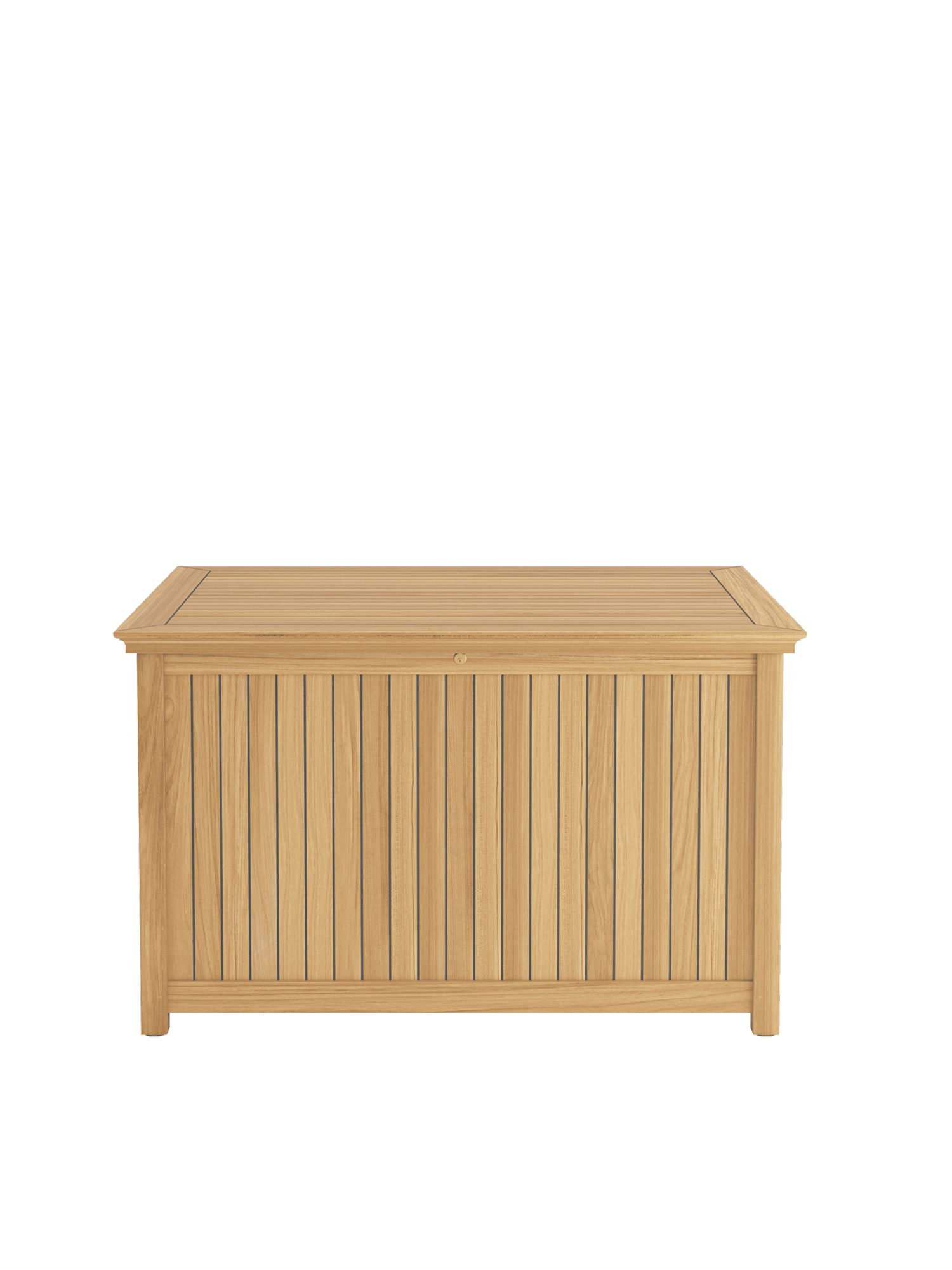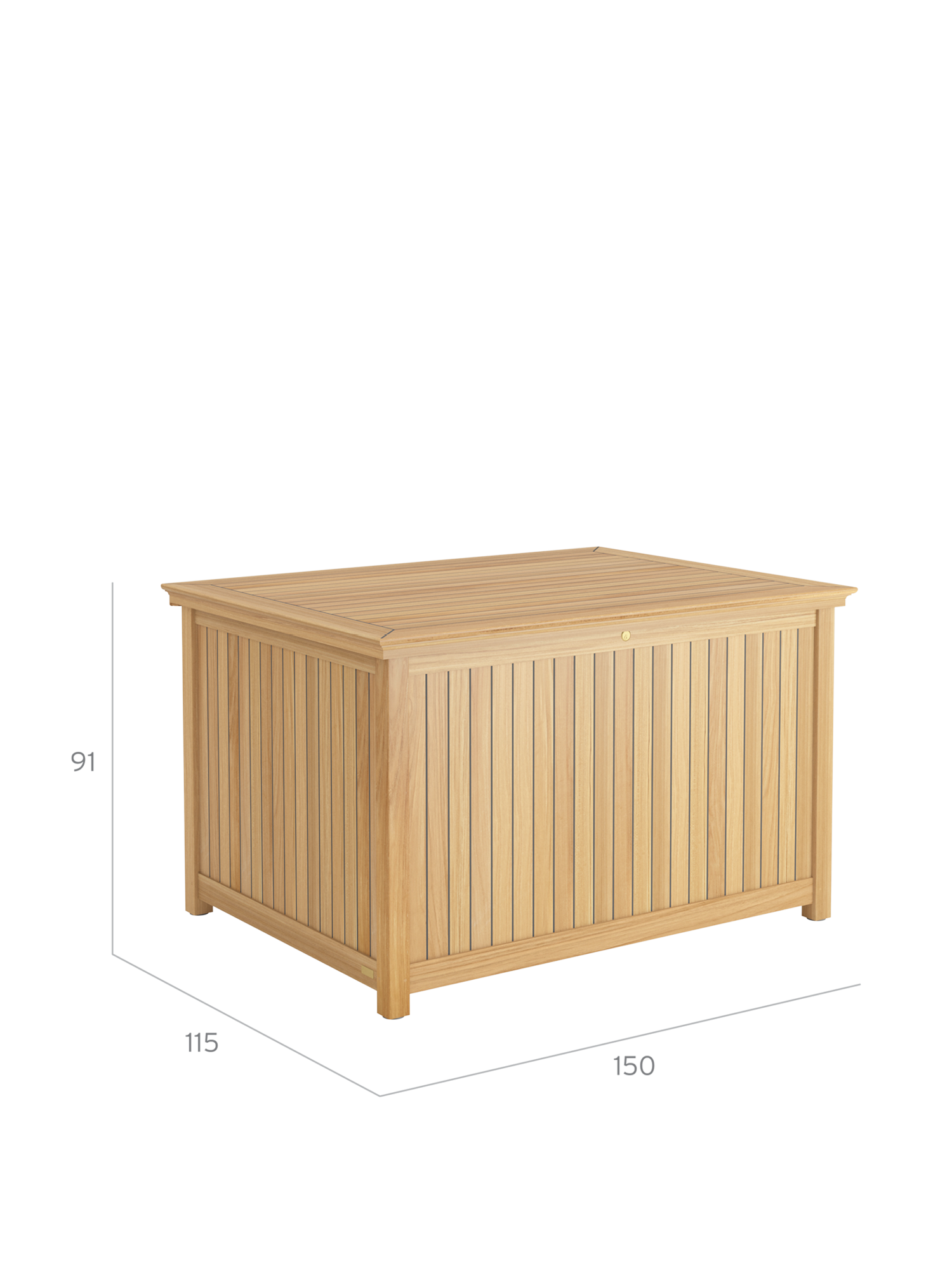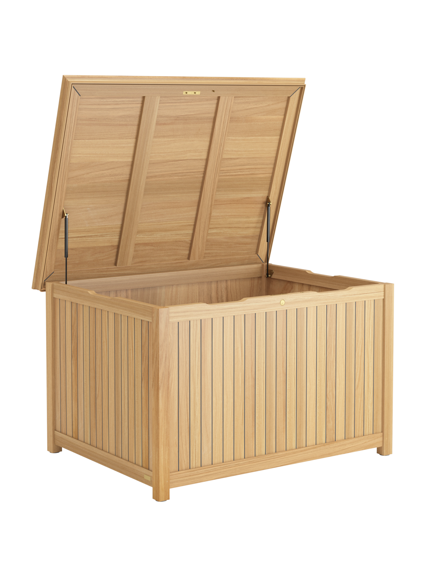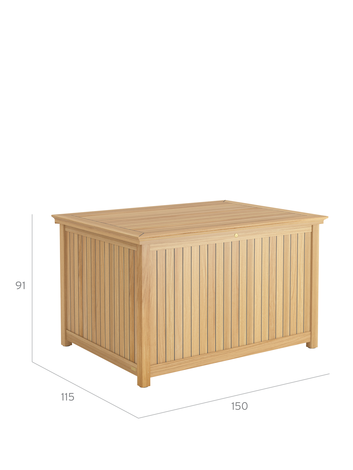 Die Kissentruhen für die Auflagen der Garpa Gartenmöbel zeigen sich perfekt in Form und Funktion. Alle konstruktiven Bauteile sind aus massivem Teak. Die Seiten und der Deckel bestehen aus wetterfestem Schichtholz, das mit 2,5 mm starkem Teak furniert und wie die Decksplanken von Hochseeyachten verfugt ist. Schloss und Scharniere sind aus hochwertigem Messing.