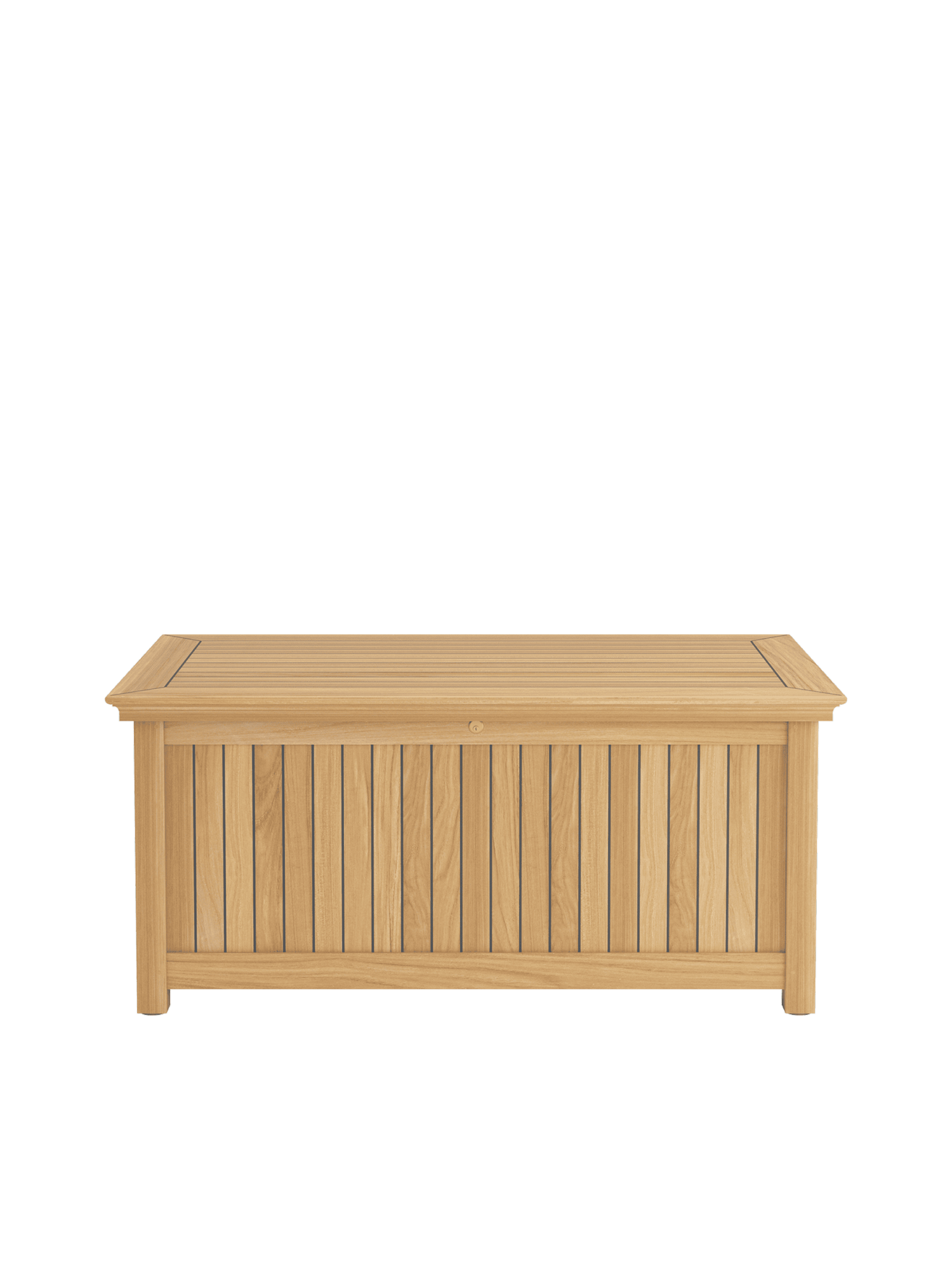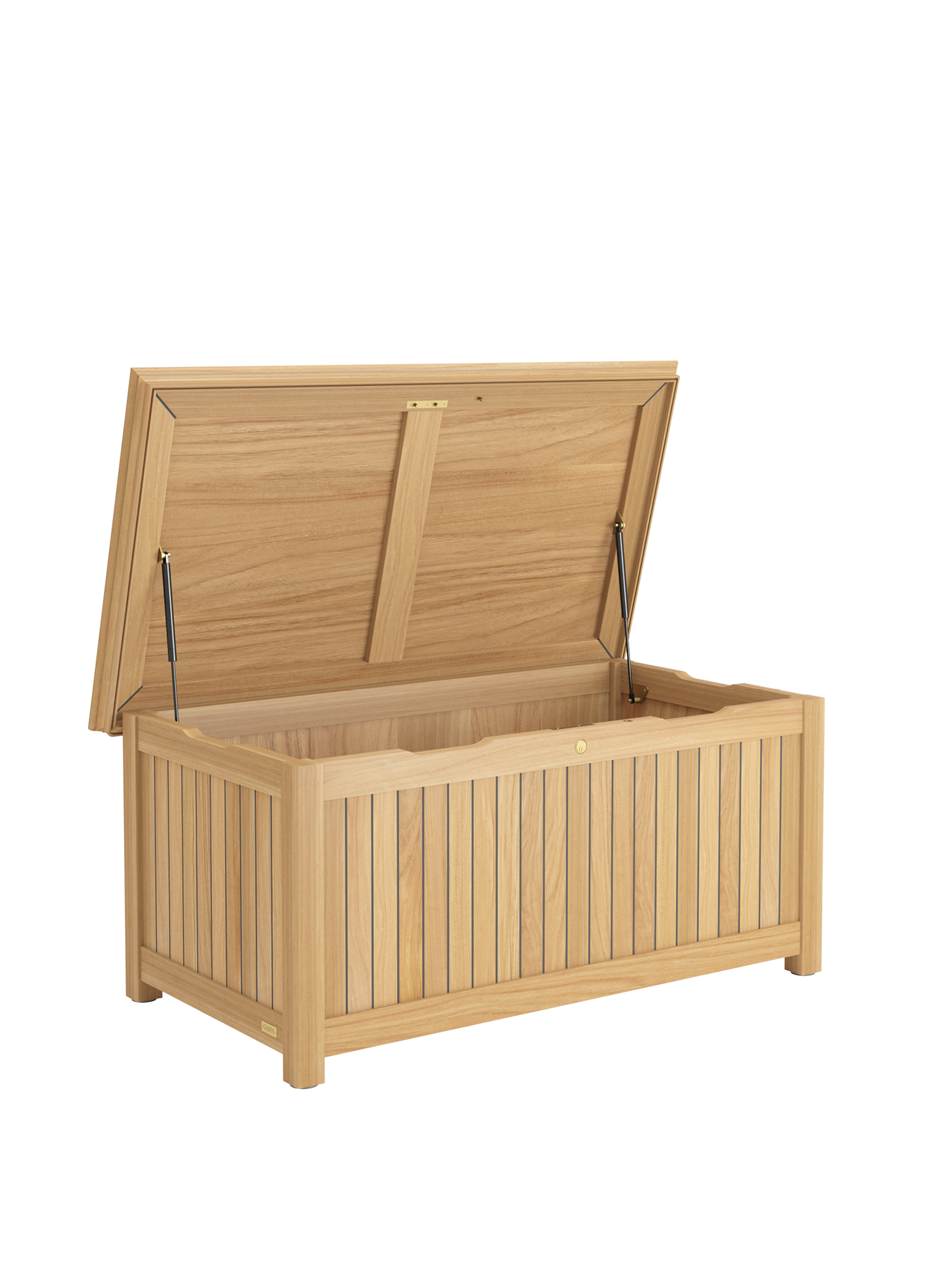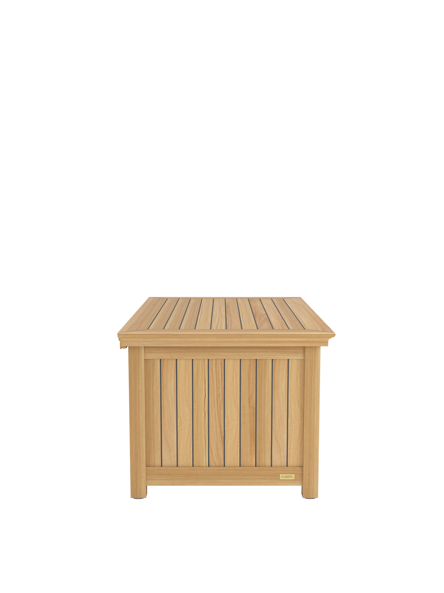 Die Kissentruhen für die Auflagen der Garpa Gartenmöbel zeigen sich perfekt in Form und Funktion. Alle konstruktiven Bauteile sind aus massivem Teak. Die Seiten und der Deckel bestehen aus wetterfestem Schichtholz, das mit 2,5 mm starkem Teak furniert und wie die Decksplanken von Hochseeyachten verfugt ist. Schloss und Scharniere sind aus hochwertigem Messing.