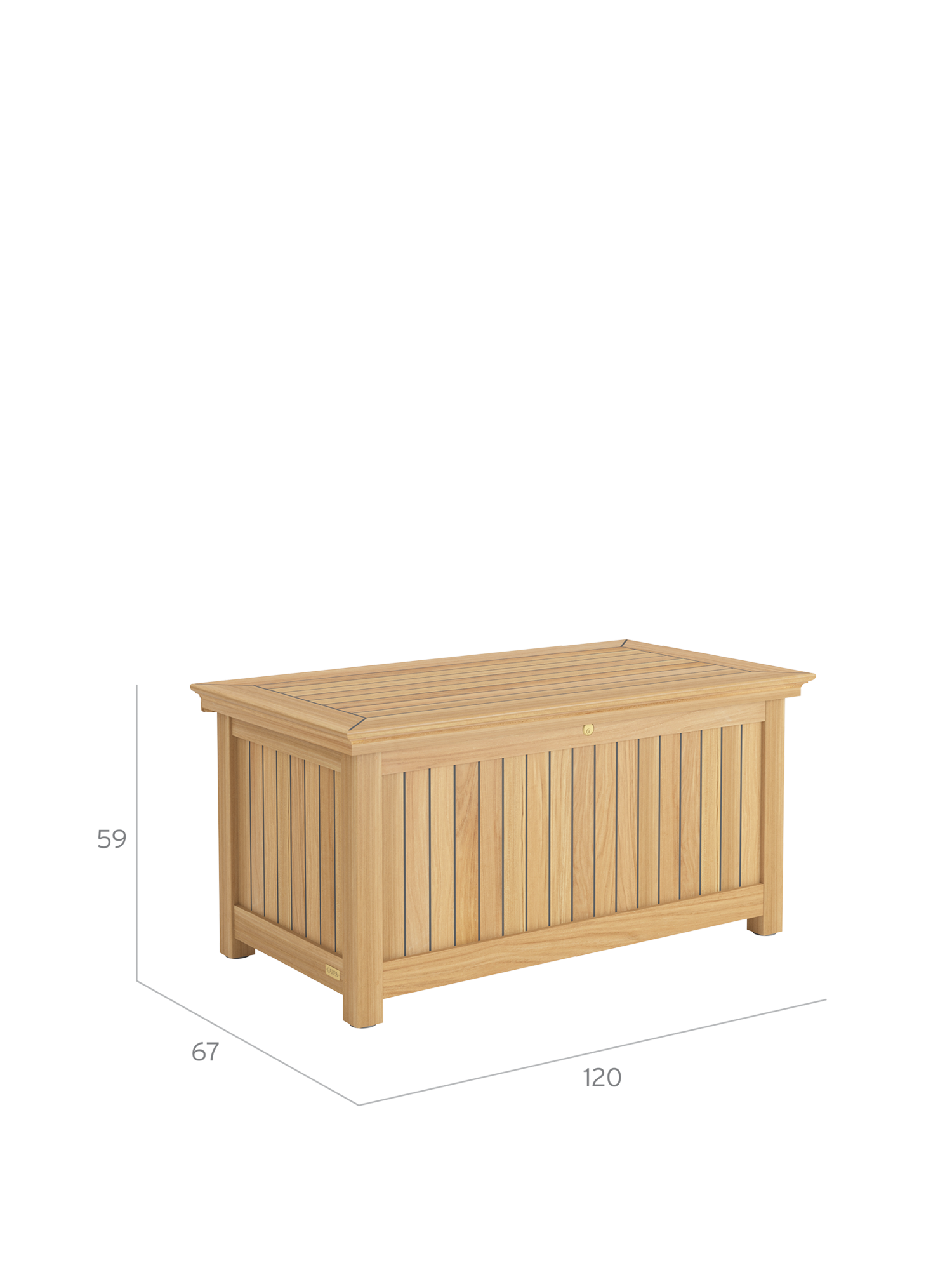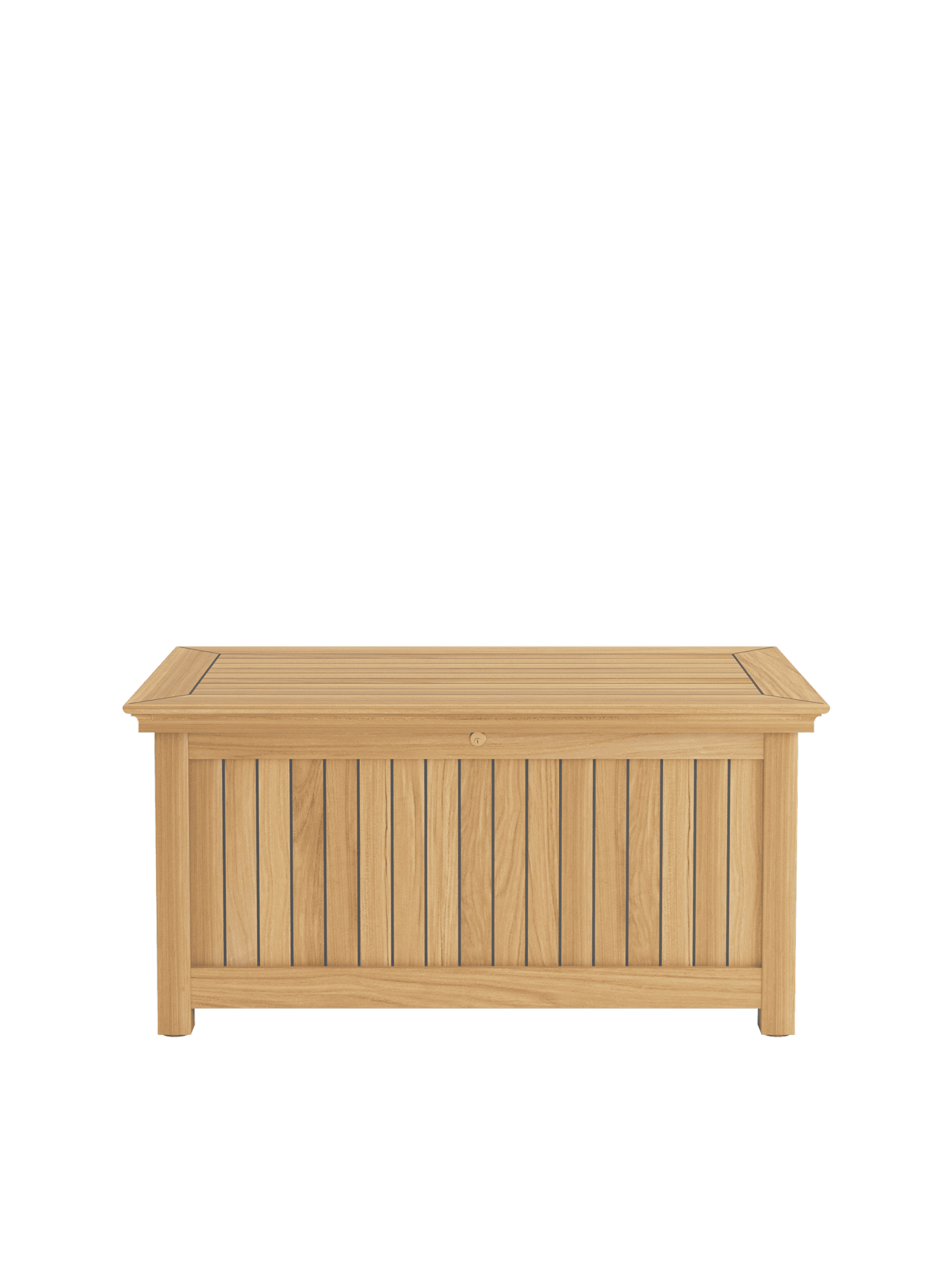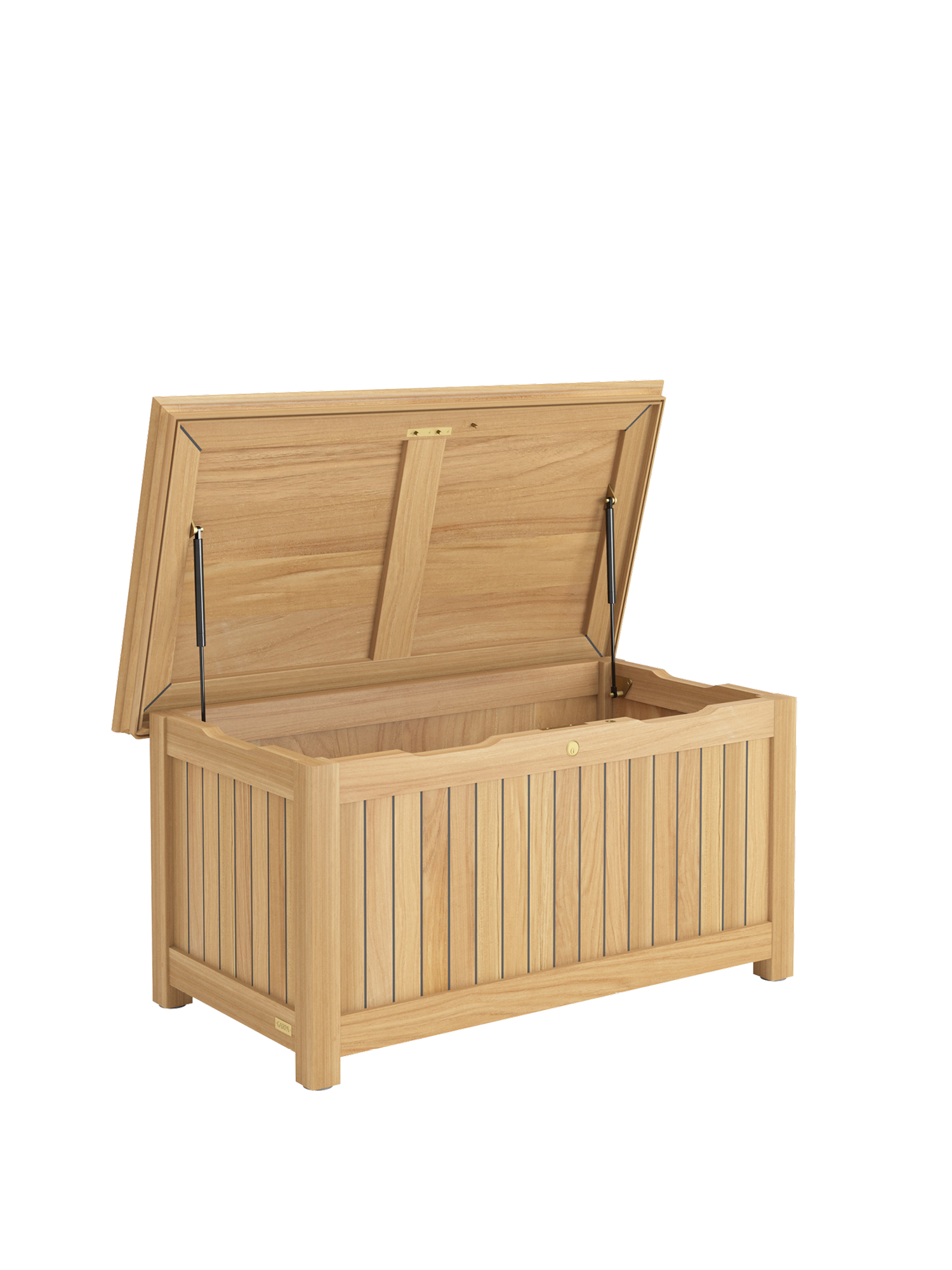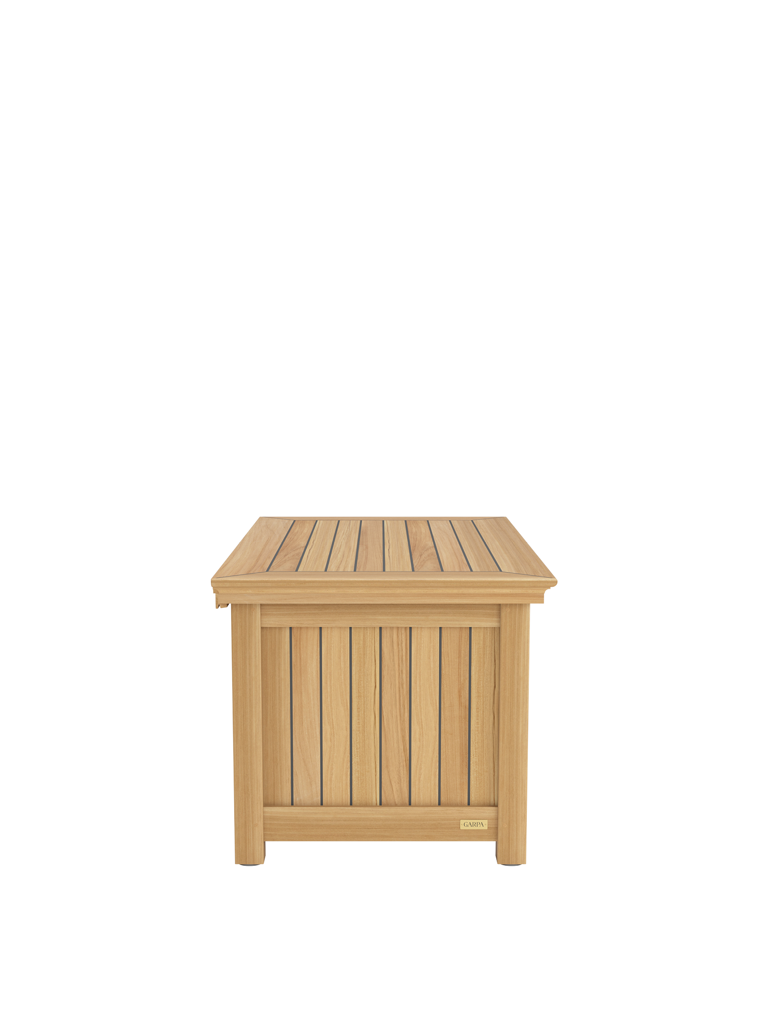 Die Kissentruhen für die Auflagen der Garpa Gartenmöbel zeigen sich perfekt in Form und Funktion. Alle konstruktiven Bauteile sind aus massivem Teak. Die Seiten und der Deckel bestehen aus wetterfestem Schichtholz, das mit 2,5 mm starkem Teak furniert und wie die Decksplanken von Hochseeyachten verfugt ist. Schloss und Scharniere sind aus hochwertigem Messing.