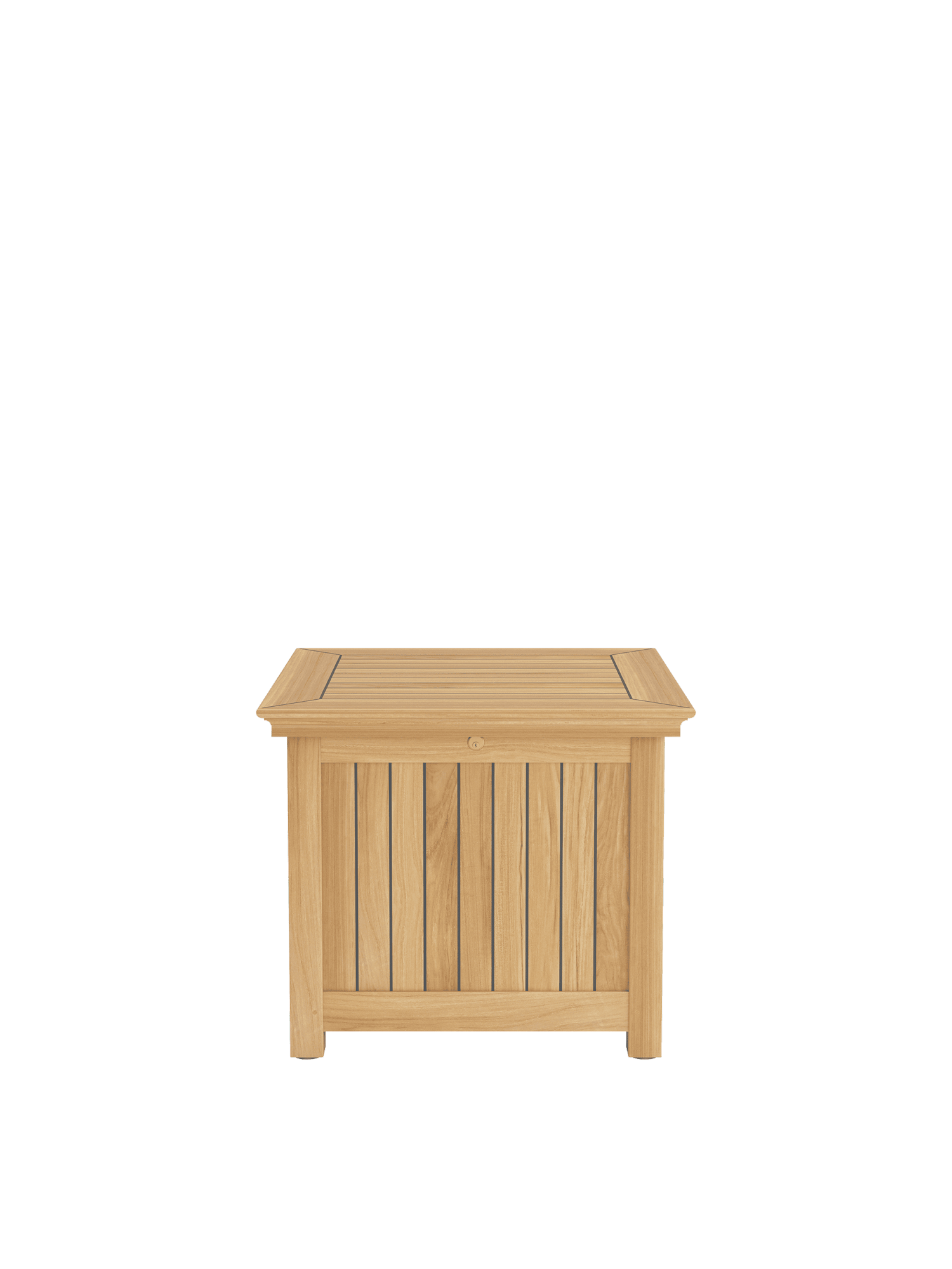 Die quadratische Kissentruhe im Format S bietet Platz für Auflagen von bis zu sechs Stühlen. Innen