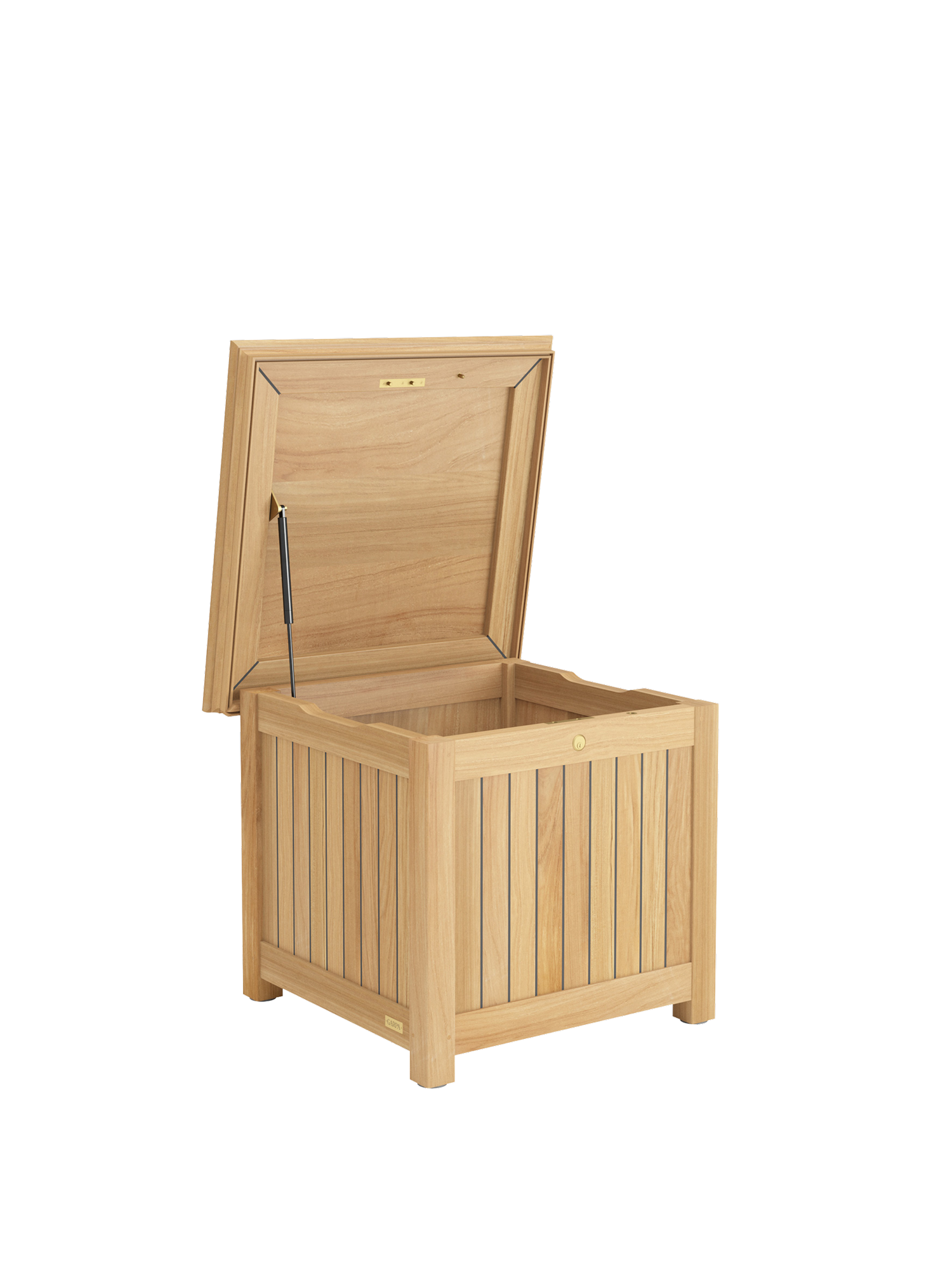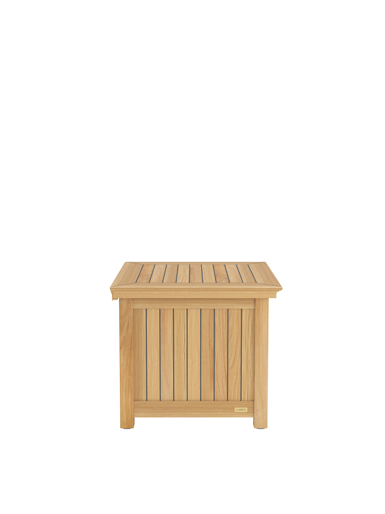 Die Kissentruhen für die Auflagen der Garpa Gartenmöbel zeigen sich perfekt in Form und Funktion. Alle konstruktiven Bauteile sind aus massivem Teak. Die Seiten und der Deckel bestehen aus wetterfestem Schichtholz, das mit 2,5 mm starkem Teak furniert und wie die Decksplanken von Hochseeyachten verfugt ist. Schloss und Scharniere sind aus hochwertigem Messing.