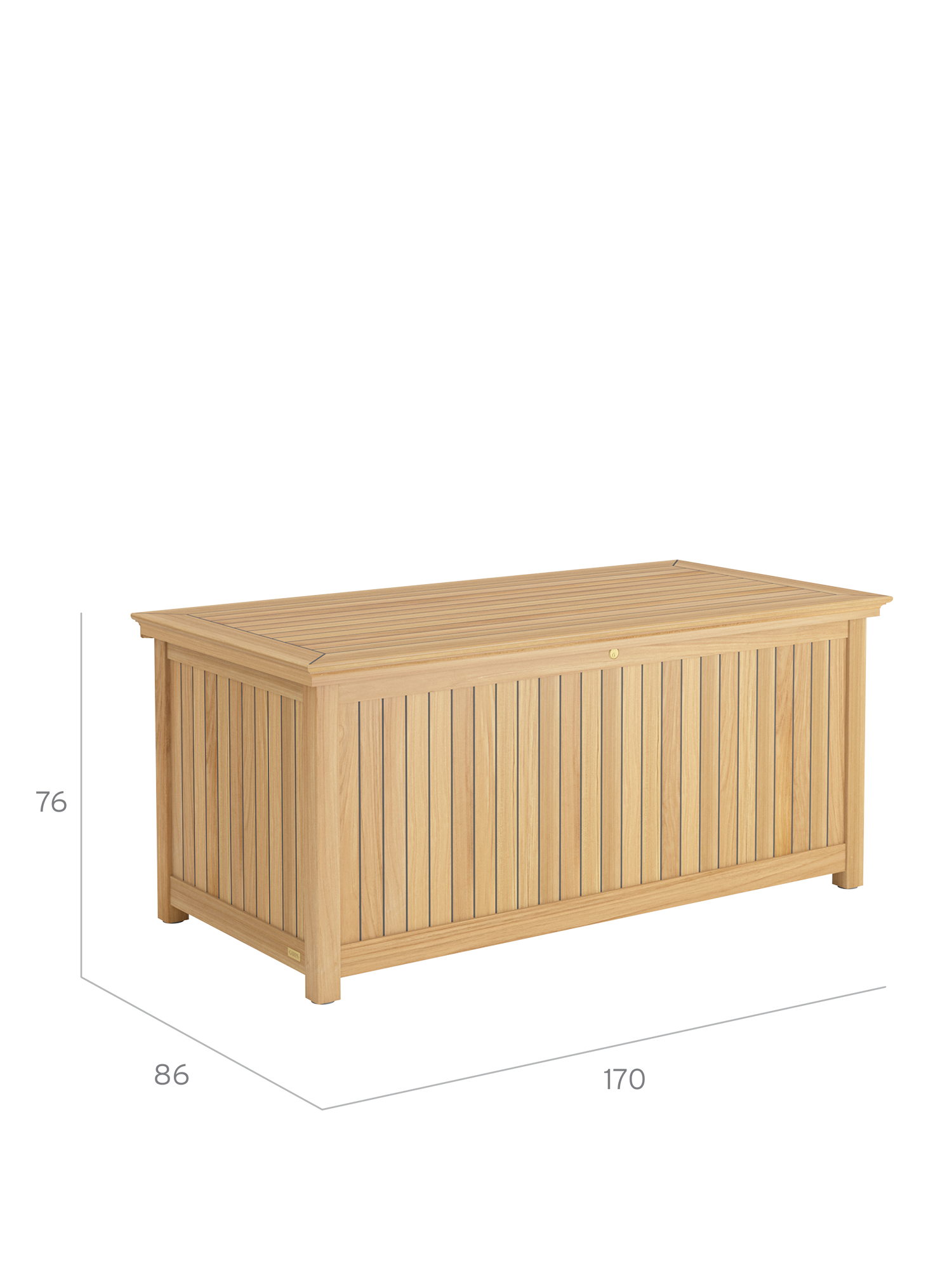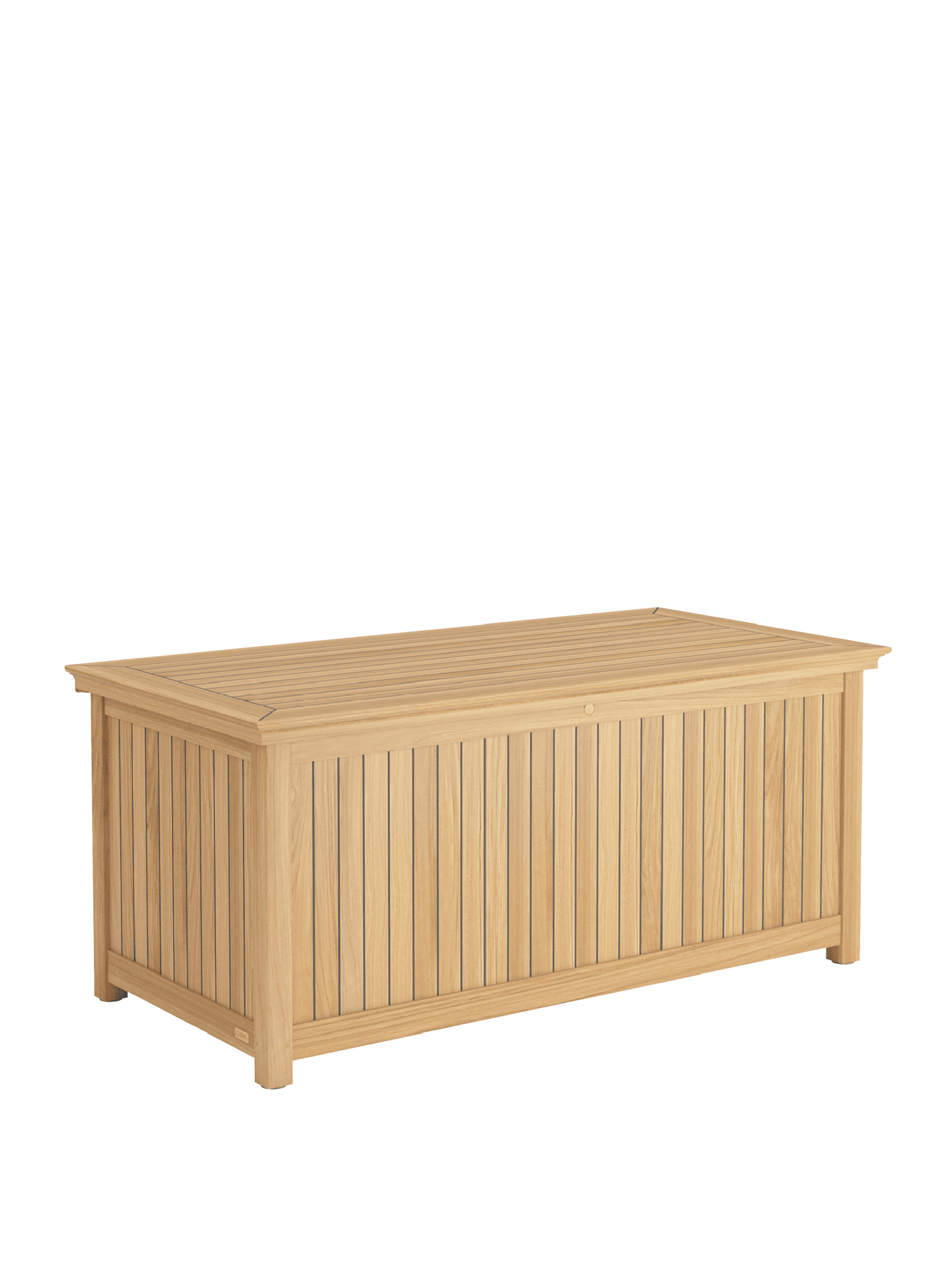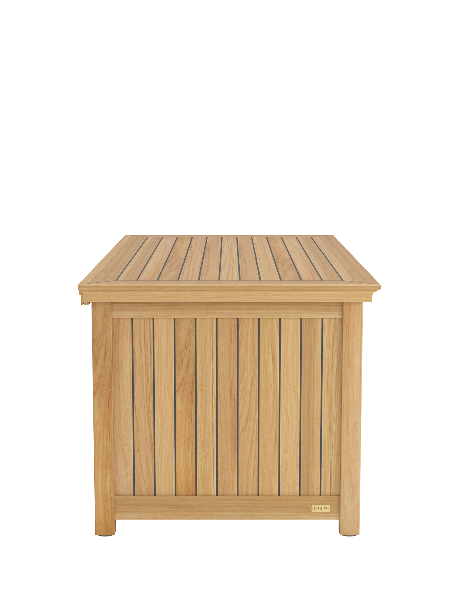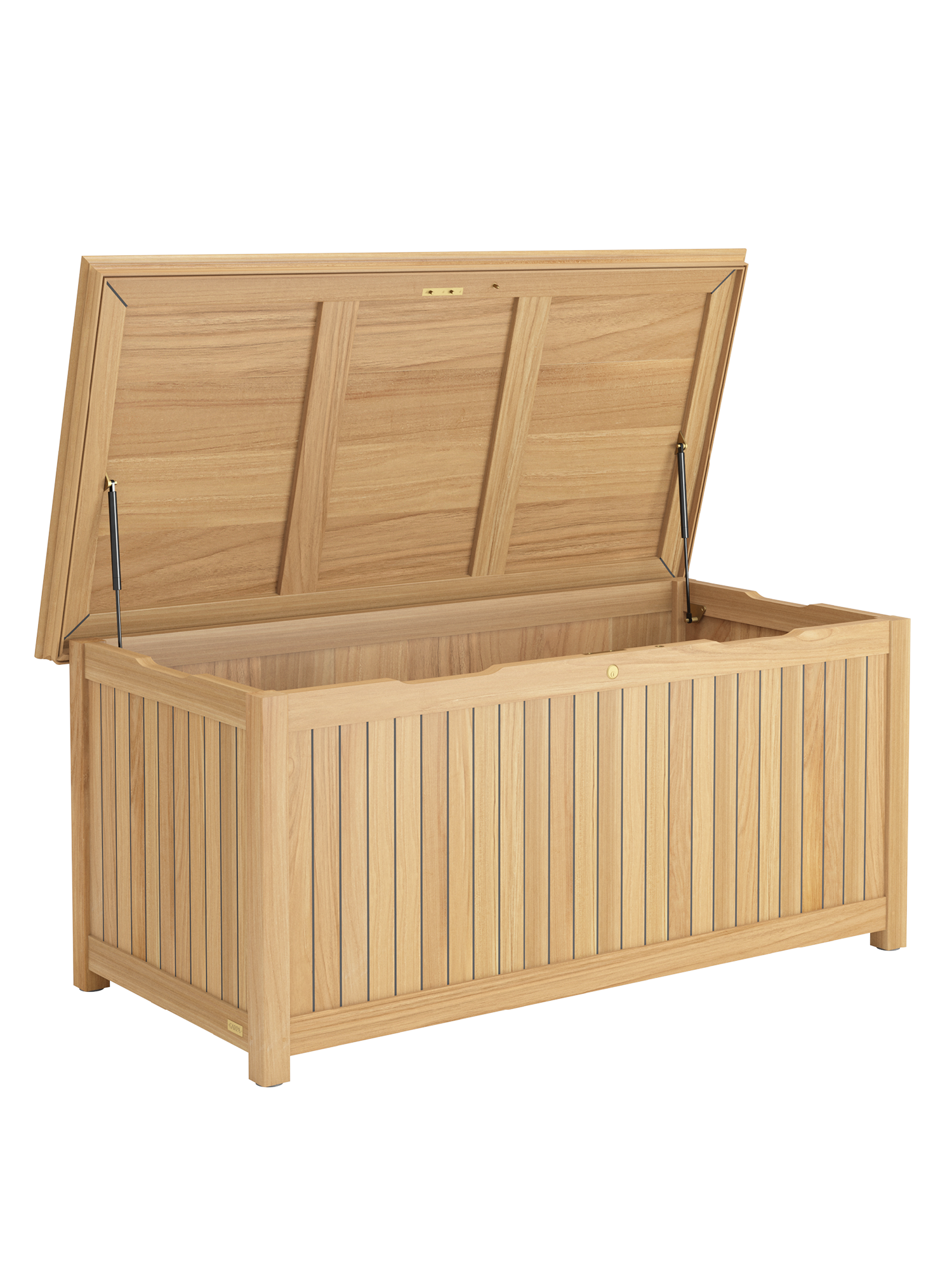 Die Kissentruhen für die Auflagen der Garpa Gartenmöbel zeigen sich perfekt in Form und Funktion. Alle konstruktiven Bauteile sind aus massivem Teak. Die Seiten und der Deckel bestehen aus wetterfestem Schichtholz, das mit 2,5 mm starkem Teak furniert und wie die Decksplanken von Hochseeyachten verfugt ist. Schloss und Scharniere sind aus hochwertigem Messing.