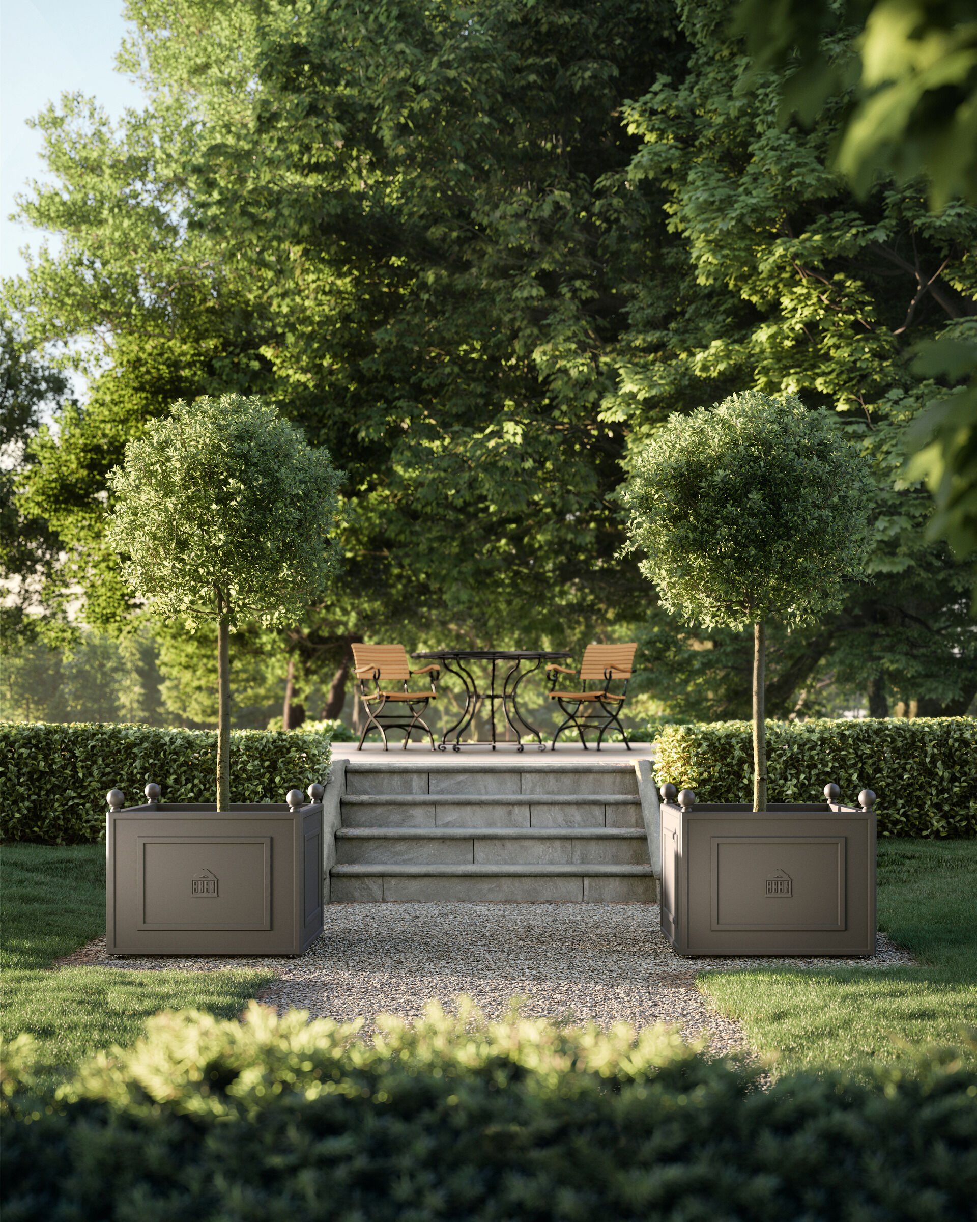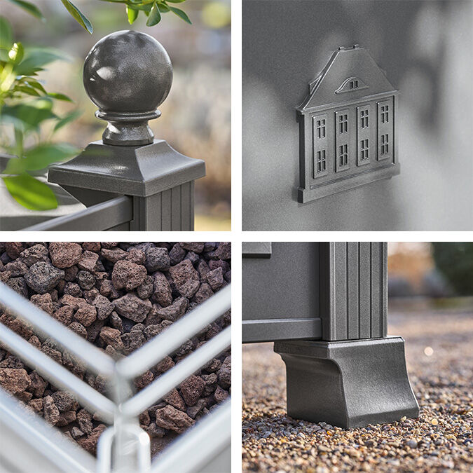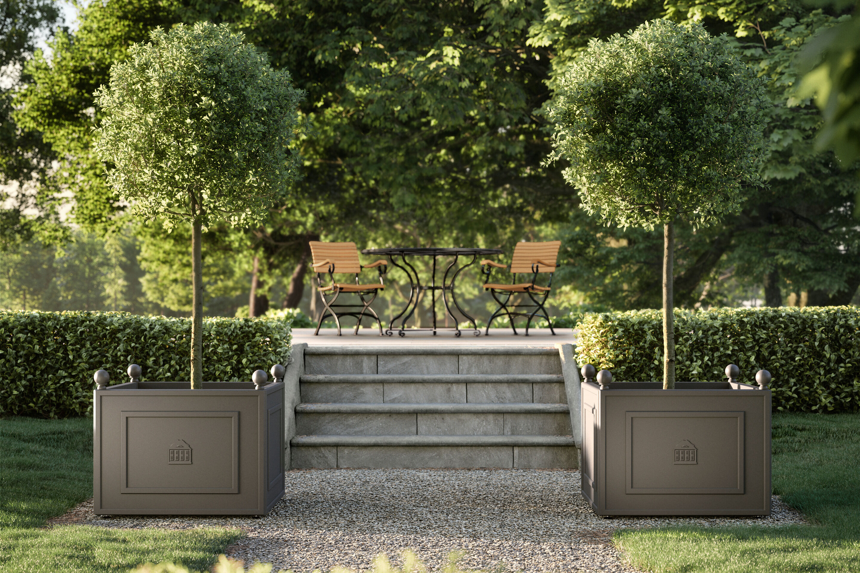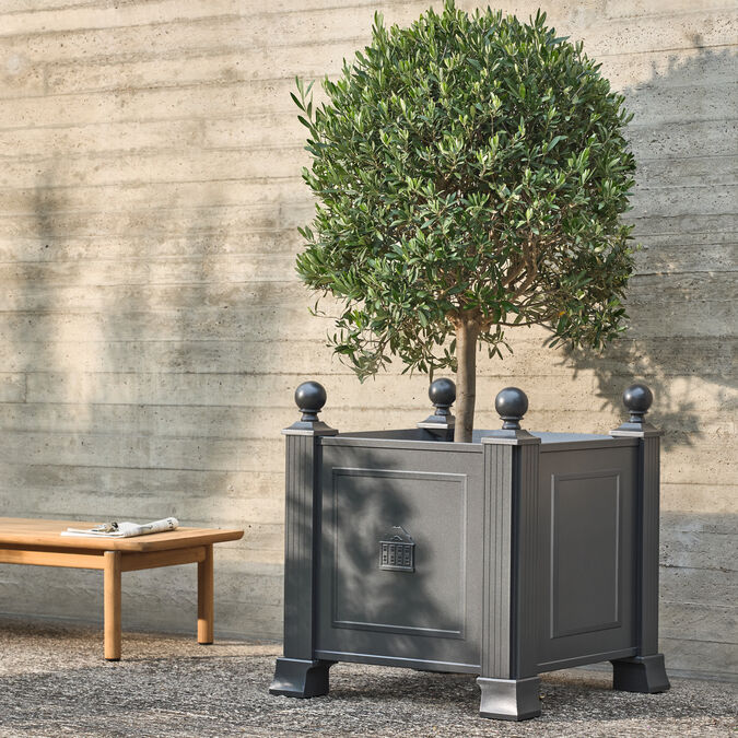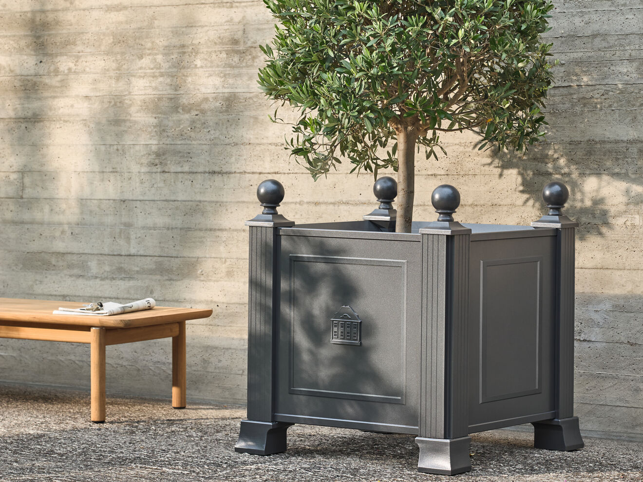 Souveräner Auftritt: Mit Noblesse und überzeugendem Dekor setzen die stattlichen Gefäße aus pulverbeschichtetem Aluminium wirkungsvolle Akzente in klassisch geprägten Gartenräumen. Die von Kugeln gekrönten und von starken Füßen getragenen säulenartigen Eckelemente demonstrieren Standfestigkeit. Ein filigranes Hochrelief auf der Vorderseite ist das stilisierte Abbild des Garpa Stammhauses.