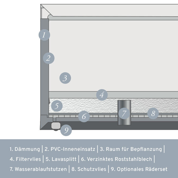 - Ein PVC-Inneneinsatz mit eingearbeitetem Ablaufsystem reguliert den Wasserstand im Kübel auf maximal 2 cm Höhe. (2)