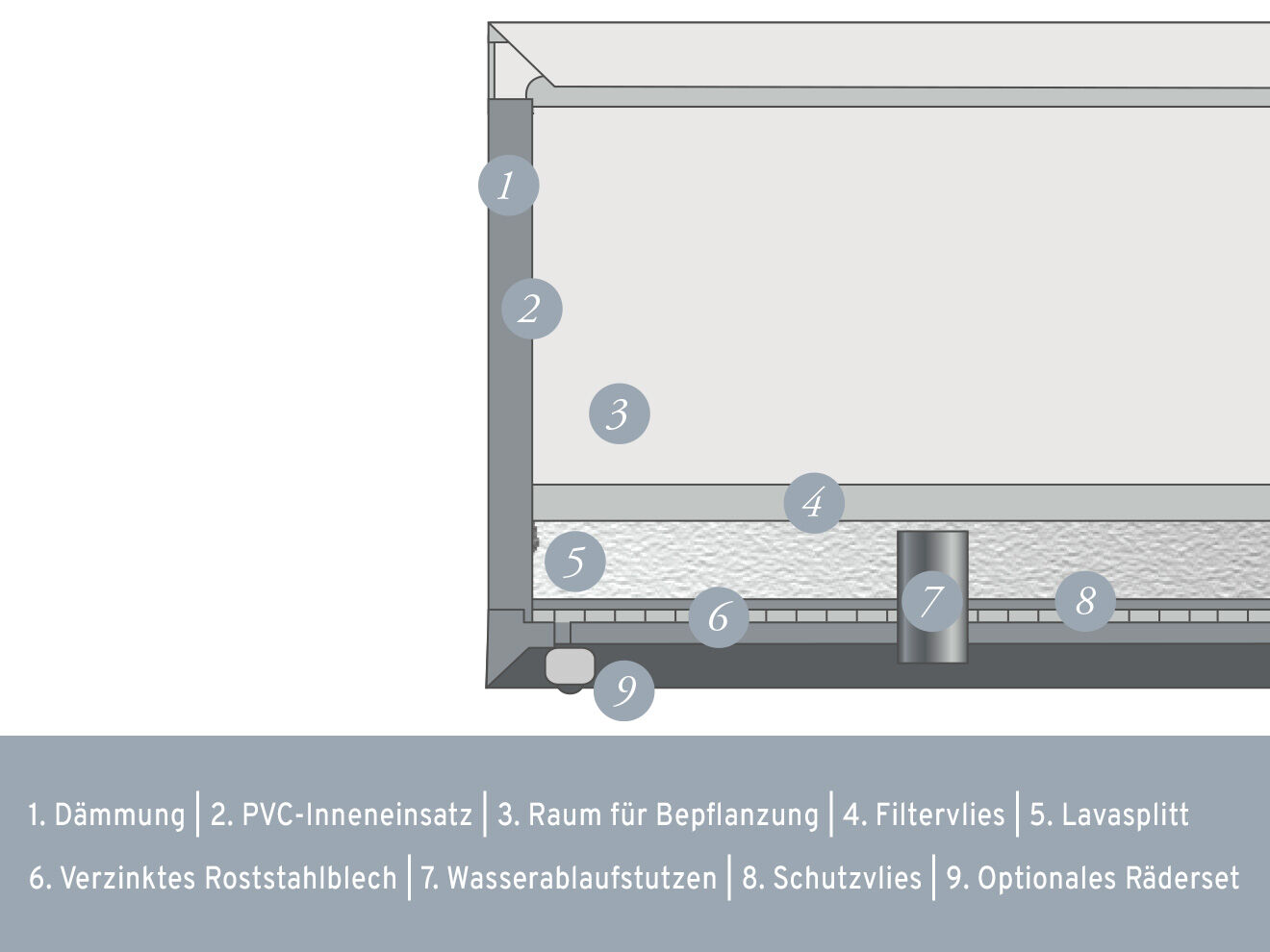 - Die Drainageschicht aus Lavasteinen und Filtervlies sowie das Wasserablaufsystem sind in den Boden der Gefäße integriert. (4-5)