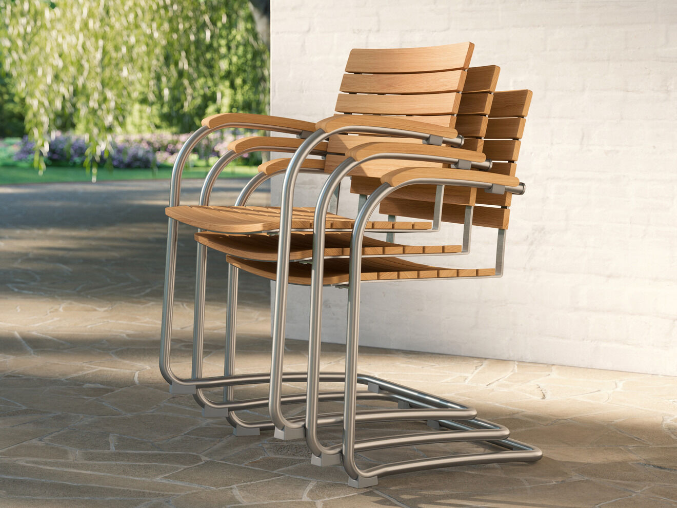 Der Freischwinger holt die unverkennbare Bauhaus-Ästhetik hinaus ins Freie, direkt vor die Sonnenseite des Hauses. Wer auf ihm Platz nimmt, genießt bequeme Beinfreiheit – und ein Gefühl des Schwebens, ohne die Bodenhaftung zu verlieren. Alles fördert die Entspannung: Die Teakholzleisten für Sitz und Rückenlehne sind nach den Konturen des Körpers modelliert, das Rohrgestell aus satiniertem Edelstahl federt stärkste Belastungen ab.